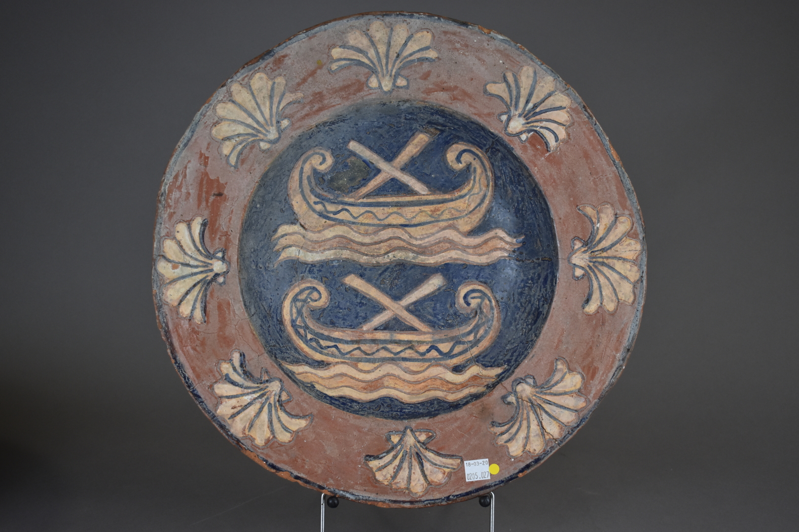 Plat circulaire en terre cuite rouge à décor en en bleu (deux fèles).