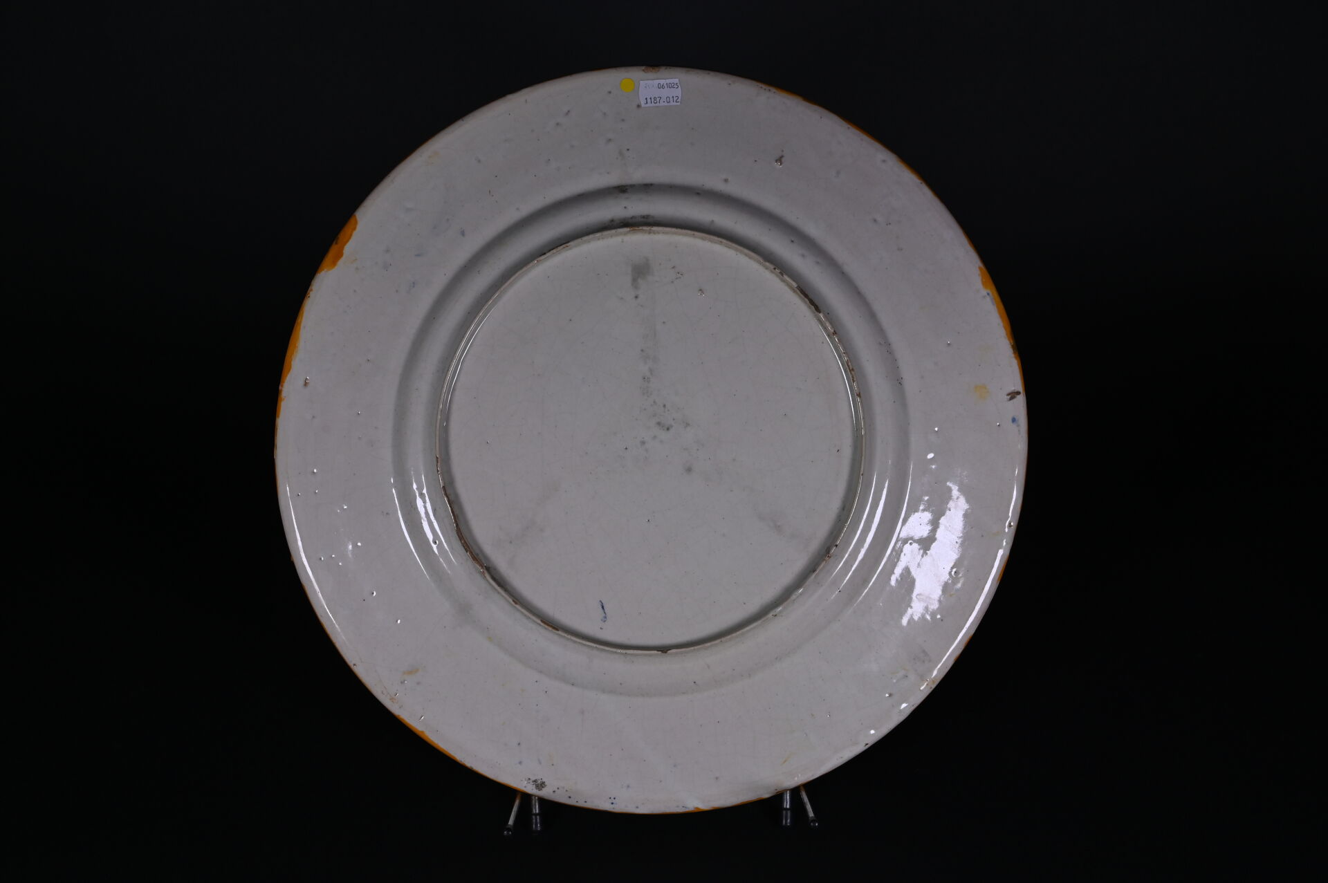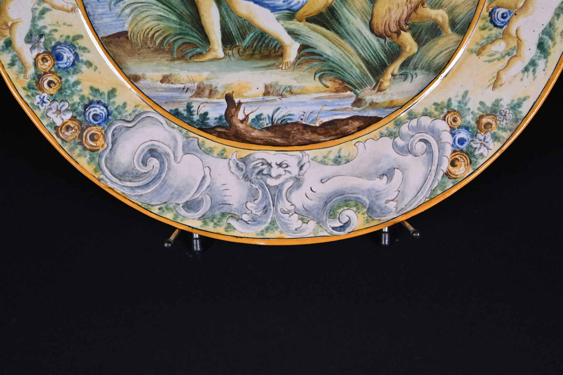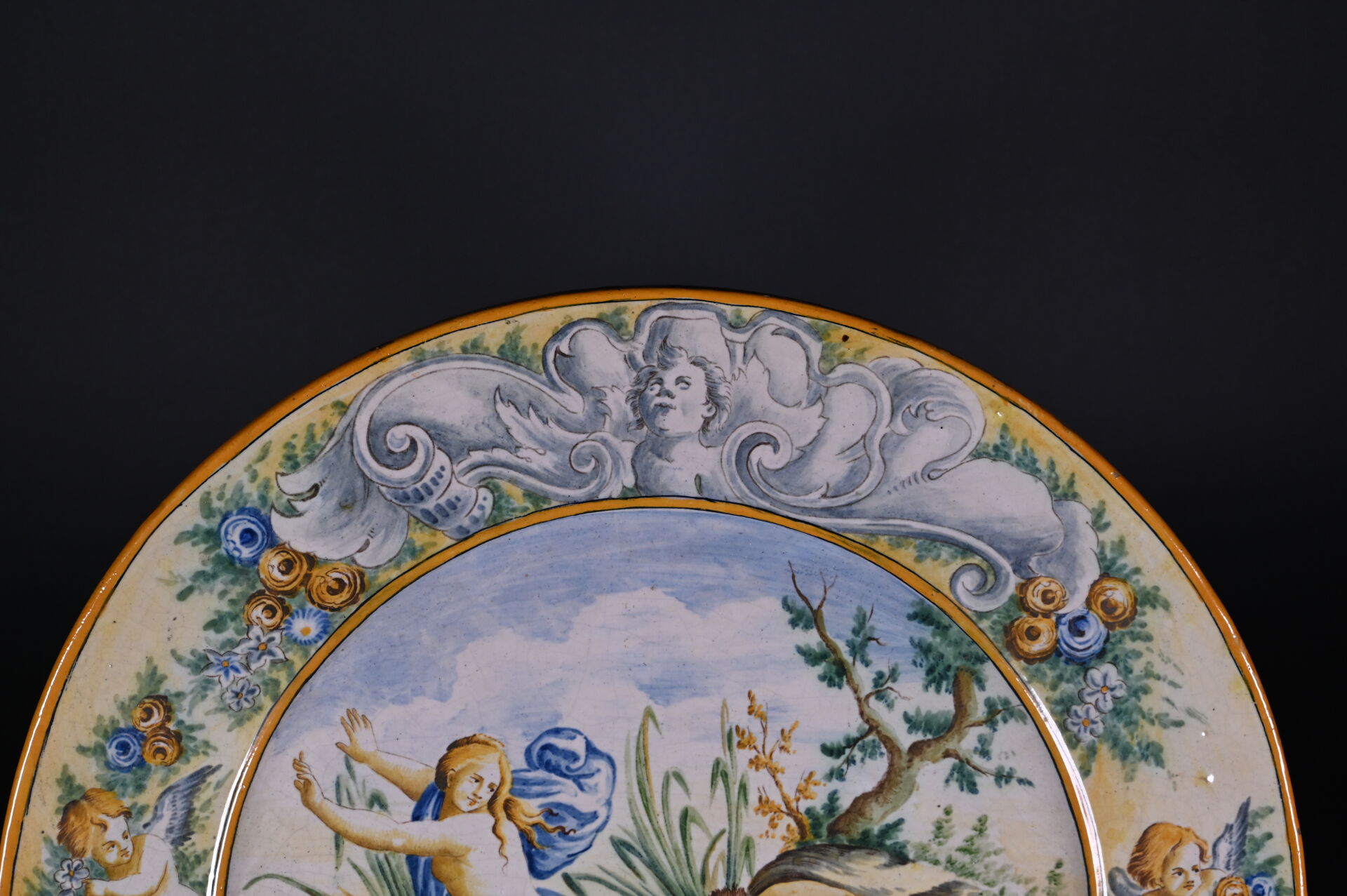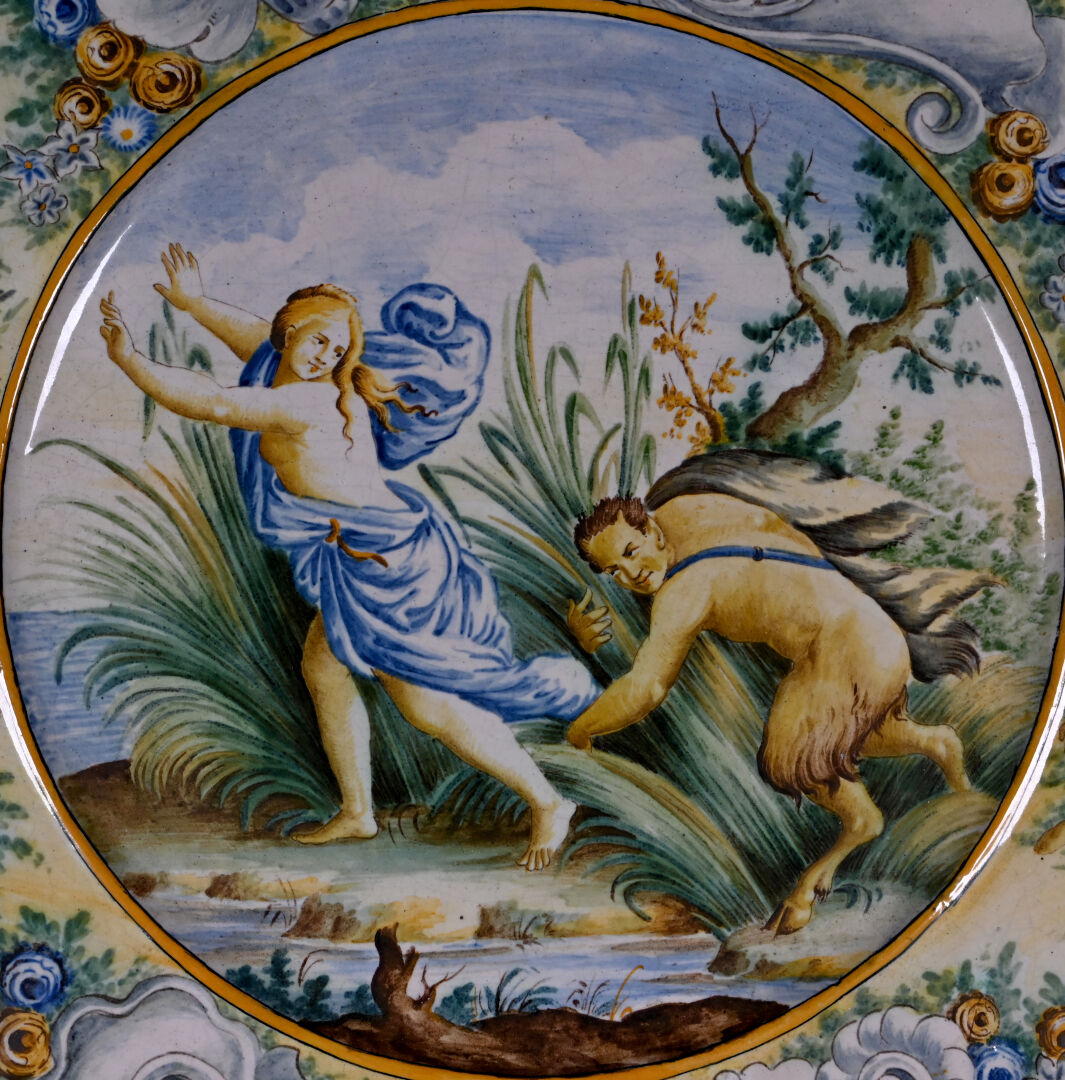 Plat en majolique à décor de grand feu, le bassin orné de Pan et Syrinx, et l’aile à décor d’angelots et fleurs. Travail italien, fin du XIXe ou début du XXe siècle. Diam. : 46 cm.