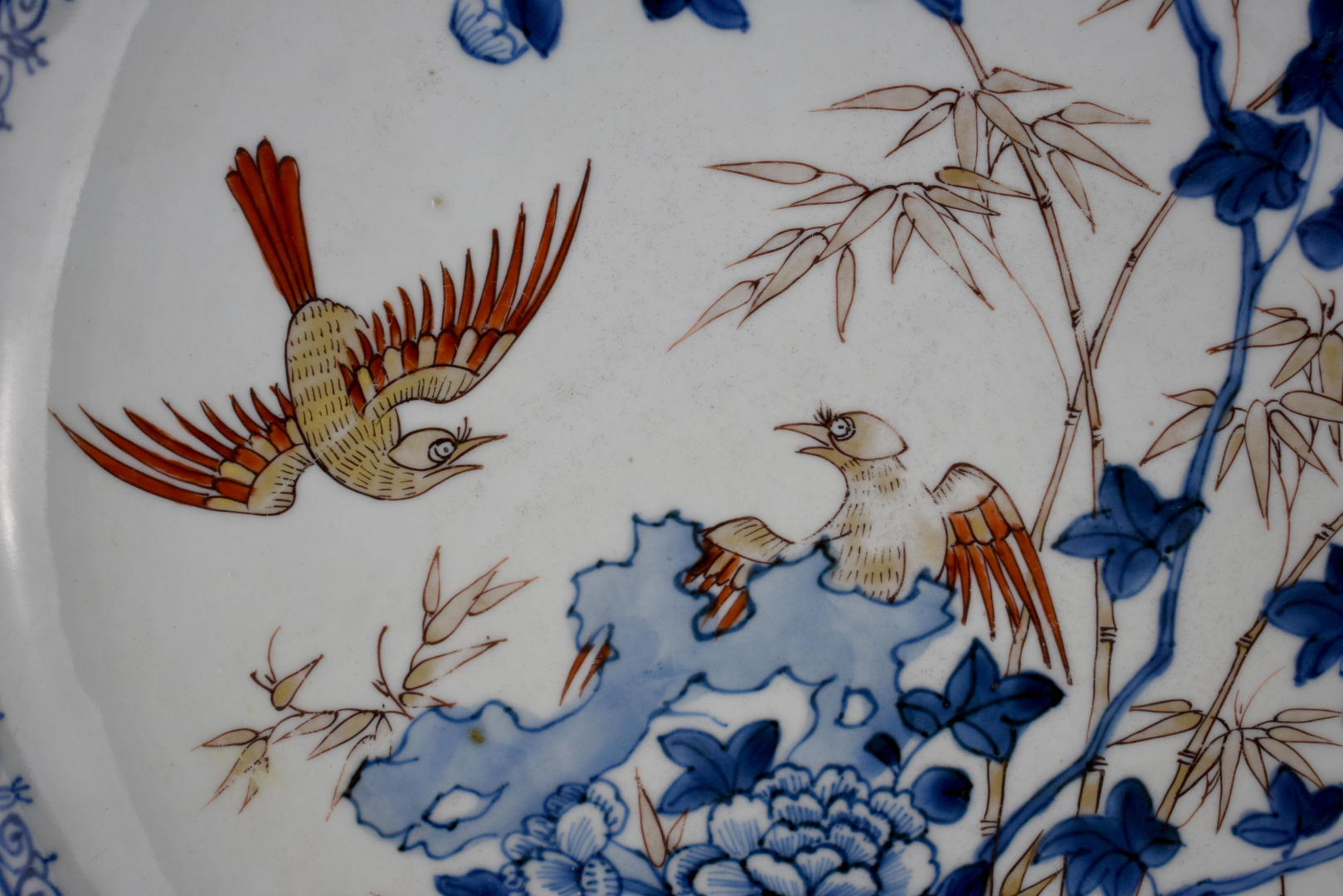 Plat en porcelaine à décor «Imari chinois» de couple de faisans près d’un pivoinier en fleurs et bambou (fèle et petits éclats). Chine, période Quienlong, XVIIIe siècle. Diam. : 38 cm.