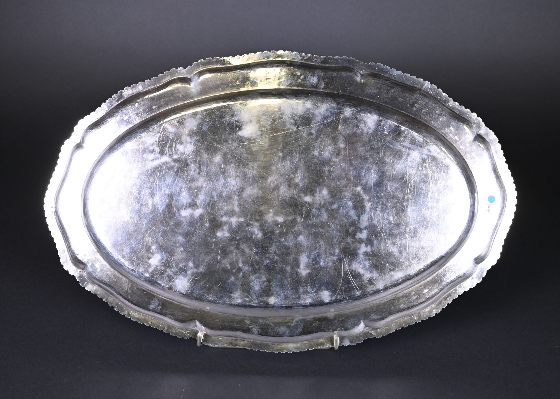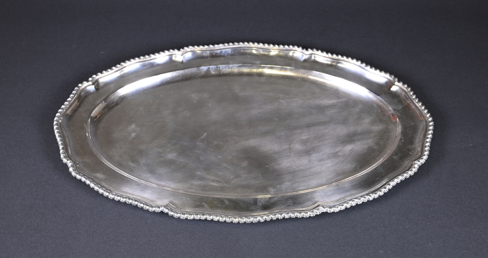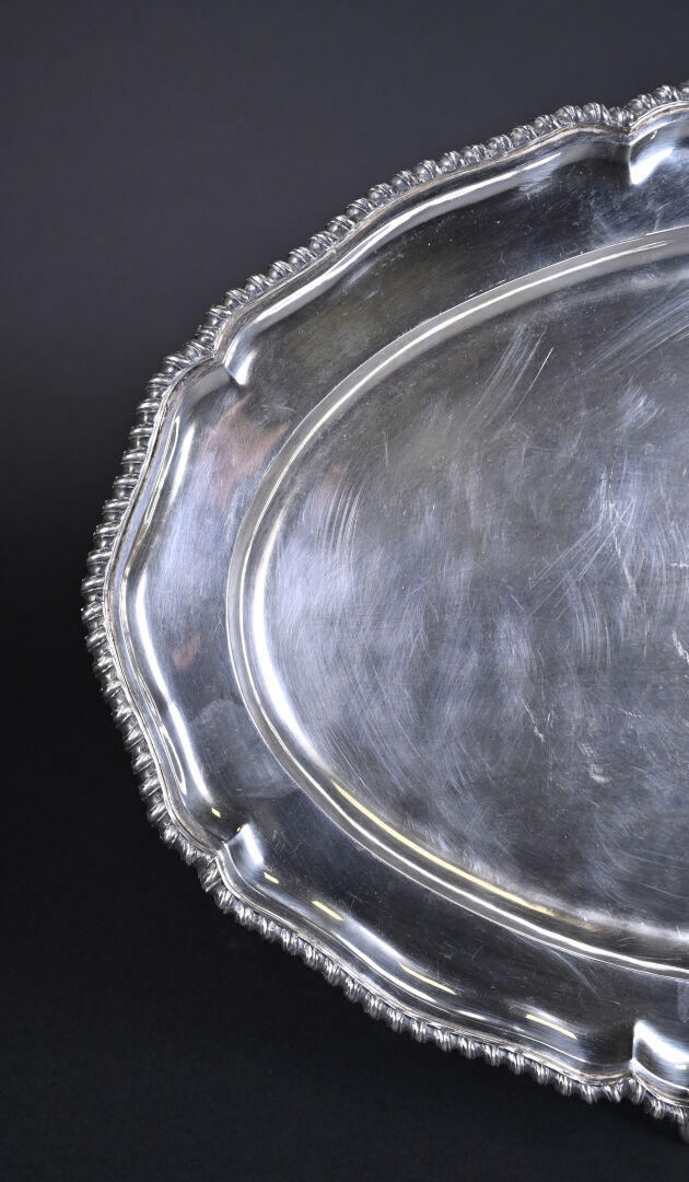 Plat ovale en argent 800/1000e, la bordure violonée à cannelures torses. Travail Allemand. 35 x 55 cm. Poids : 1556 g.