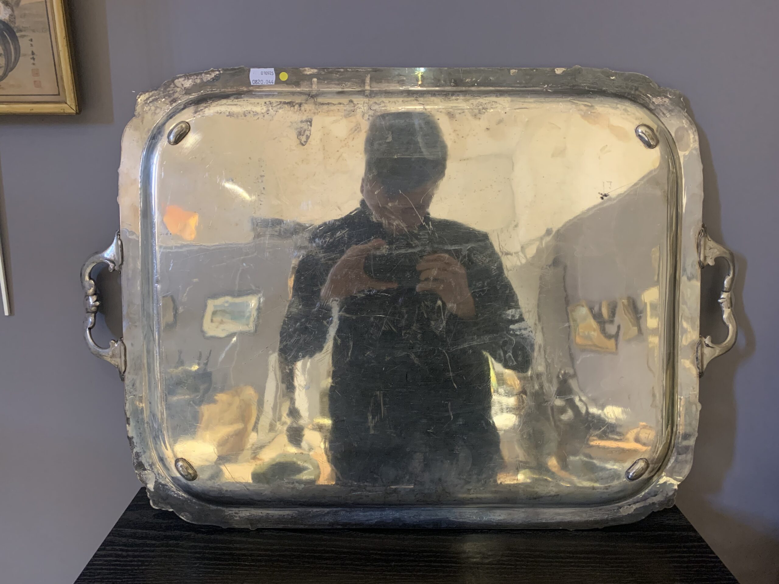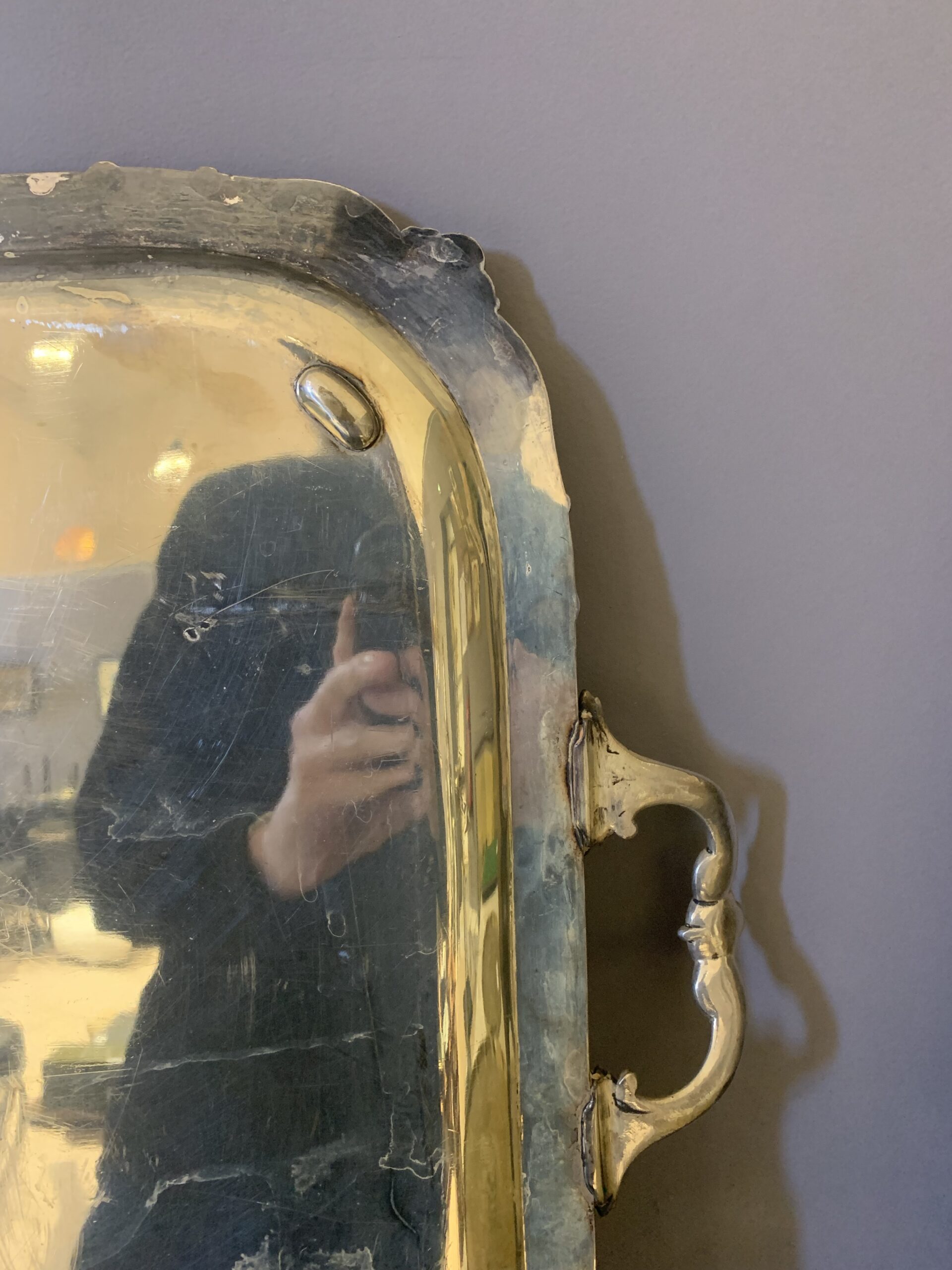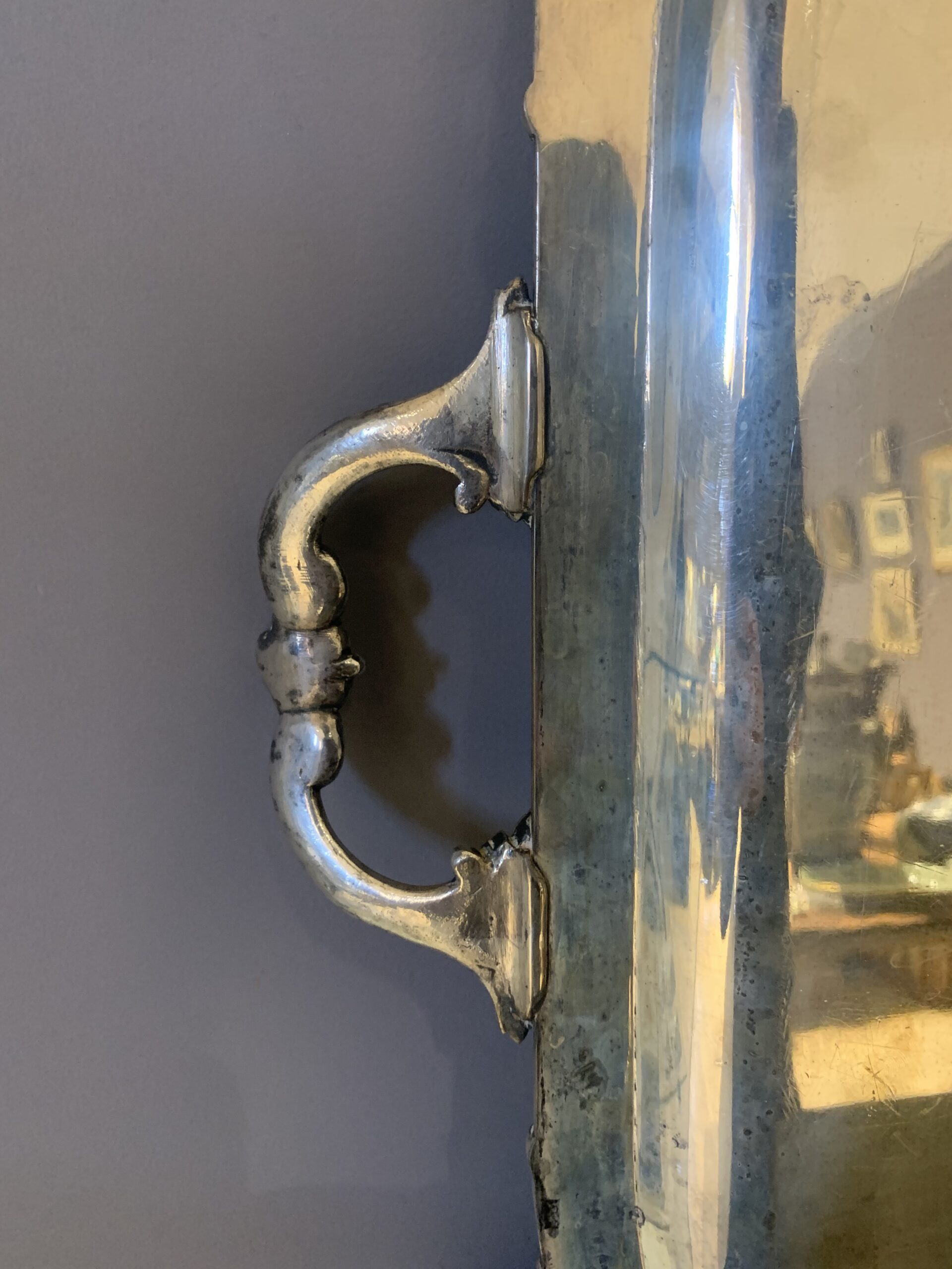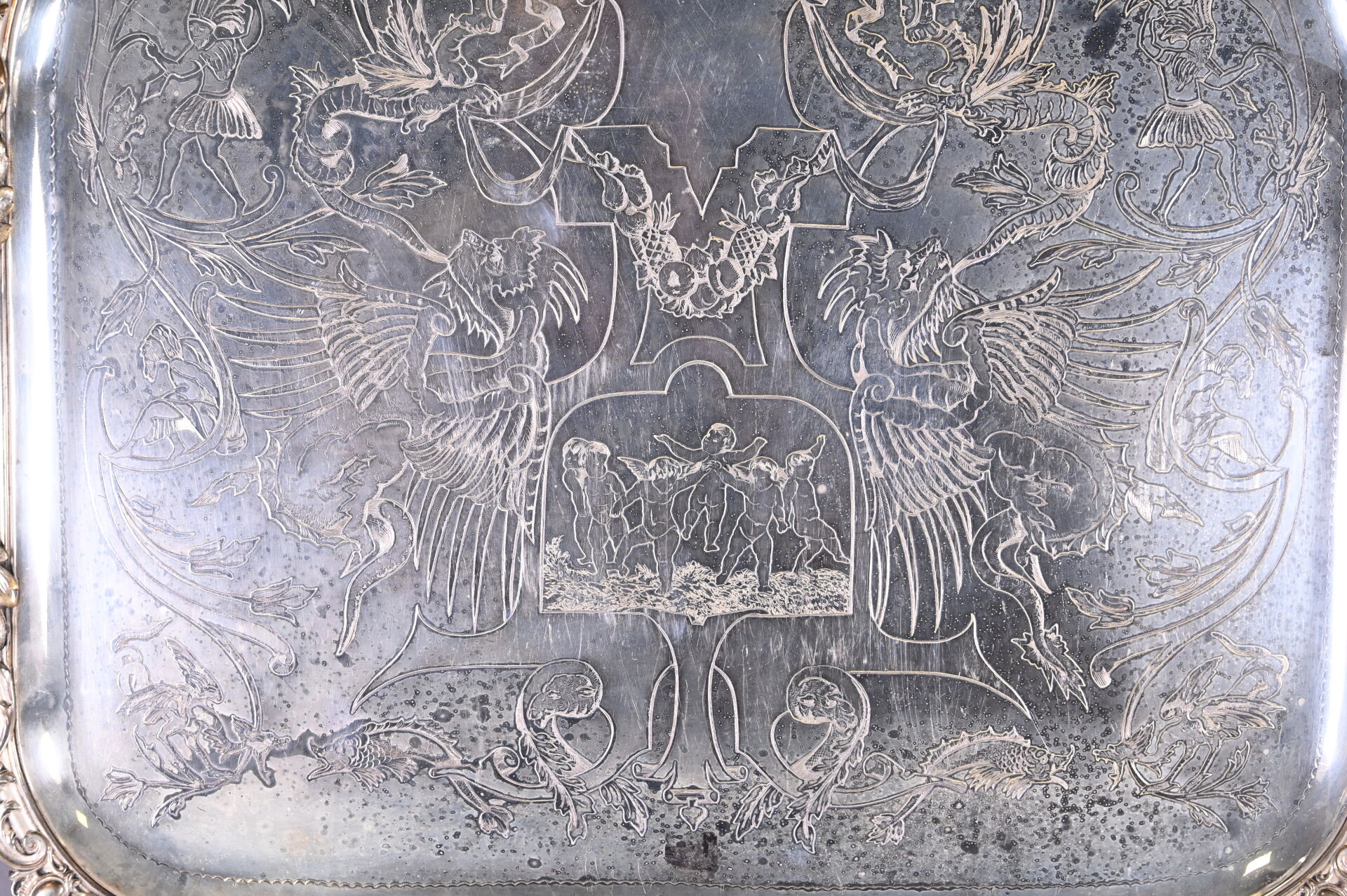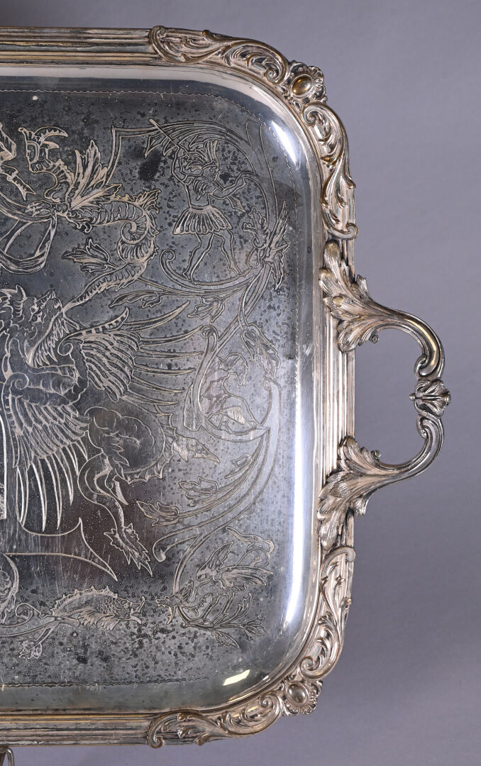 Plateau en bronze argenté à décor de feuilles d’acanthes, plateau gravé aux indiens et animaux fantastiques (usures). 48 x 72 cm.