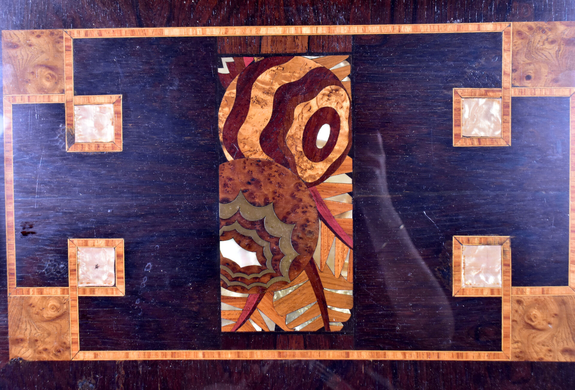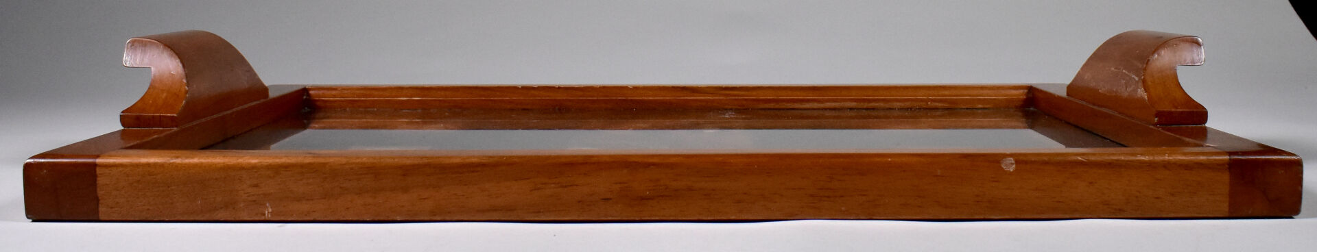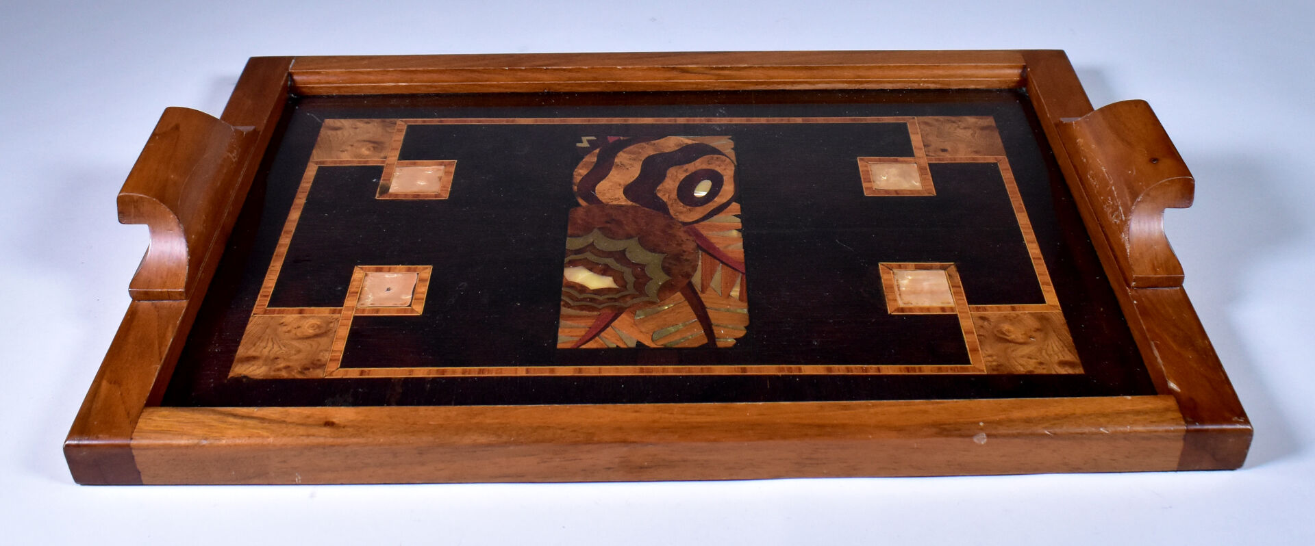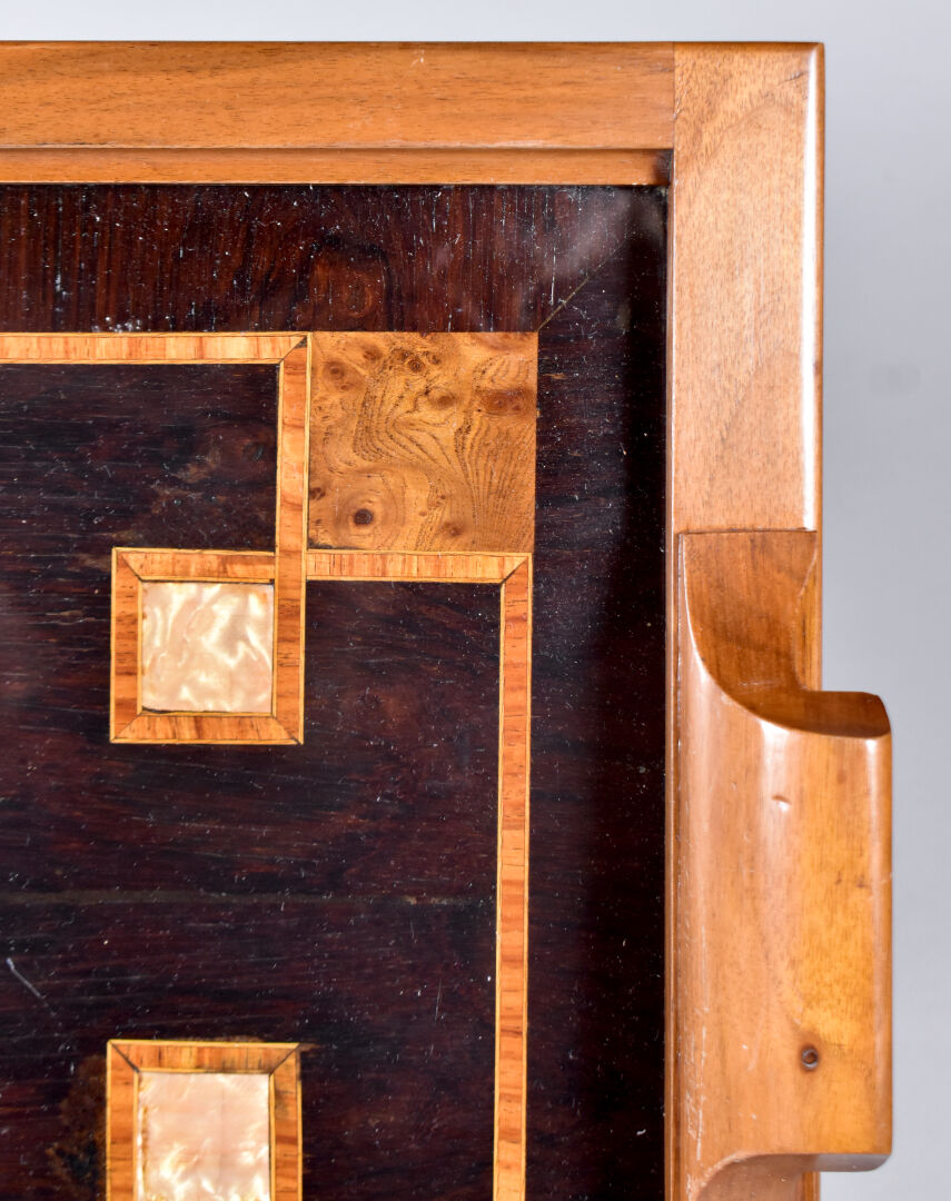 Plateau en noyer à décor marqueté de fleurs en bois de placage, nacre et laiton (quelques usures). Epoque Art Déco. 58 x 38 cm.
