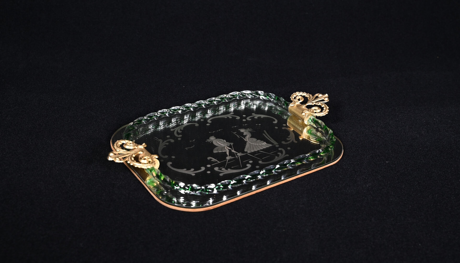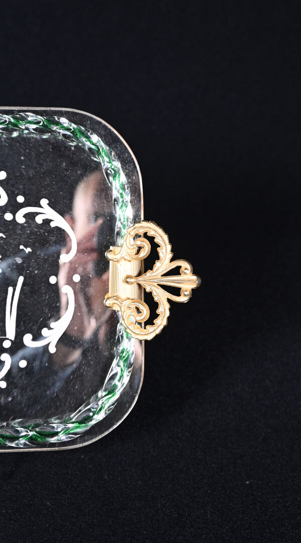 Plateau en verre, orné d’un ruban tors en verre clair et violet, le fond gravé d’une scène galante stylisée. Les poignées en métal doré. Murano. 43 x 27,5 cm.