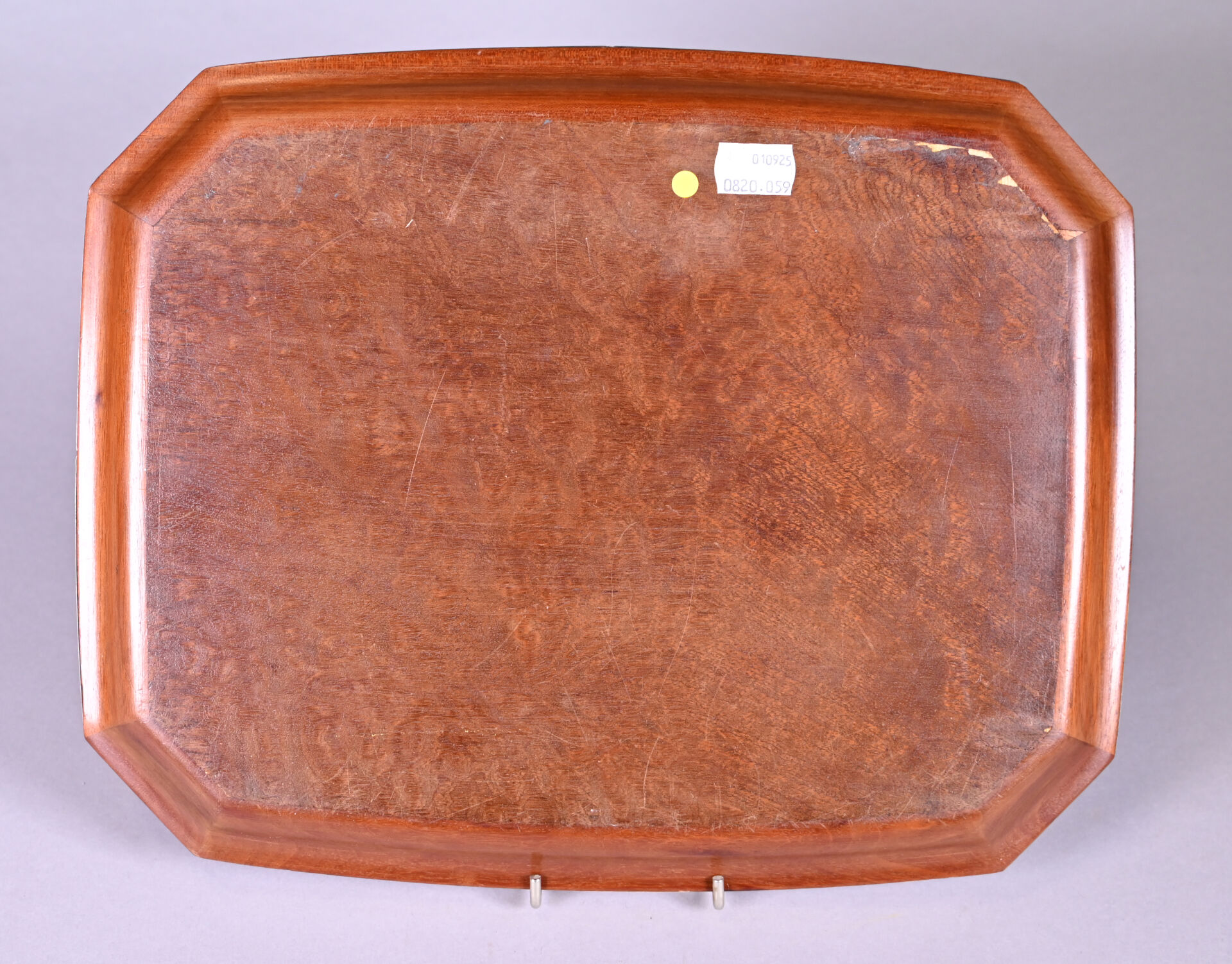 Plateau octogonal en placage de bois exotique, la bordure en argent mouluré 925/1000e (insolé, soulèvements). 35 x 28 cm. Poids brut. : 540 g