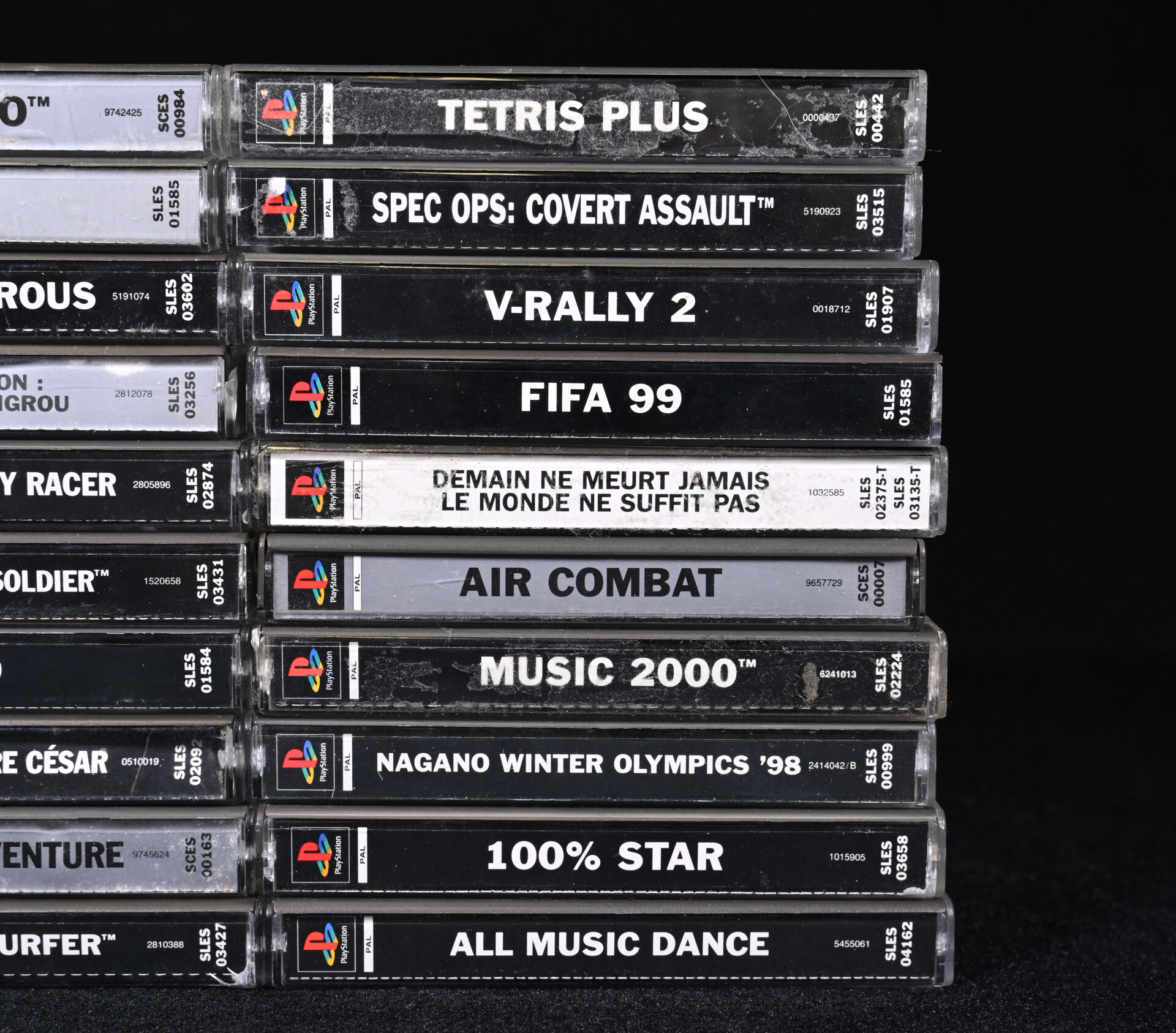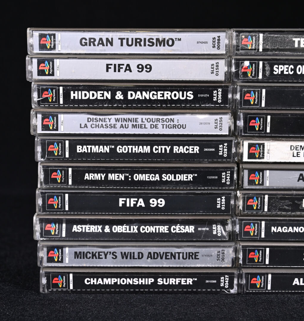 PLAYSTATION 1. Ensemble de 20 jeux dont GRAN TURISMO, HIDDEN & DANGEROUS, MICKEY’S WILD ADVENTURE, TETRIS PLUS, V-RALLY 2, DEMAIN NE MEURT JAMAIS LE MONDE NE SUFFIT PAS, AIR COMBAT, ALL MUSIC DANCE et divers.