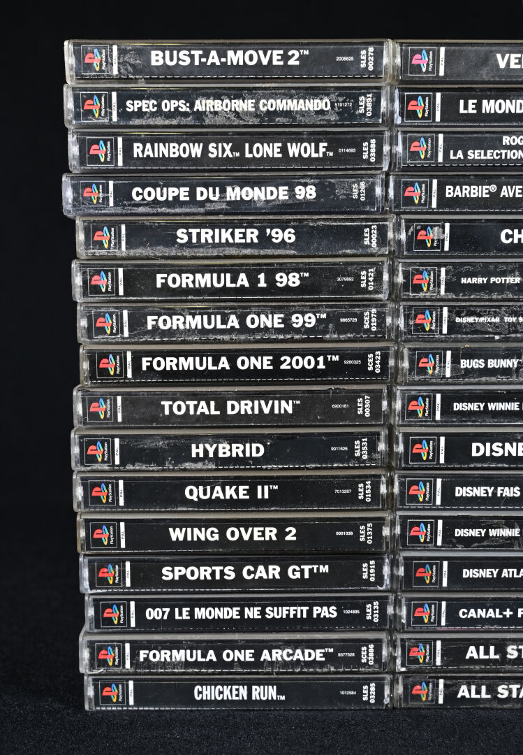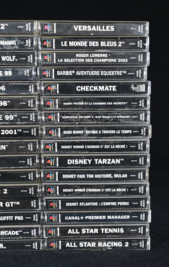 PLAYSTATION 1. Ensemble de 32 jeux dont RAINBOW SIX, TOTAL DRIVIN, QUAKE II, WING OVER 2, 007 LE MONDE NE SUFFIT PAS, FORMULA ONE ARCADE, CHICKEN RUN, DISNEY TARZAN, ALL STAR TENNIS et divers (usures d’usage, quelques boites endommagées).