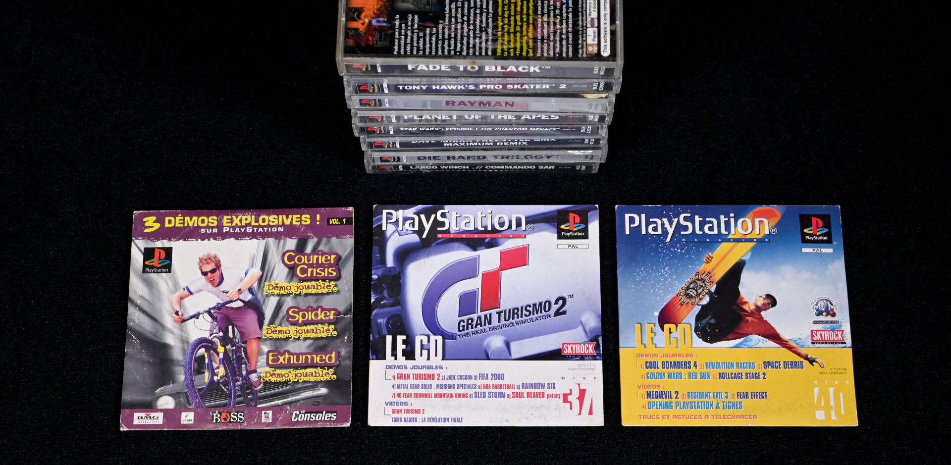 PLAYSTATION 1. Ensemble de 8 jeux dont FADETO BLACK, STAR WARS : LA MENACE FANTOME, RAYMAN, LARGO WINCH COMMANDO SAR, DIE HARD TRILOGY (usures d’usage). On joint 3 CD démos.