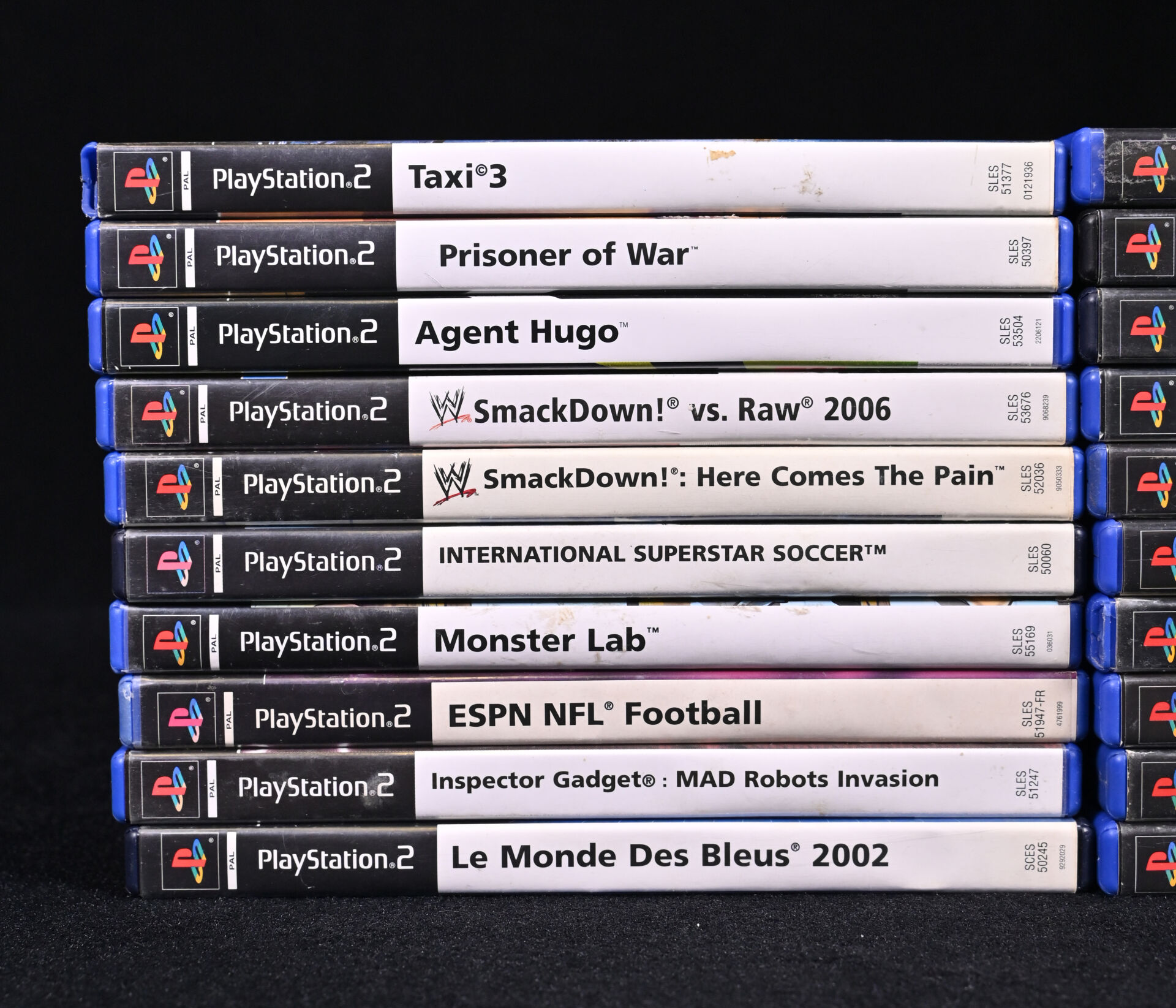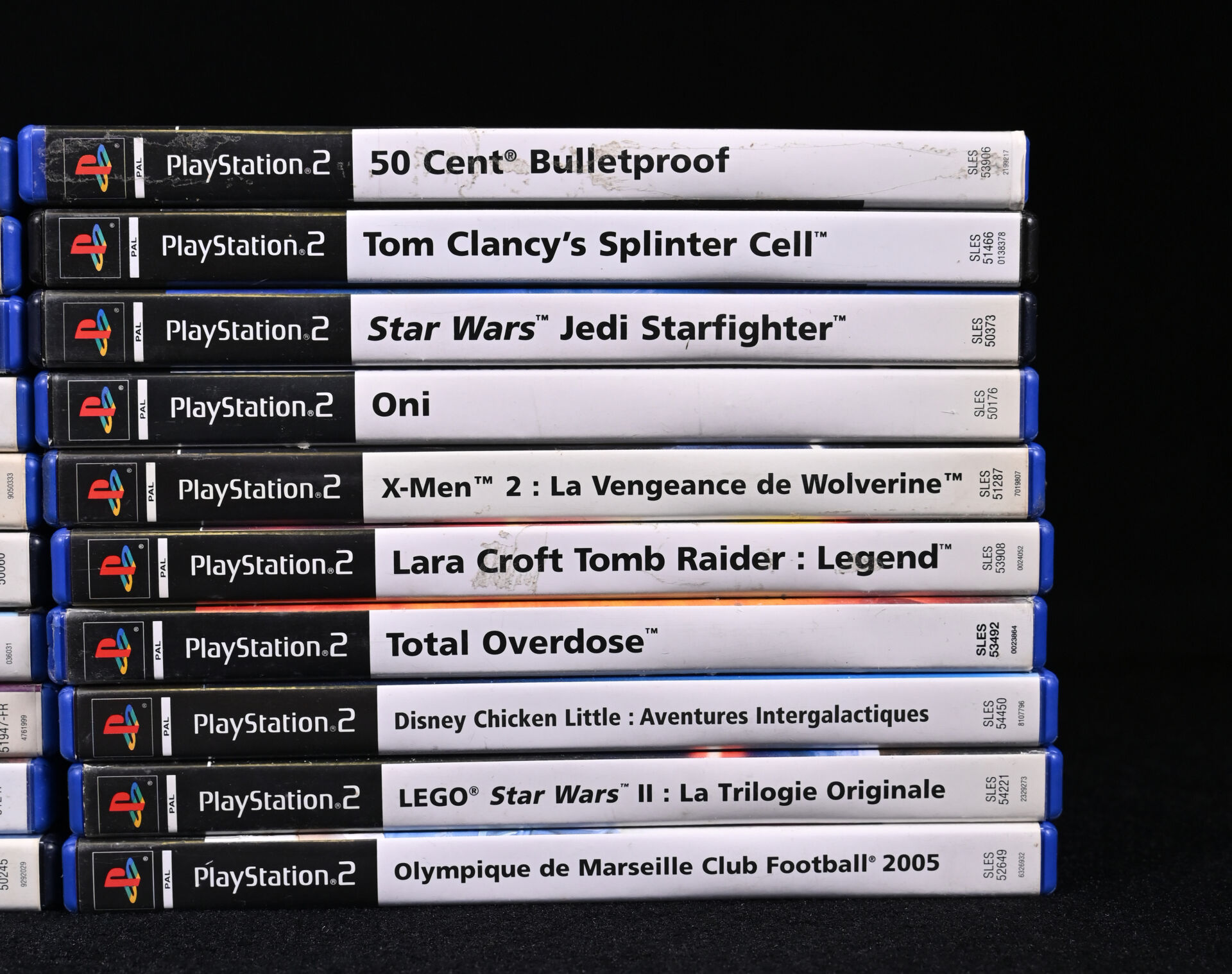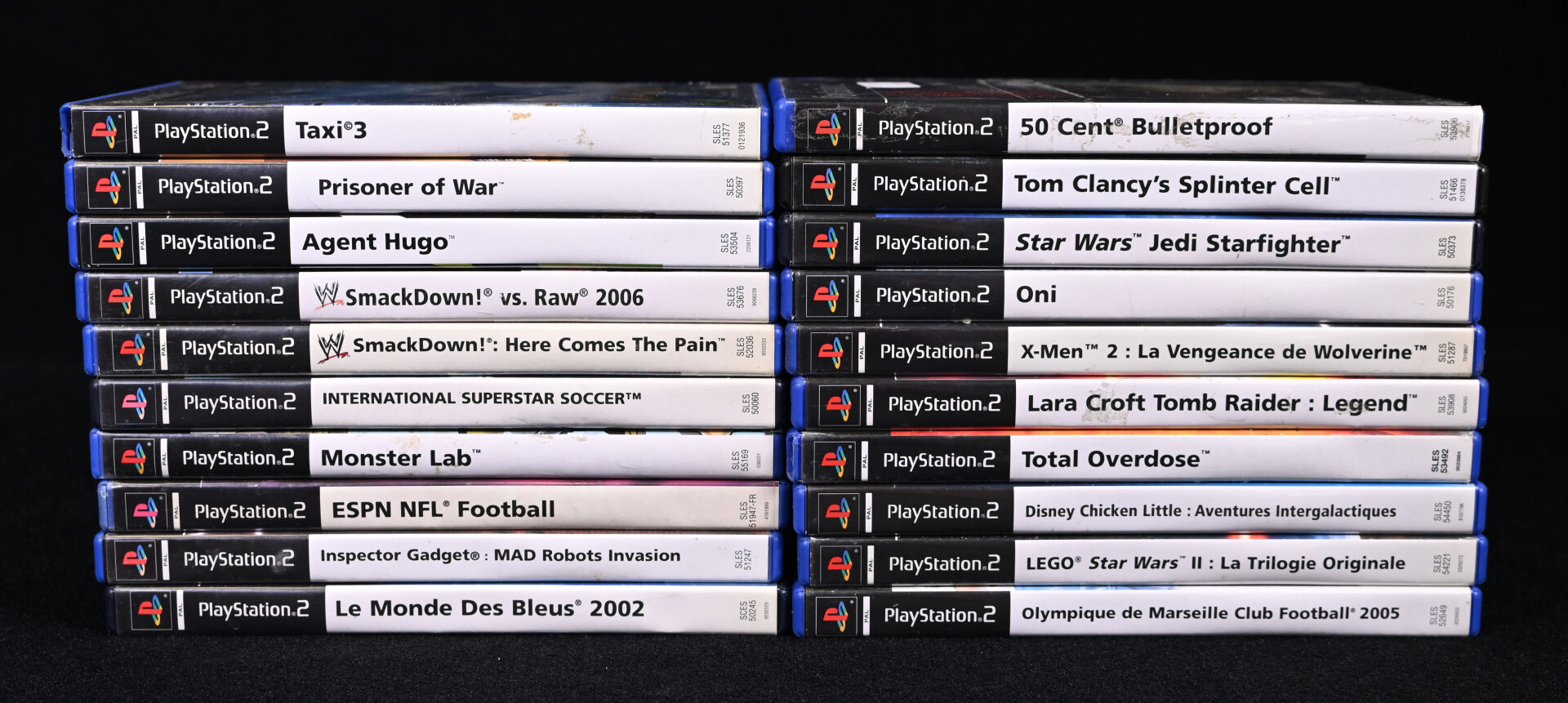 PLAYSTATION 2. Ensemble de 20 jeux dont TAXI 3, PRISONER OF WAR, MONSTER LAB, 50 CENT BULLETPROOF, TOM CLANCY’S SPLINTER CELL, ONI, TOTAL OVERDOSE, OLYMPIQUE DE MARSEILLE CLUB FOOTBALL 2005 et divers (usures d’usage).