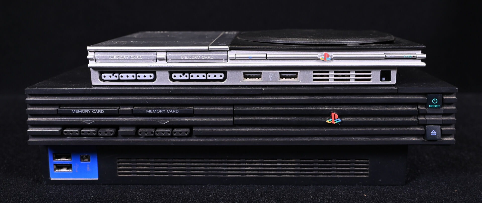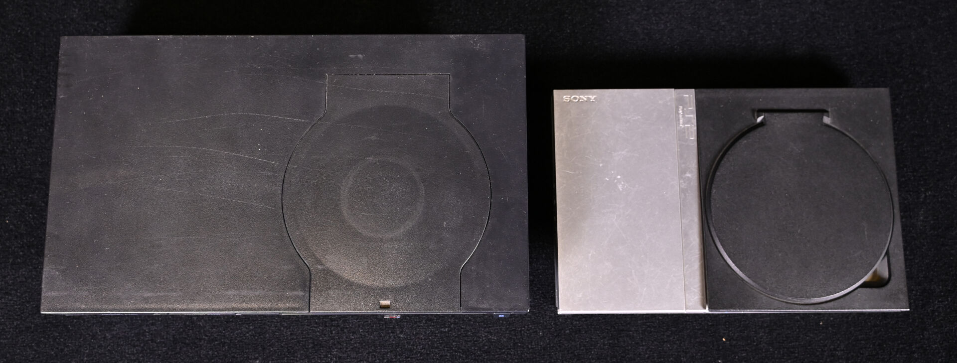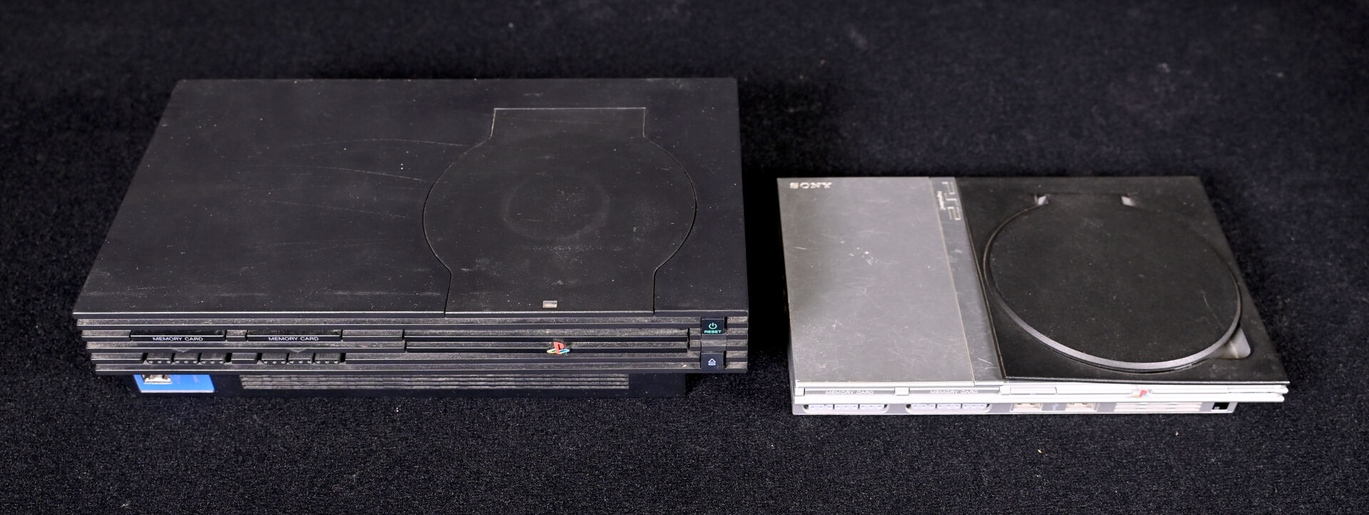 PLAYSTATION 2 FAT et SLIM. Deux consoles avec ouverture en façade (usures d’usage).