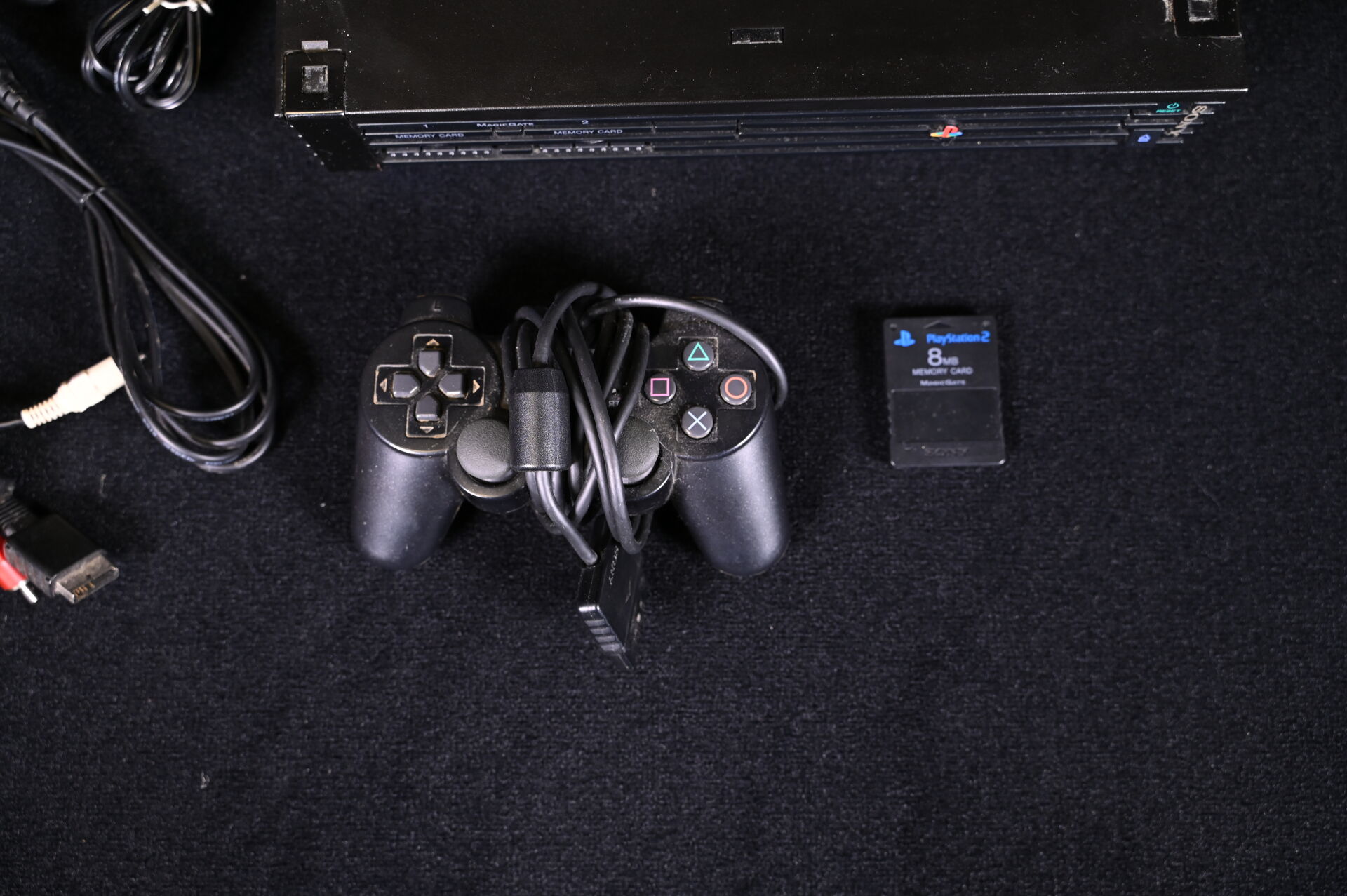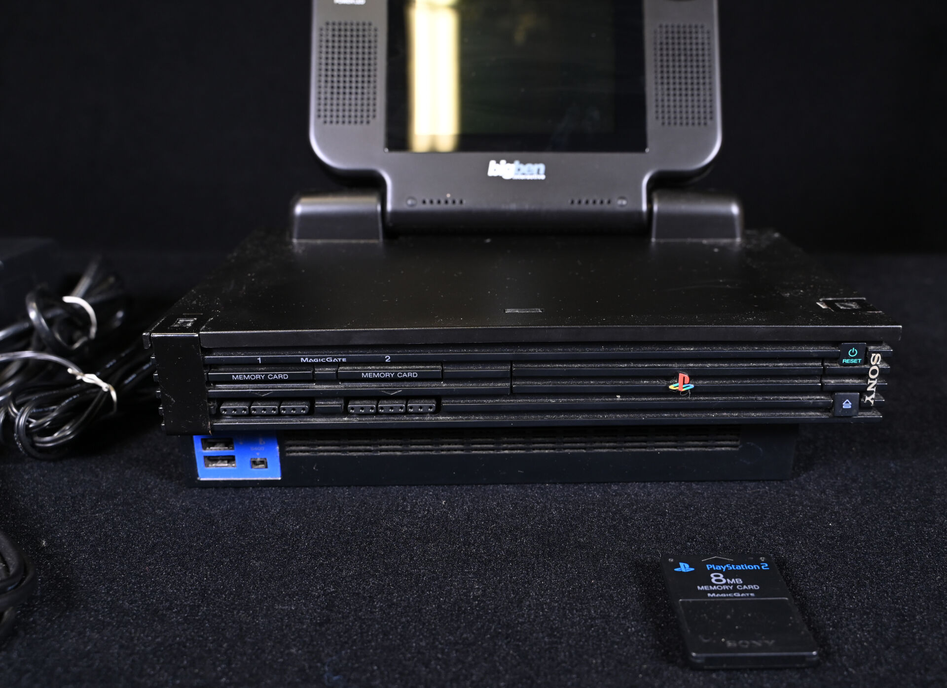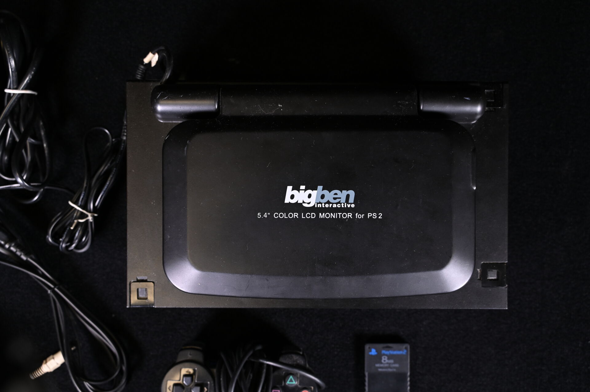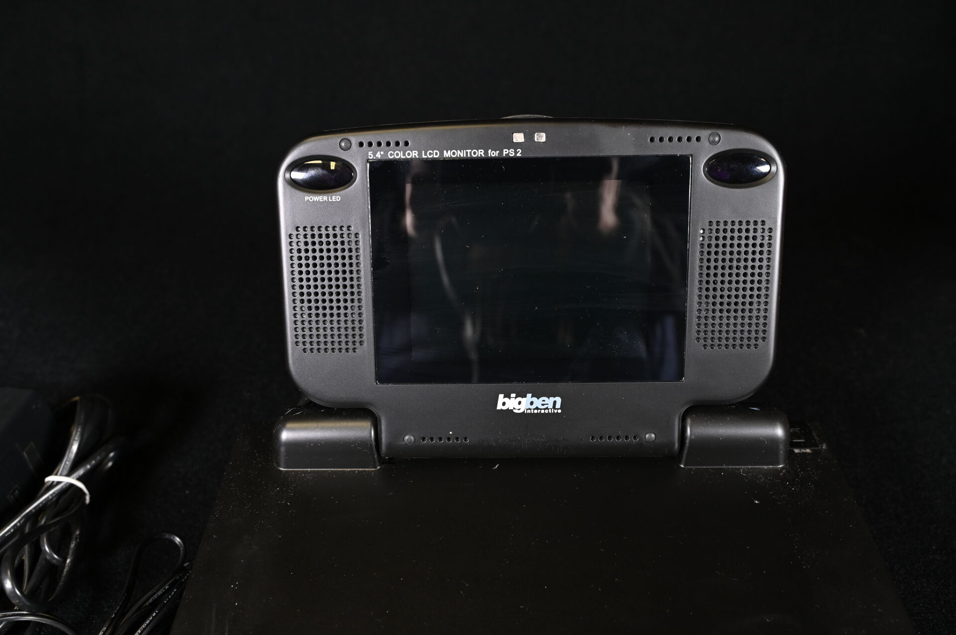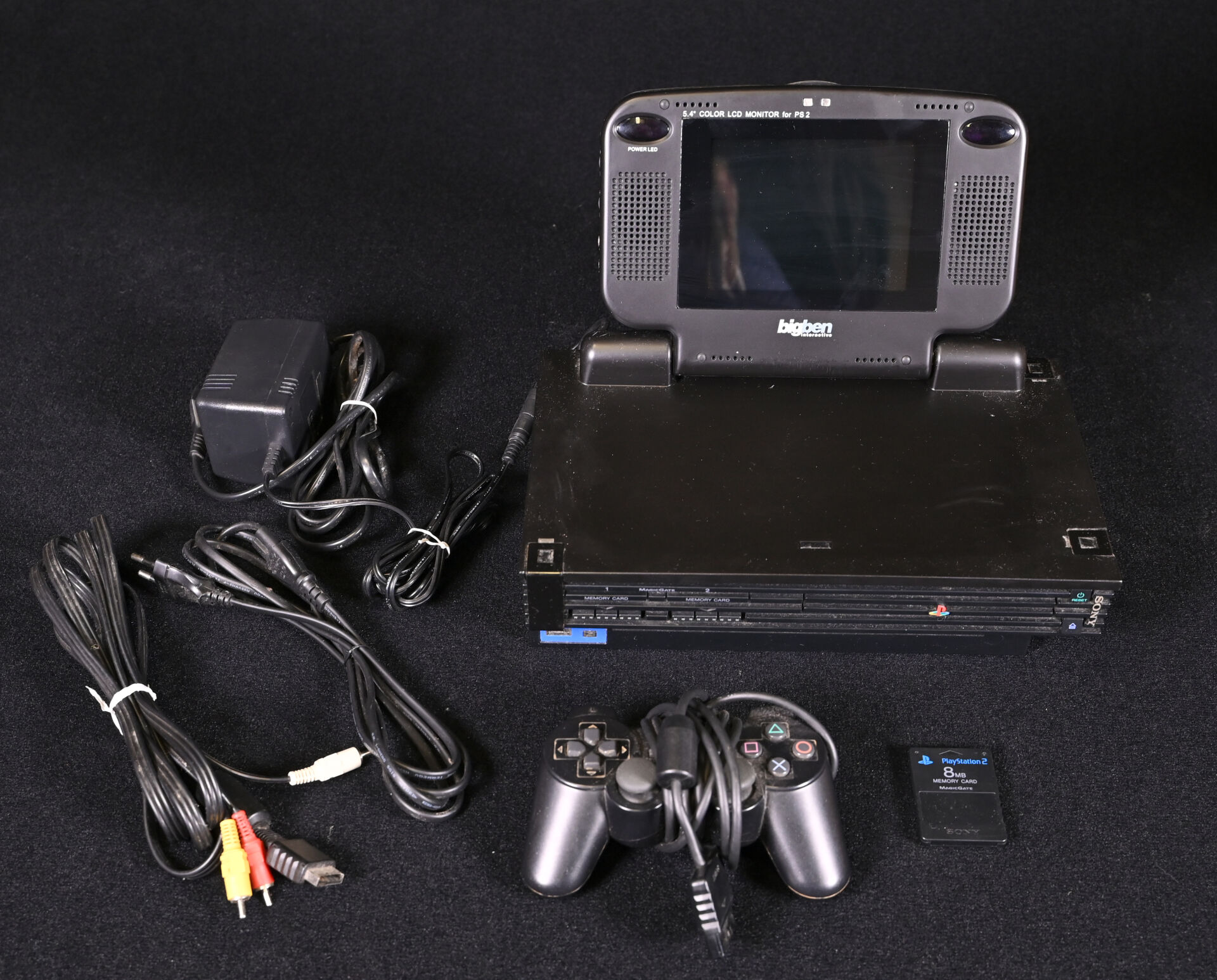 PLAYSTATION 2 FAT. Une console avec écran BIG BEN intégré, une manette, une carte mémoire et câbles (usures d’usage).