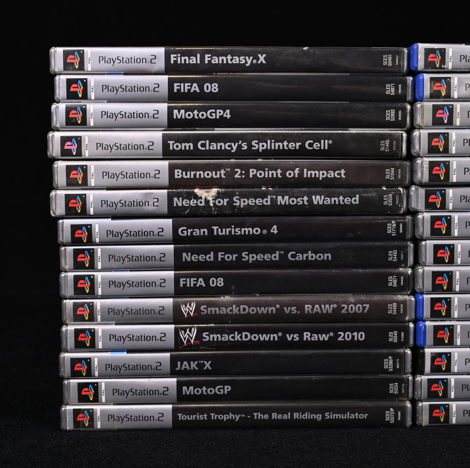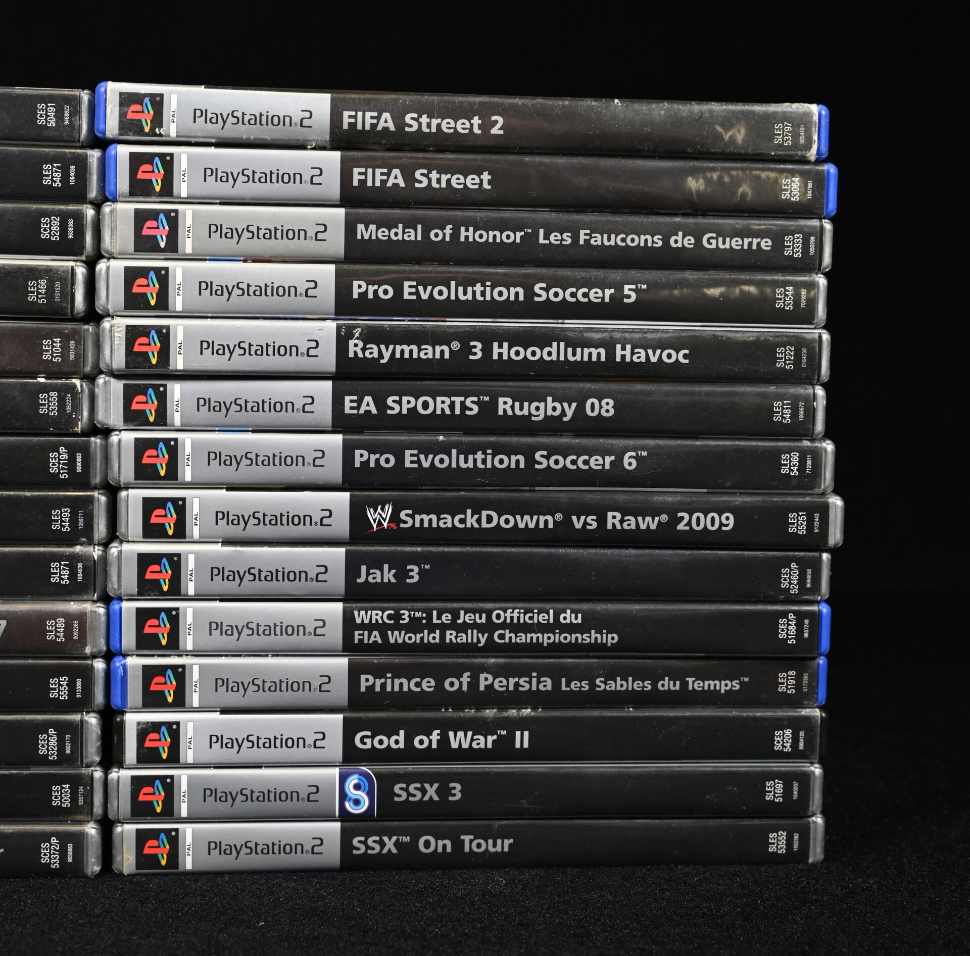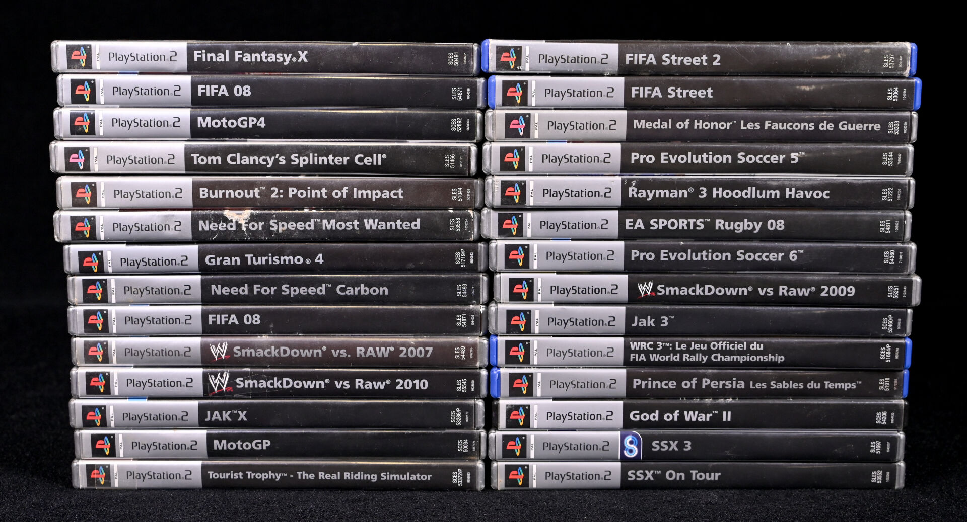 PLAYSTATION 2 PLATINIUM. Ensemble de 28 jeux dont FINAL FANTASY X, GRAN TURISMO 4, JAK X, MOTO GP, FIFA STREET, JAK 3, GOD OF WAR II, SSX ON TOUR et divers (usures d’usage).