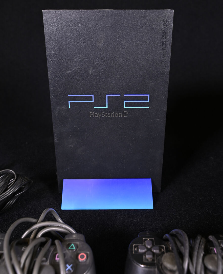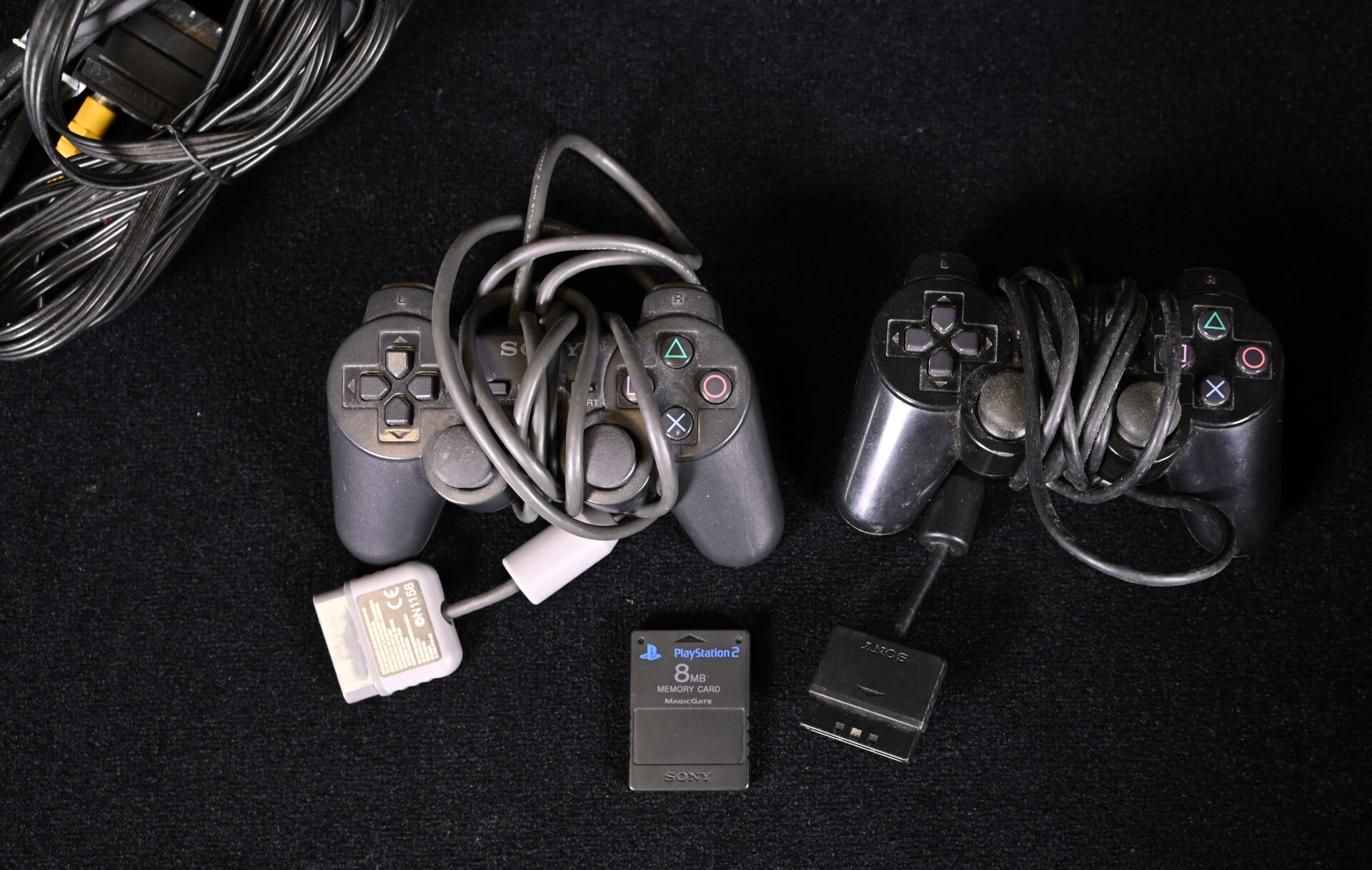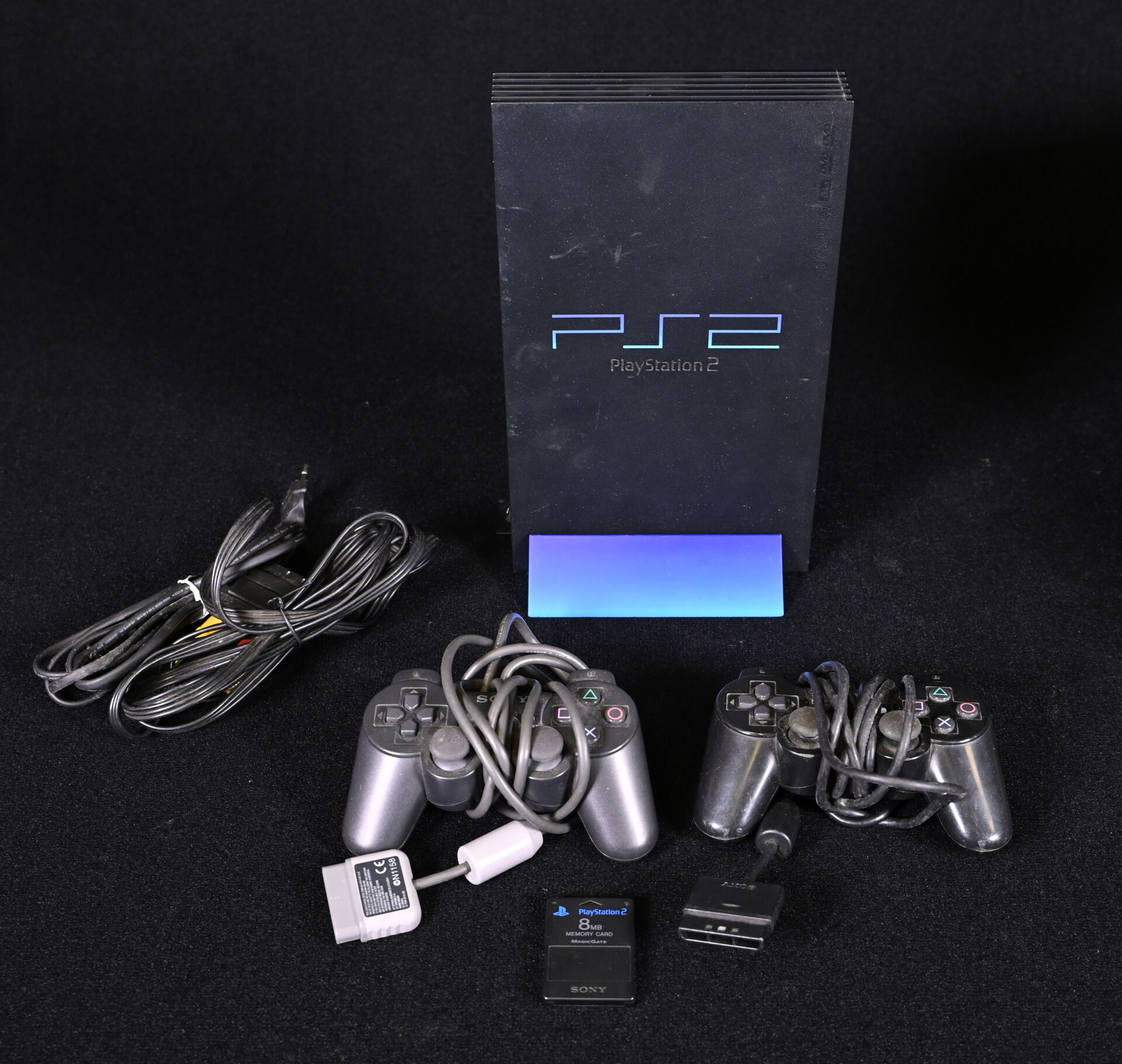 PLAYSTATION 2. Une console et son socle, deux manettes, une carte mémoire et câbles (usures d’usage).