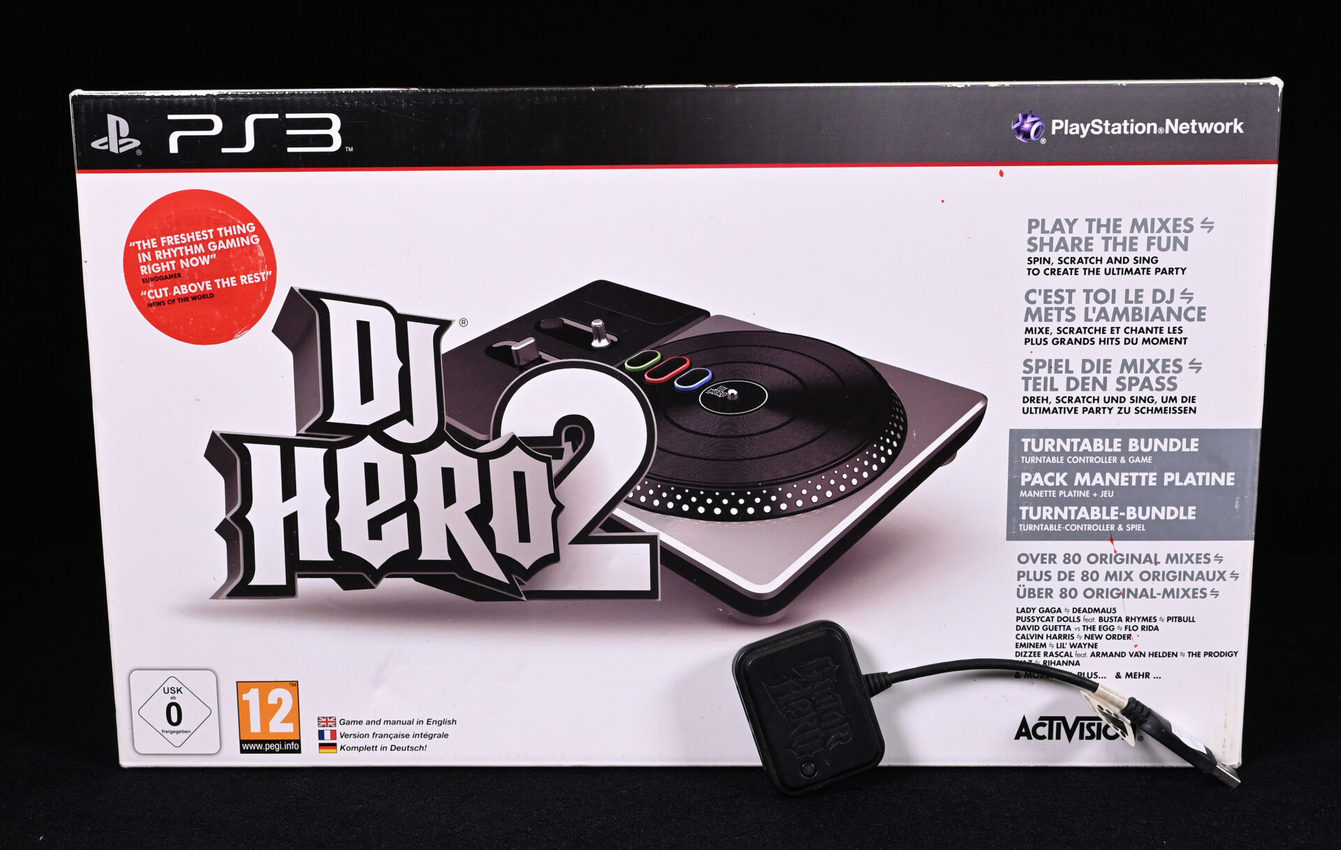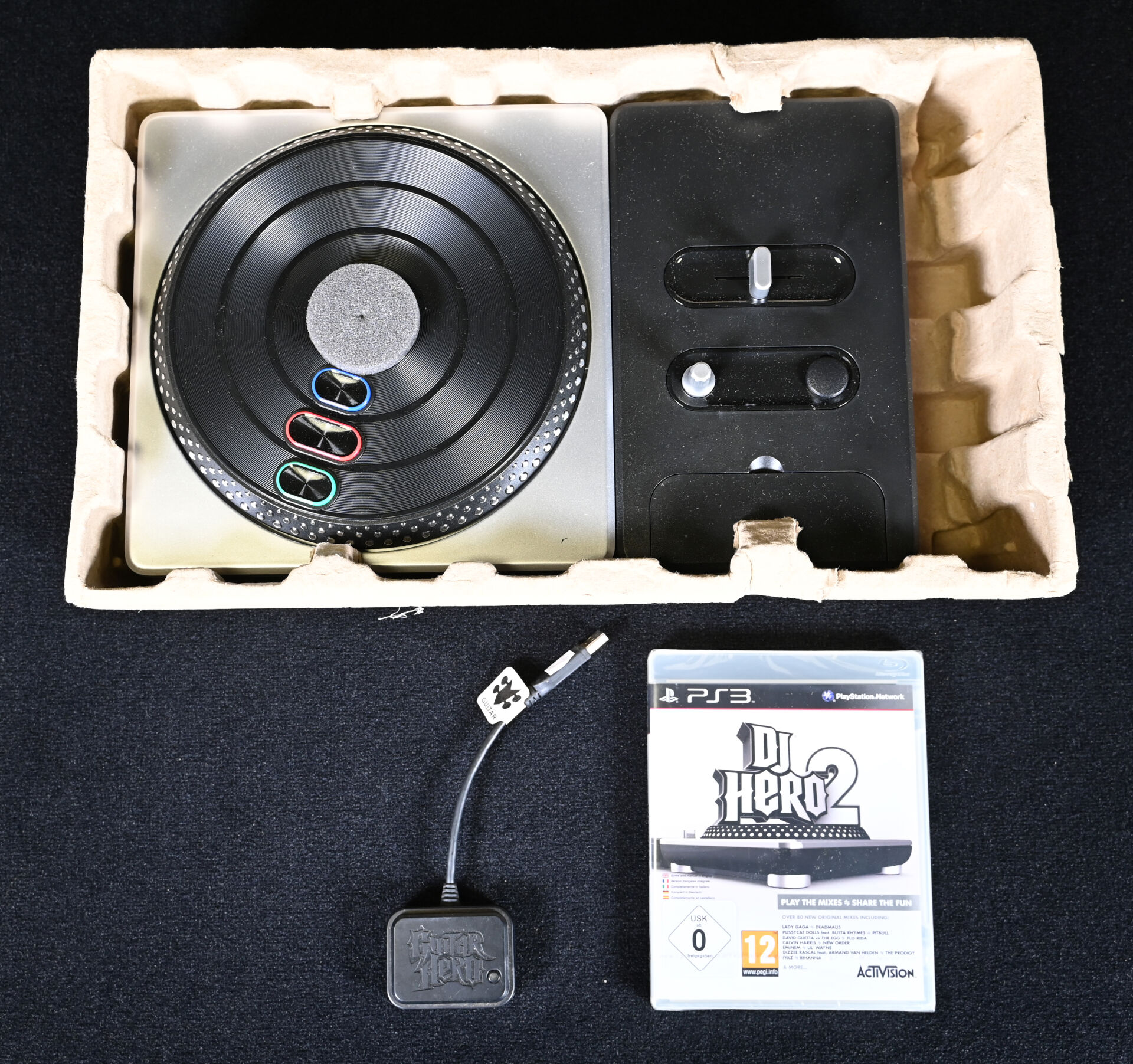 PLAYSTATION 3. Coffret DJ HERO 2 (jeu compris). On joint un contrôleur GUITAR HERO.