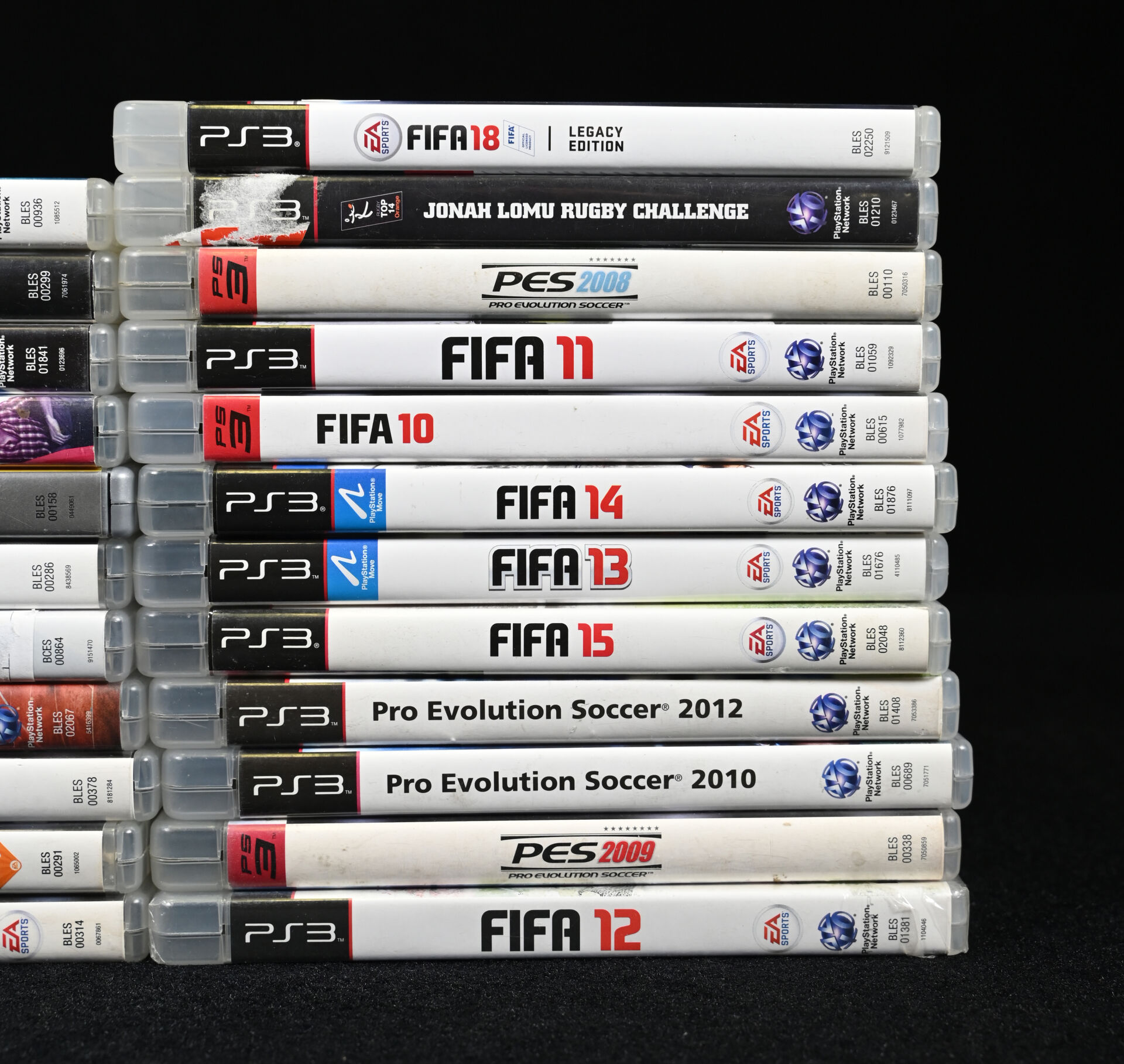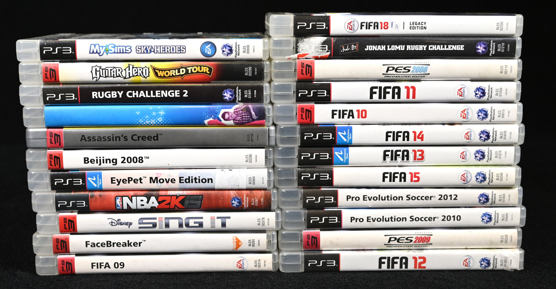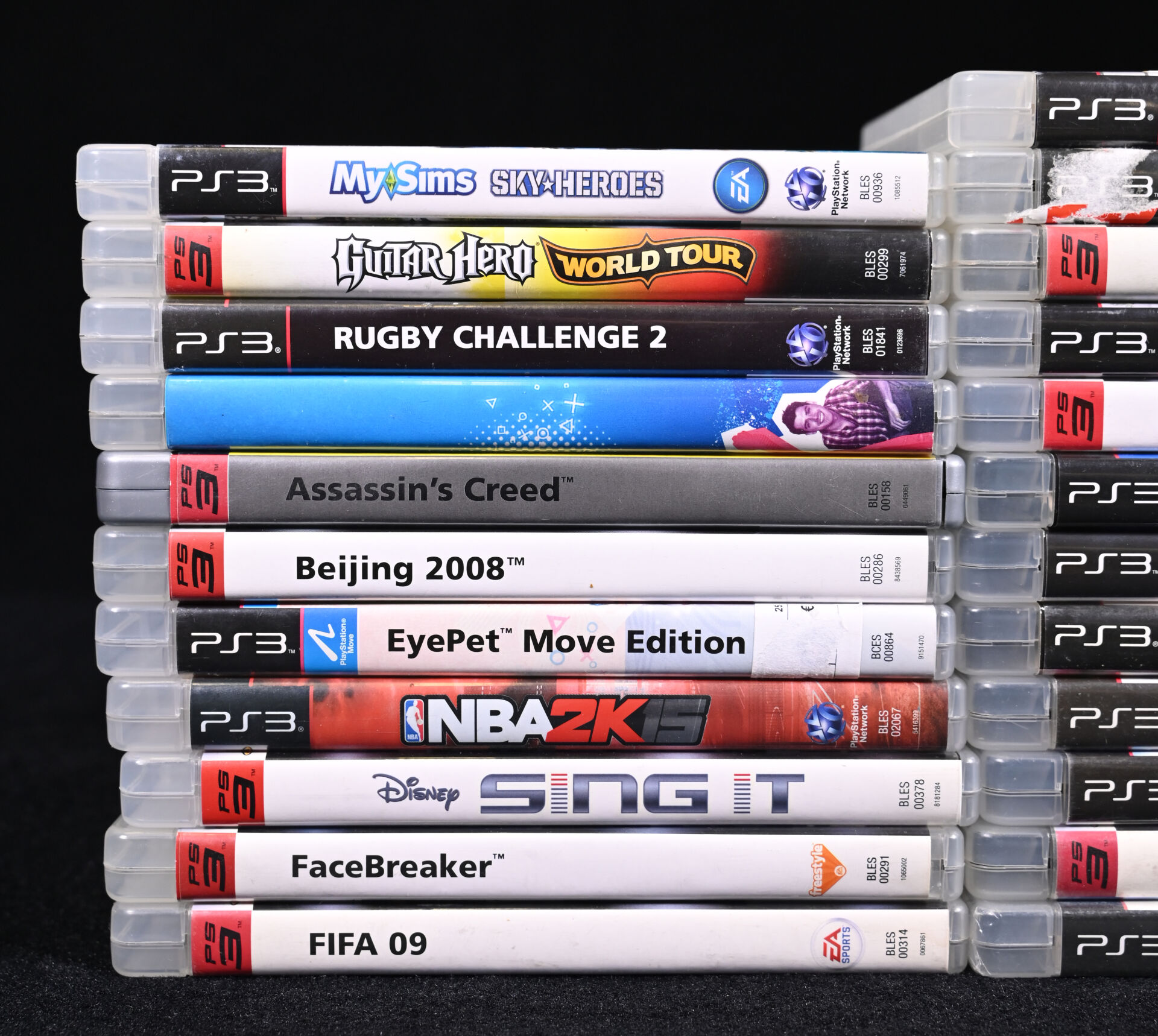 PLAYSTATION 3. Ensemble de 23 jeux dont GUITAR HERO WORLD TOUR, ASSASIN’S CREED, FACEBREAKER, BEIJING 2008, DISNEY SING IT, MY SIMS SKY HEROES et divers (usures d’usage).