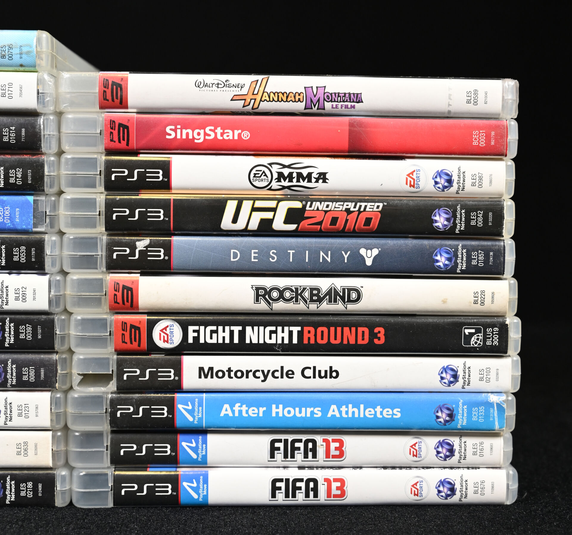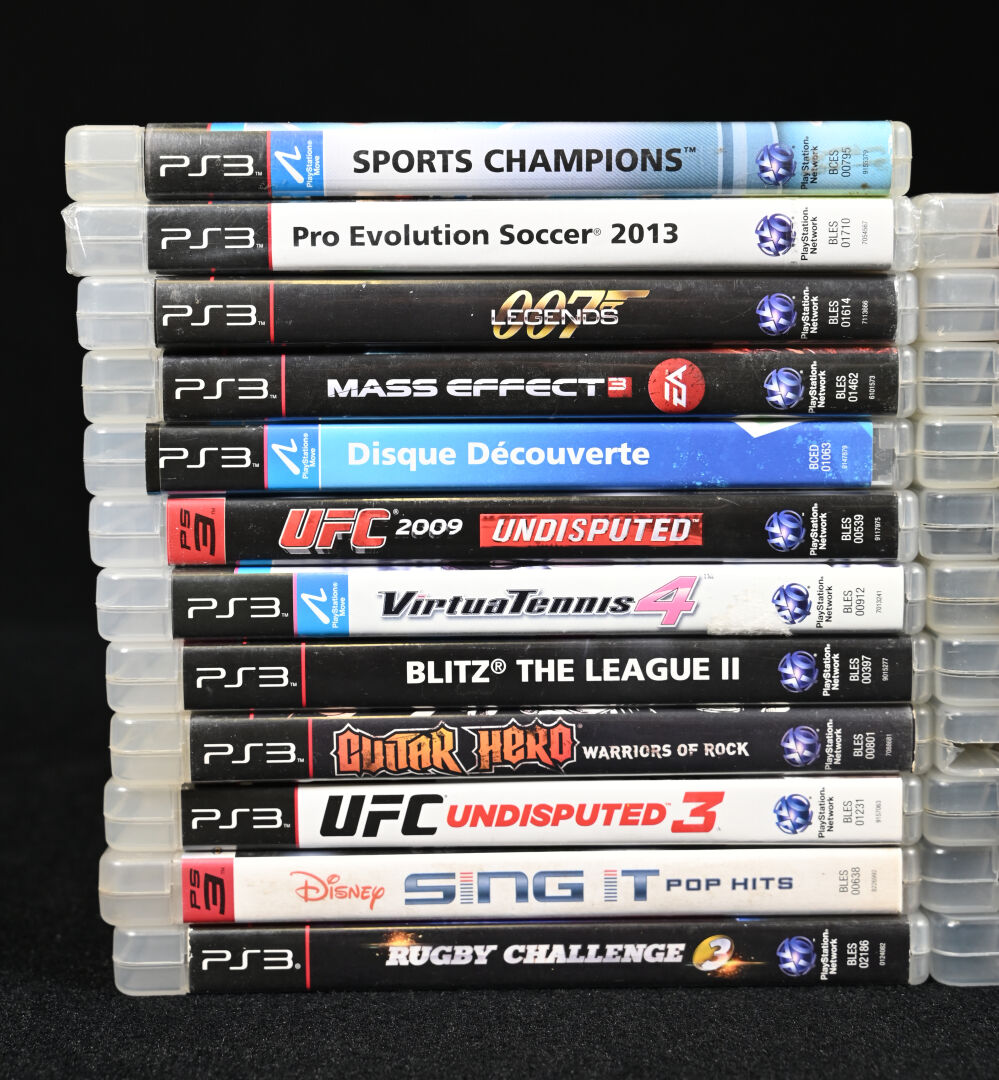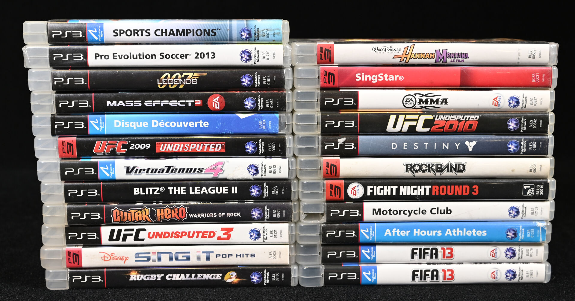 PLAYSTATION 3. Ensemble de 23 jeux dont SPORTS CHAMPIONS, 007 LEGENDS, MASS EFFECT 3, BLITZ THE LEAGUE II, GUITAR HERO WARRIORS OF ROCK, SINGSTAR, DESTINY, ROCKBAND, AFTER HOURS ATHLETES et divers (usures d’usage).