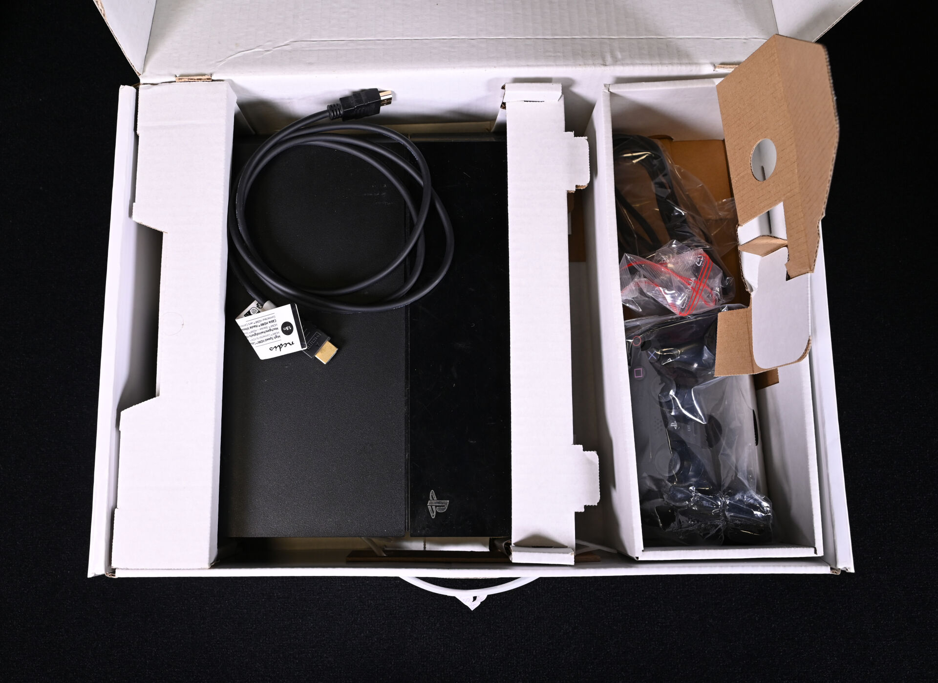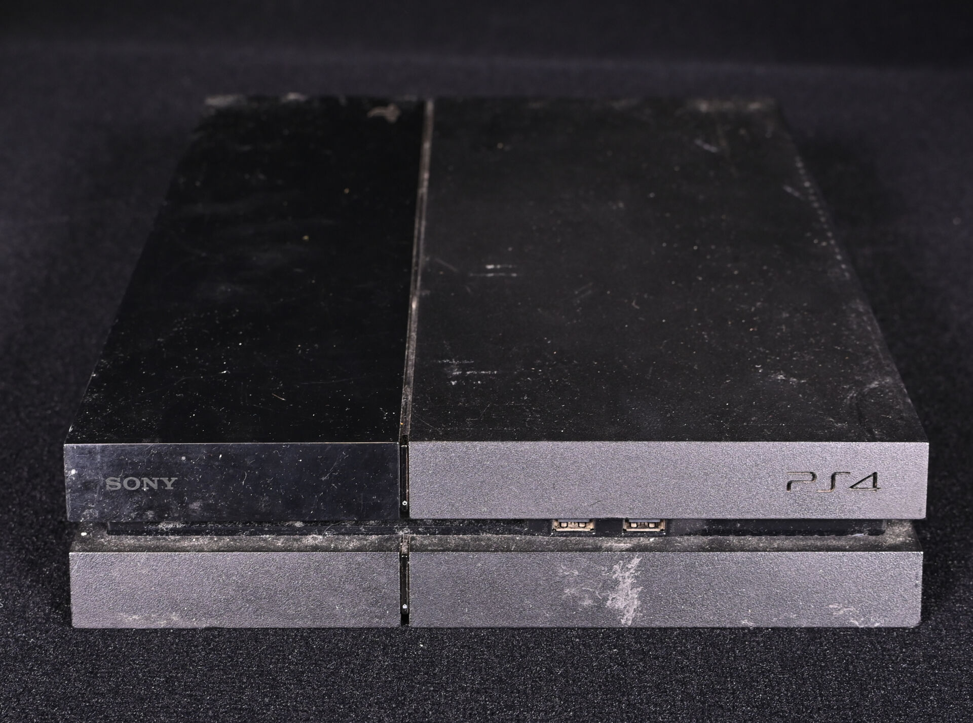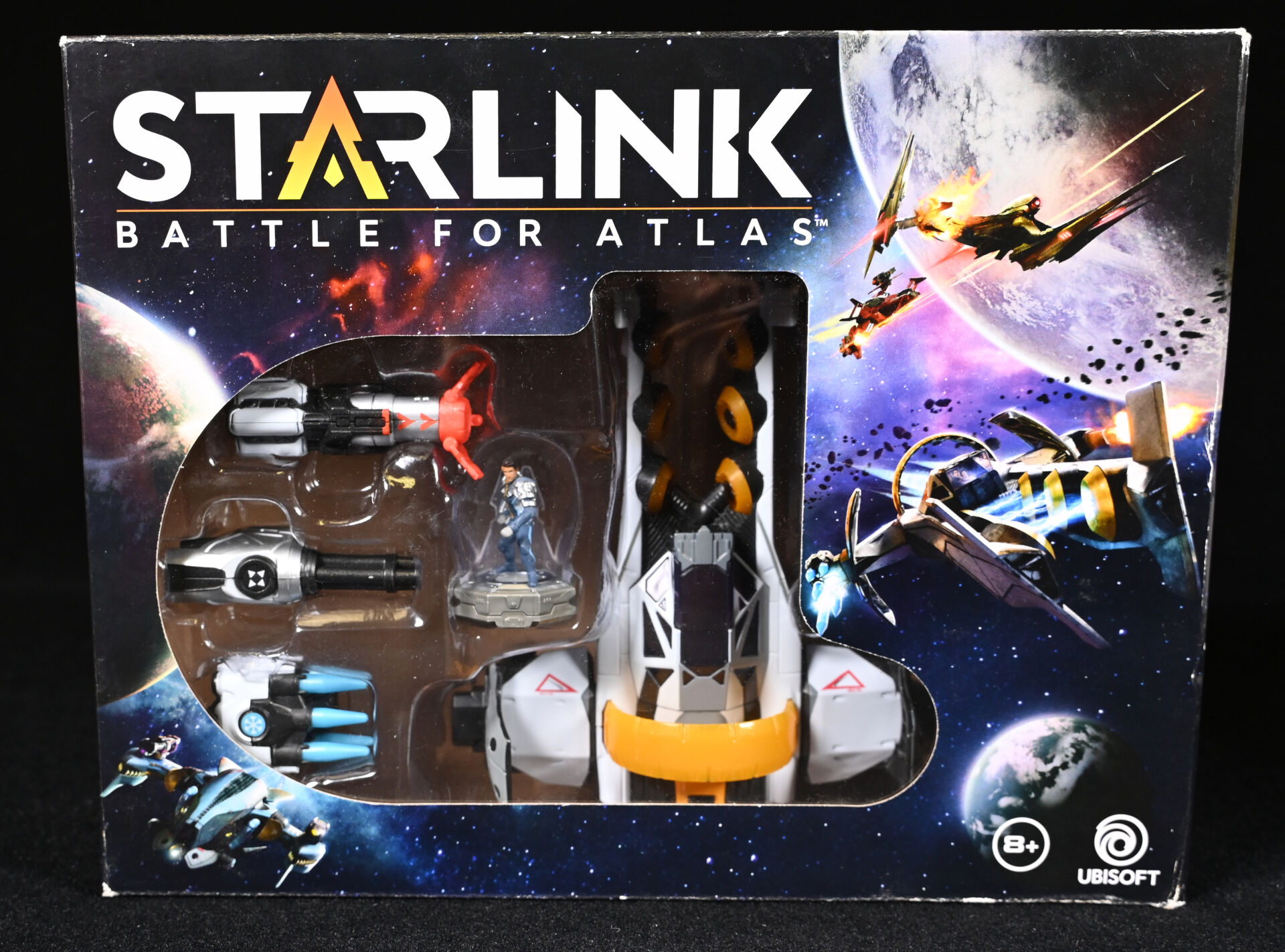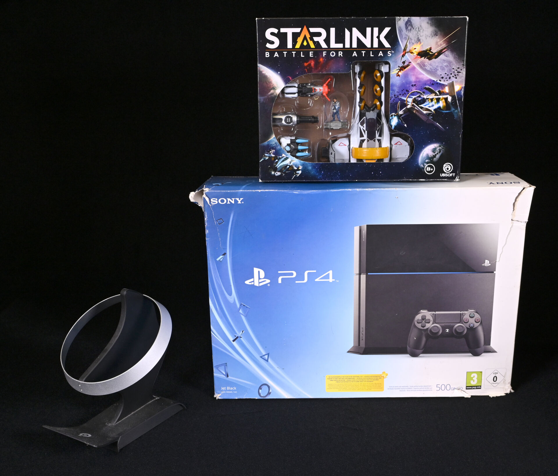 PLAYSTATION 4 . Ensemble comprenant une console PLAYSTATION 4 avec manette et câbles dans sa boîte d’origine, et un coffret avec figurines STARLINK BATTLE FOR ATLAS. On joint un support de casque VR.