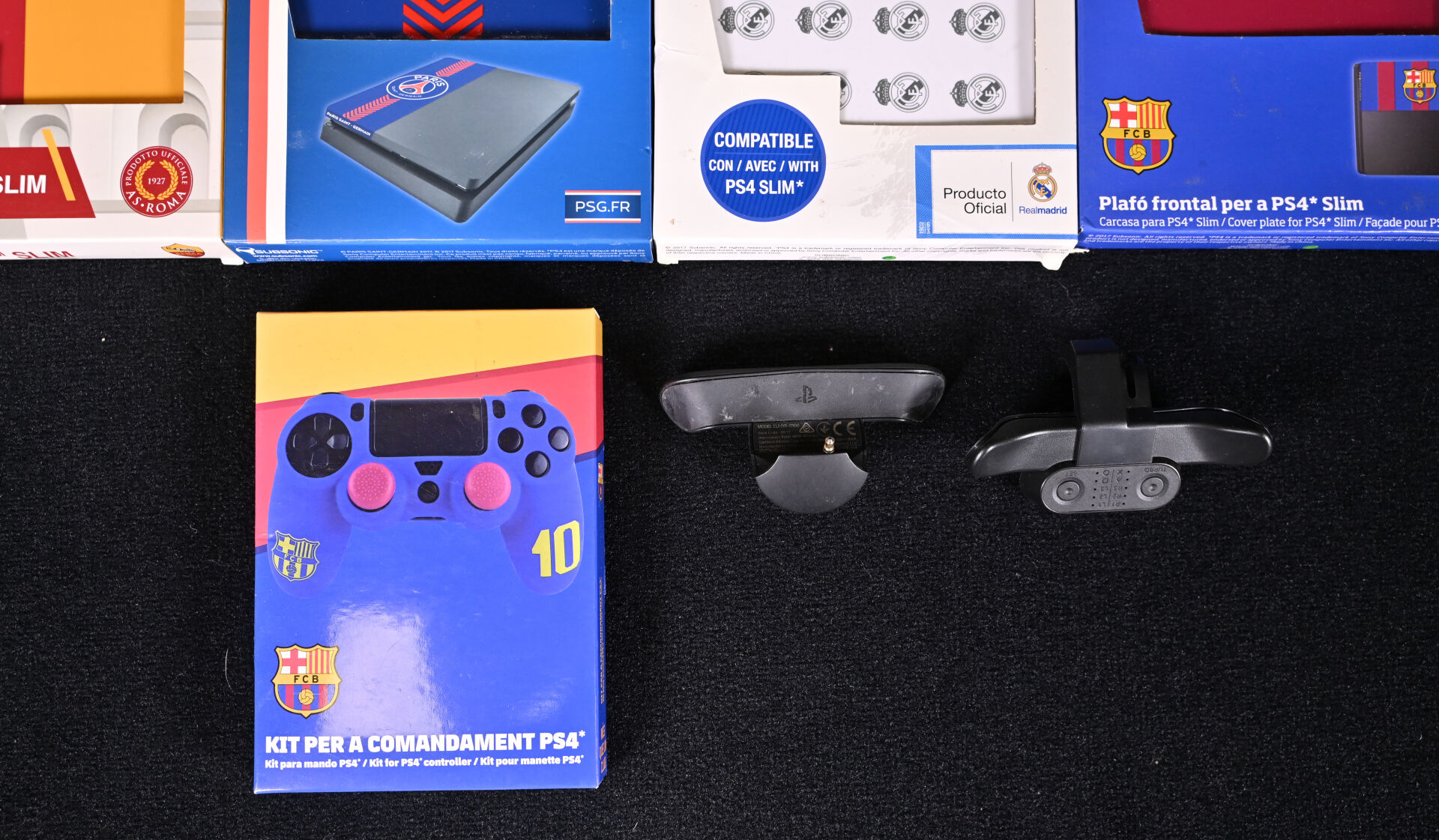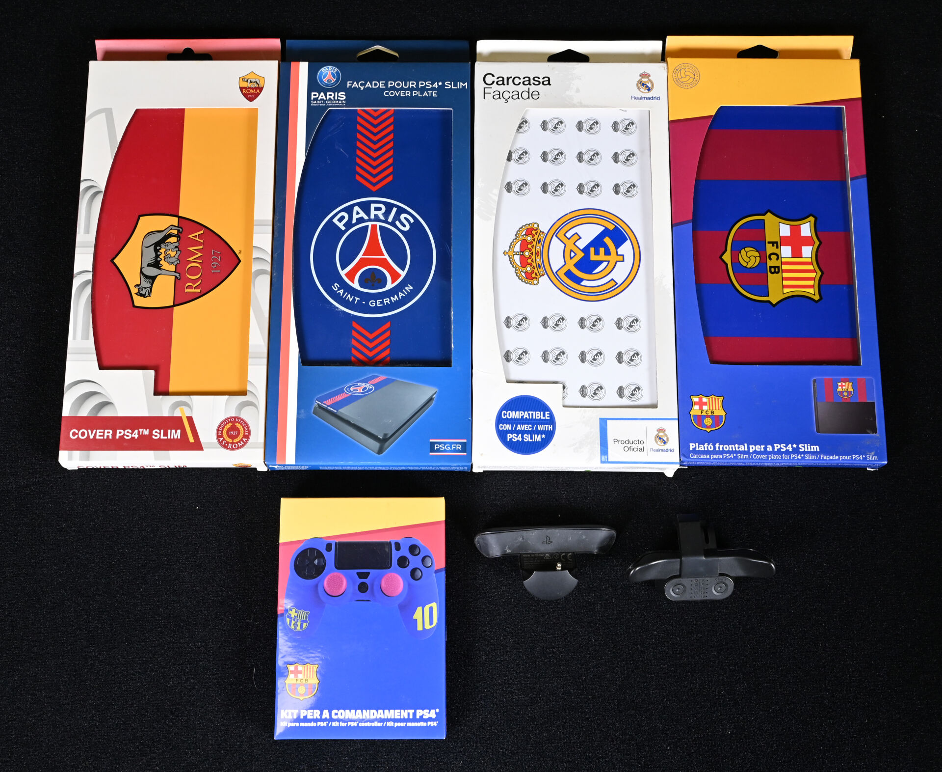 PLAYSTATION 4. Lot d’accessoires comprenant deux palettes, un kit pour manette FC BARCELONE, et quatre façades de console FC BARCELONE, REAL MADRID, AS ROMA et PARIS SG.
