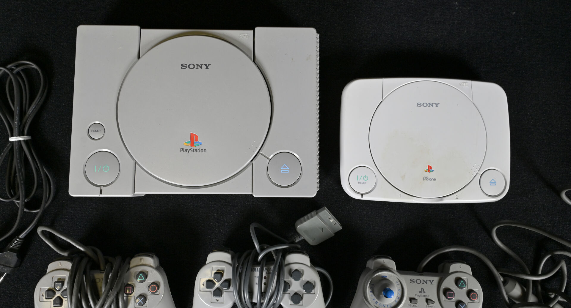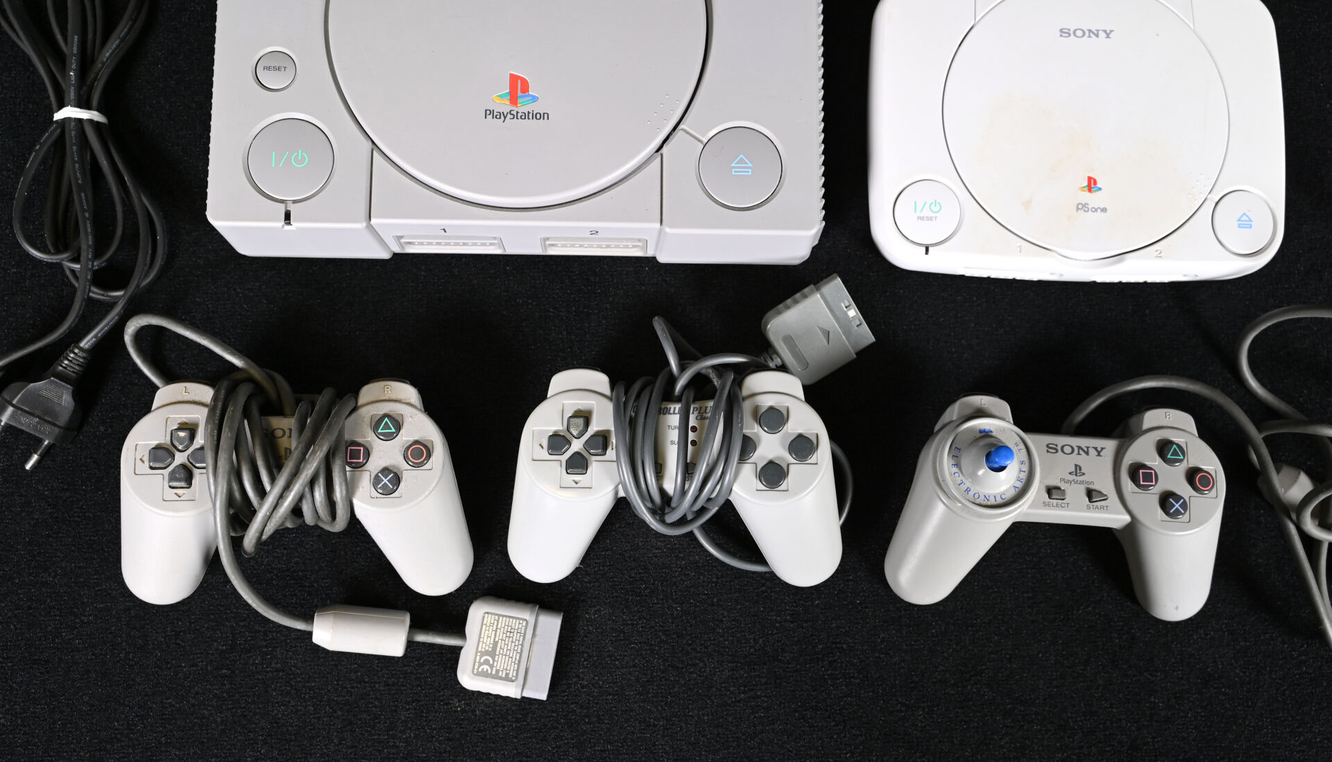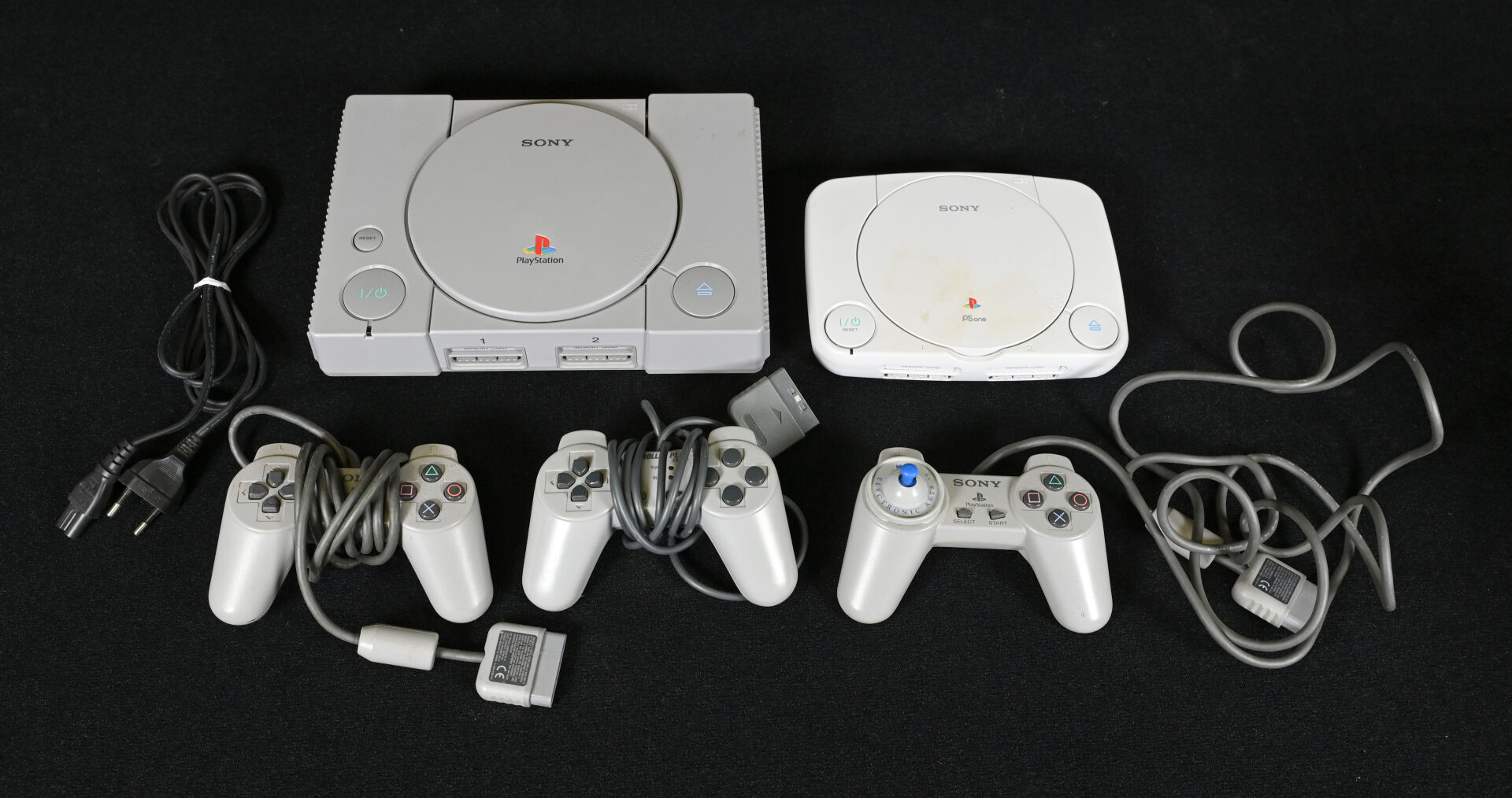 PLAYSTATION et PLAYSTATION ONE. Deux consoles, trois manettes dont une ELECTRONIC ARTS avec joystick bleu et câble (usures d’usage).