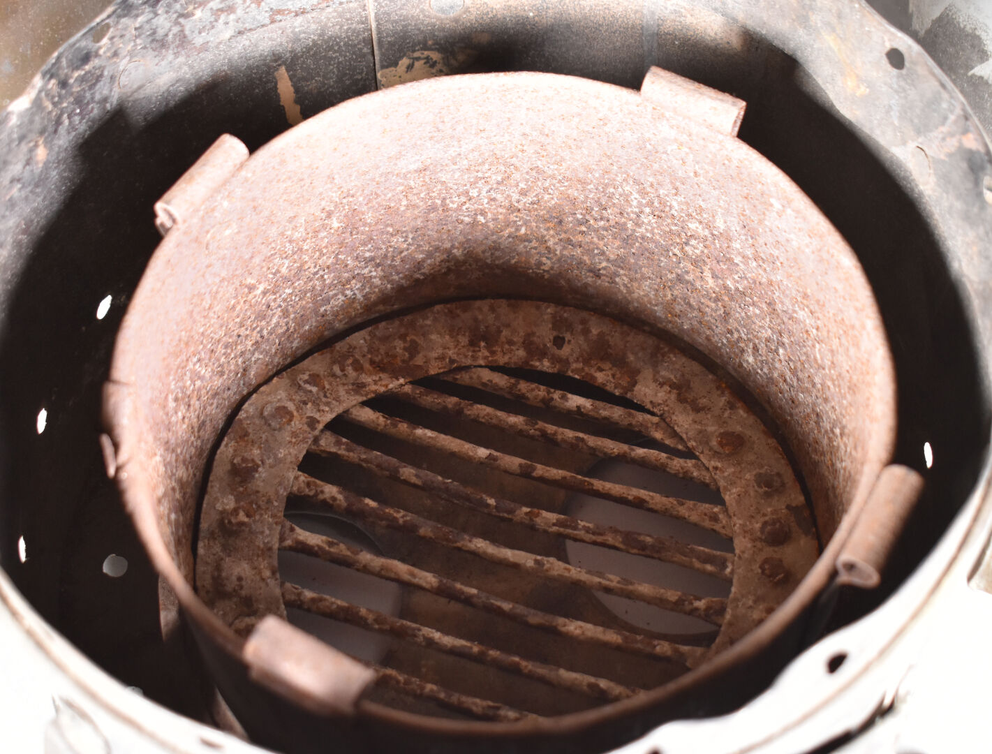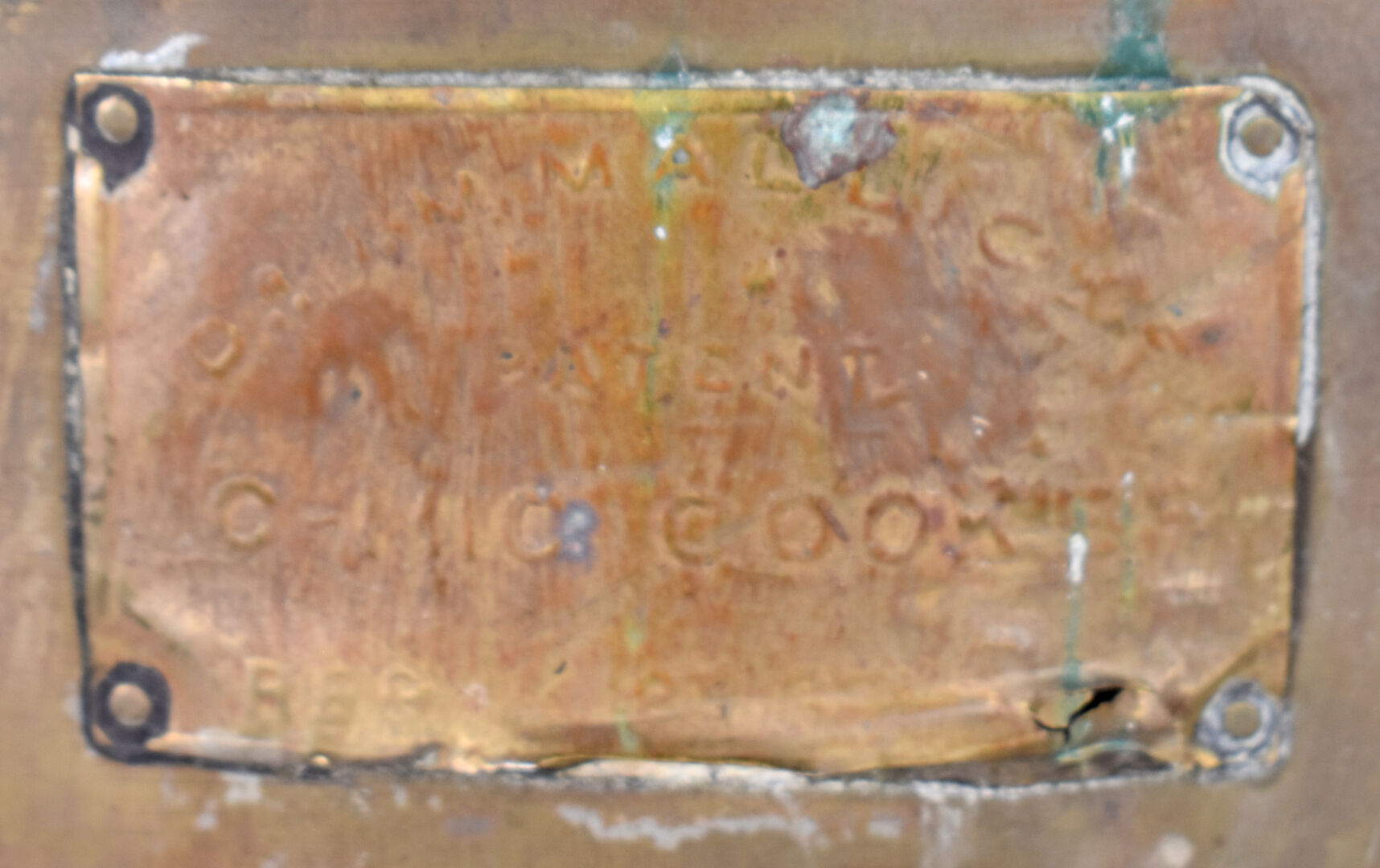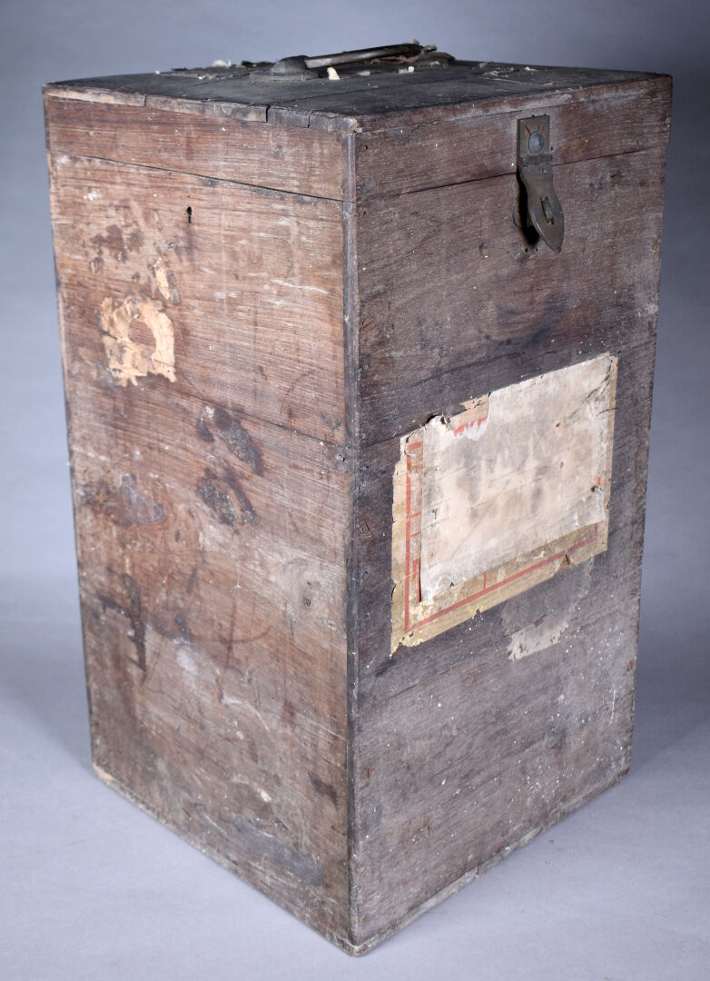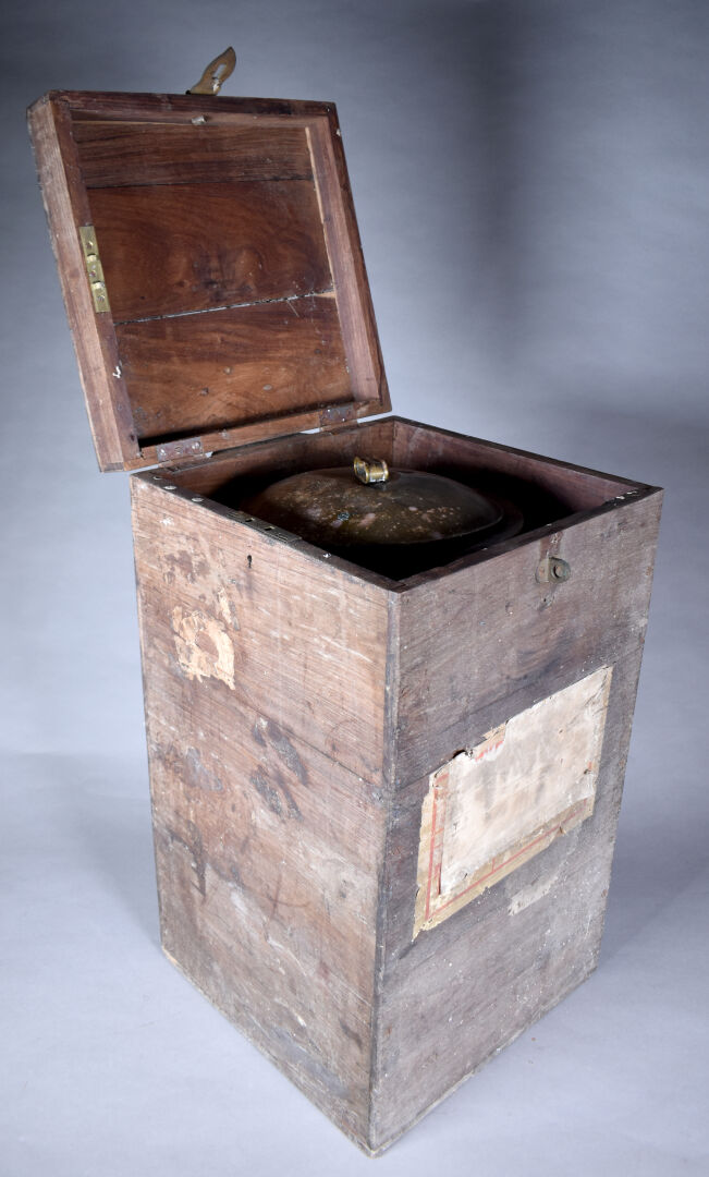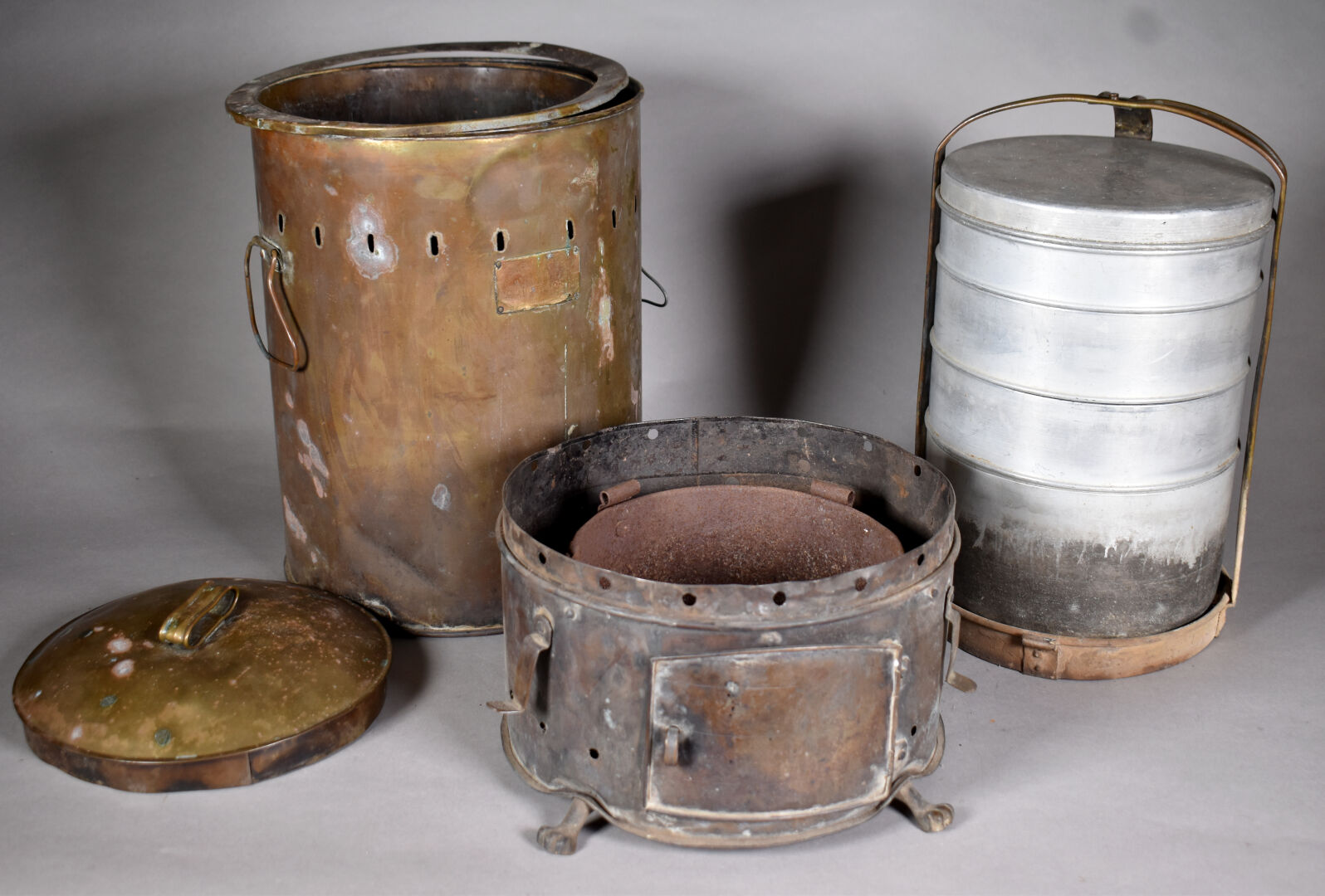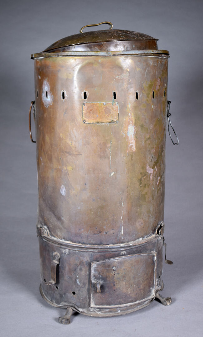 Poêle à charbon pour cuisinier en campagne en feuilles de laiton soudées et roulées. Quatre pieds léonins. Dans sa boîte de transport comportant beaucoup d’étiquettes de voyage. Etat 2-.
