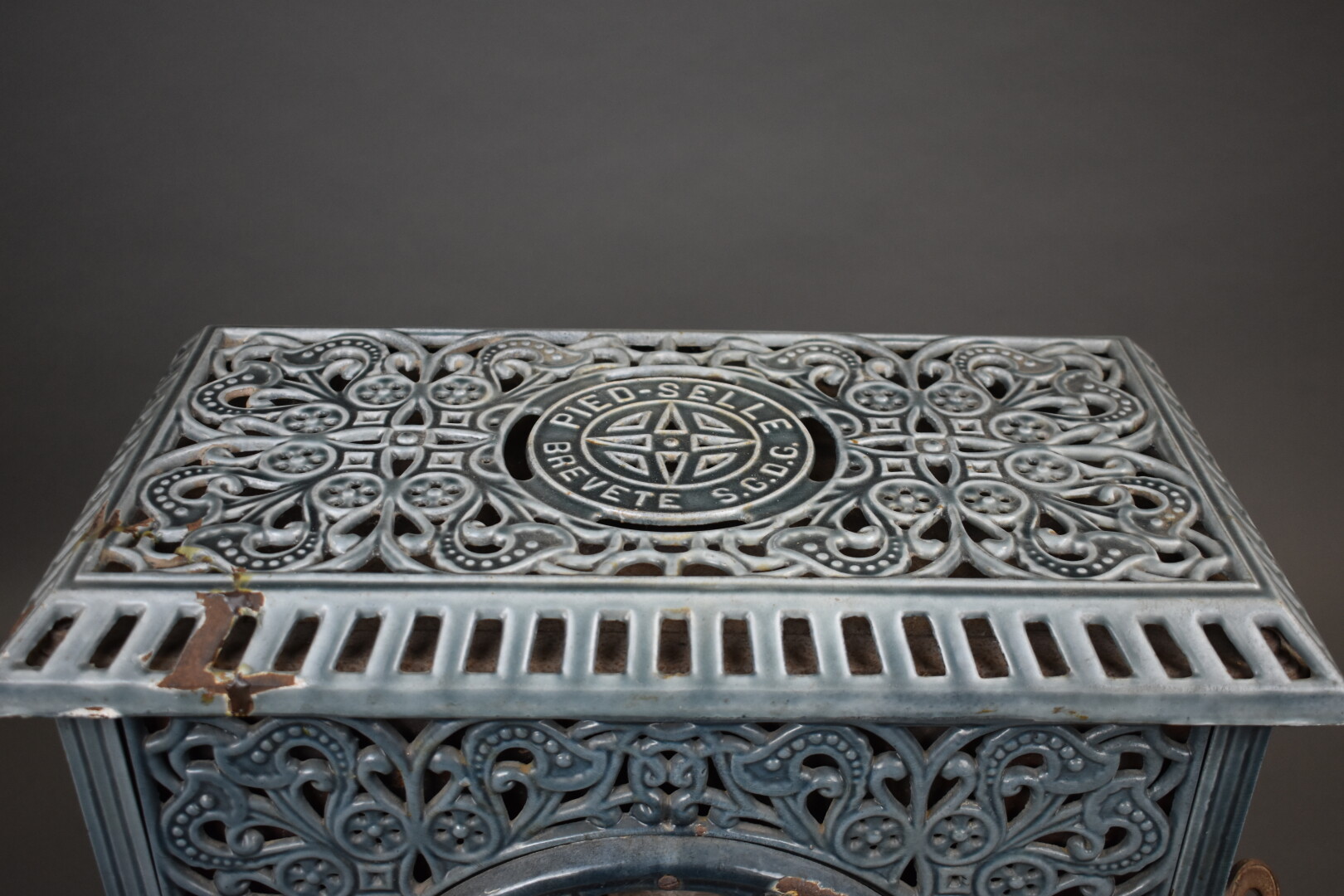 Poele en faïence bleue « Pied-selle brevete S.G.D.G ». Haut. : 53 cm – Larg. : 55 cm- Prof. : 29 cm.
