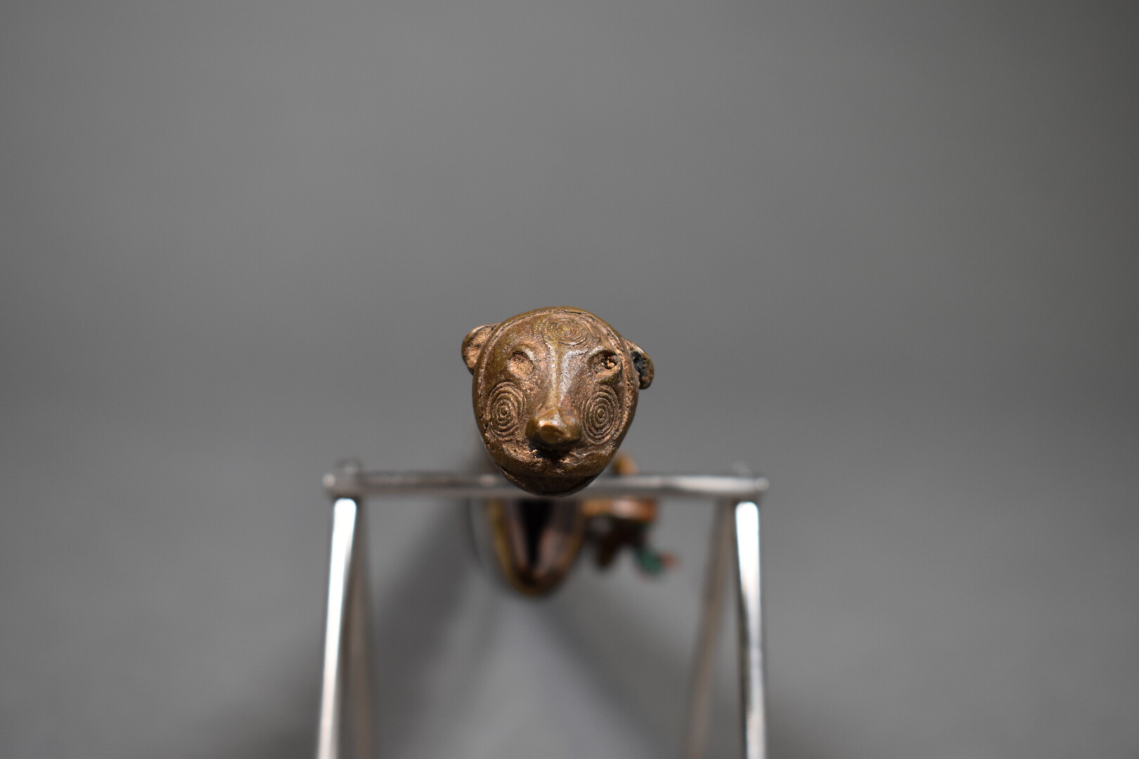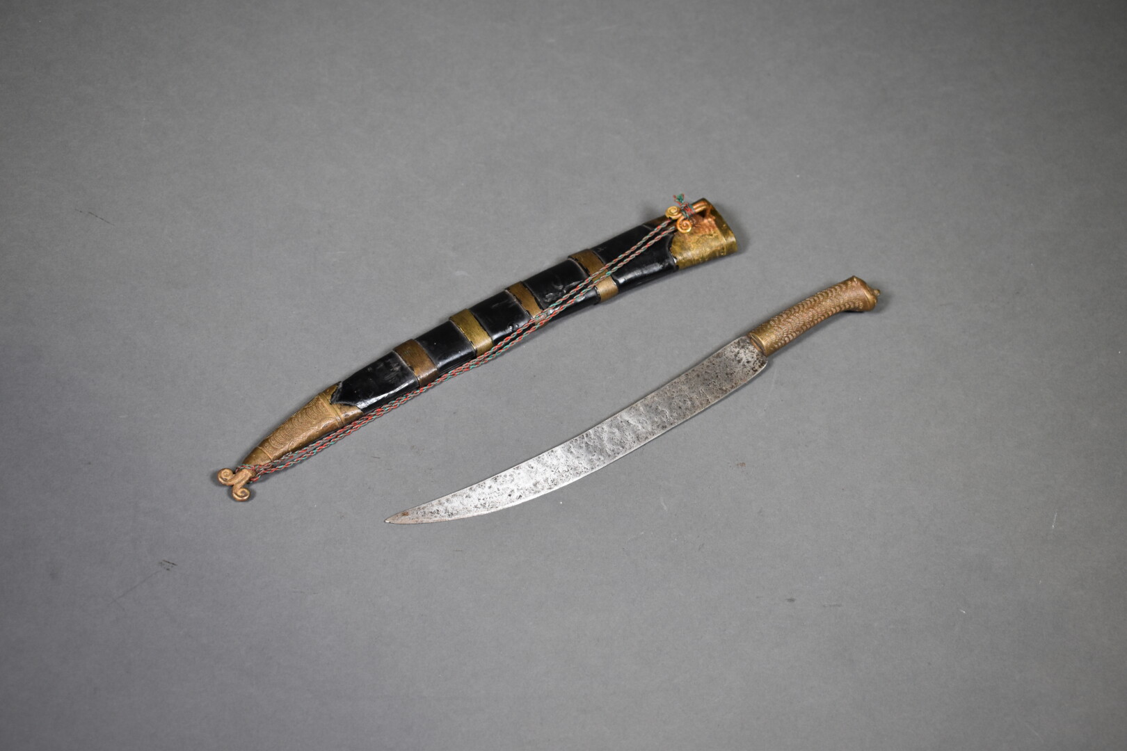 Poignard Inde (?) fusée bronze à pommeau zoomorphe (tête de lion). Lame plate courbe dans un fourreau bois cuir et laiton. Etat 2