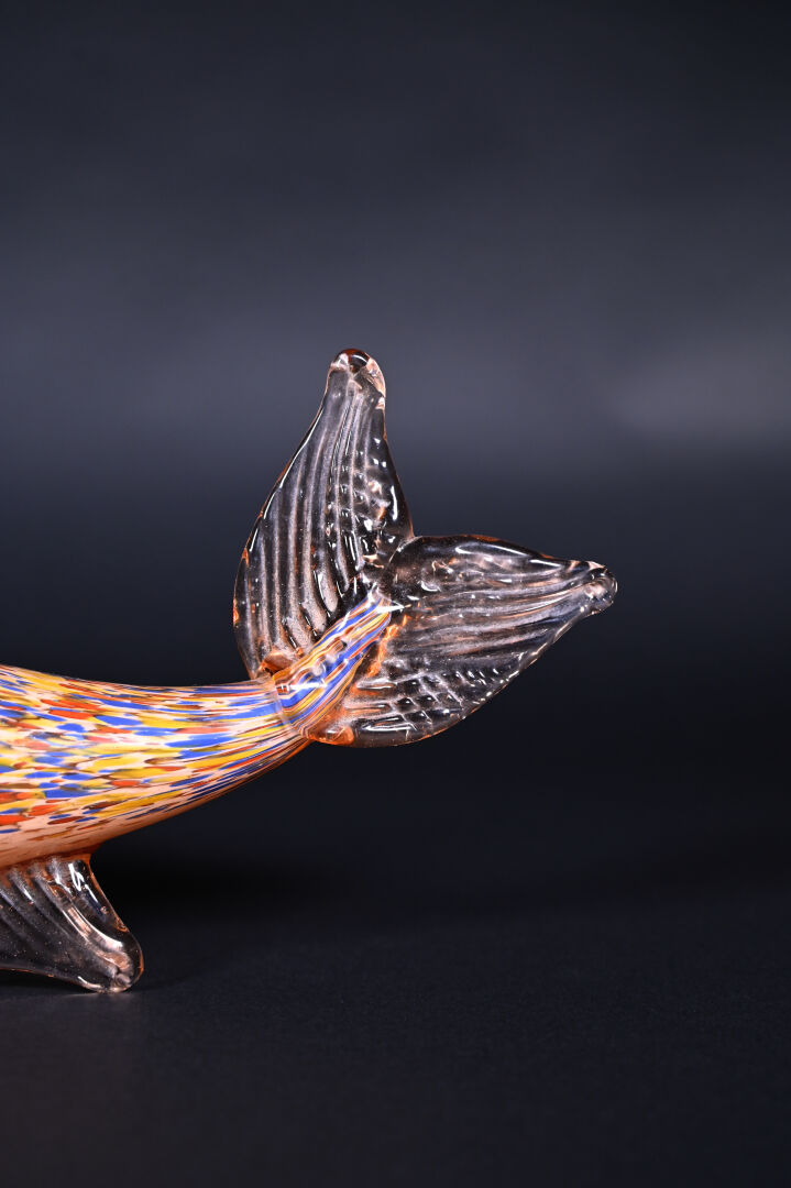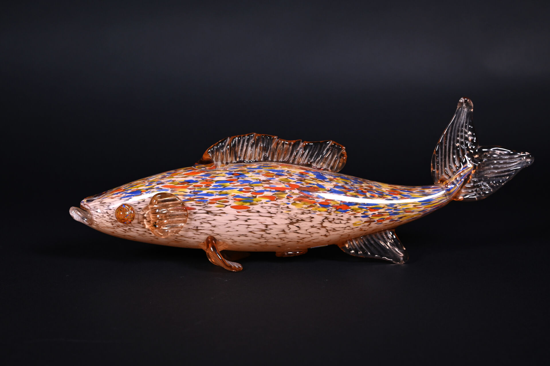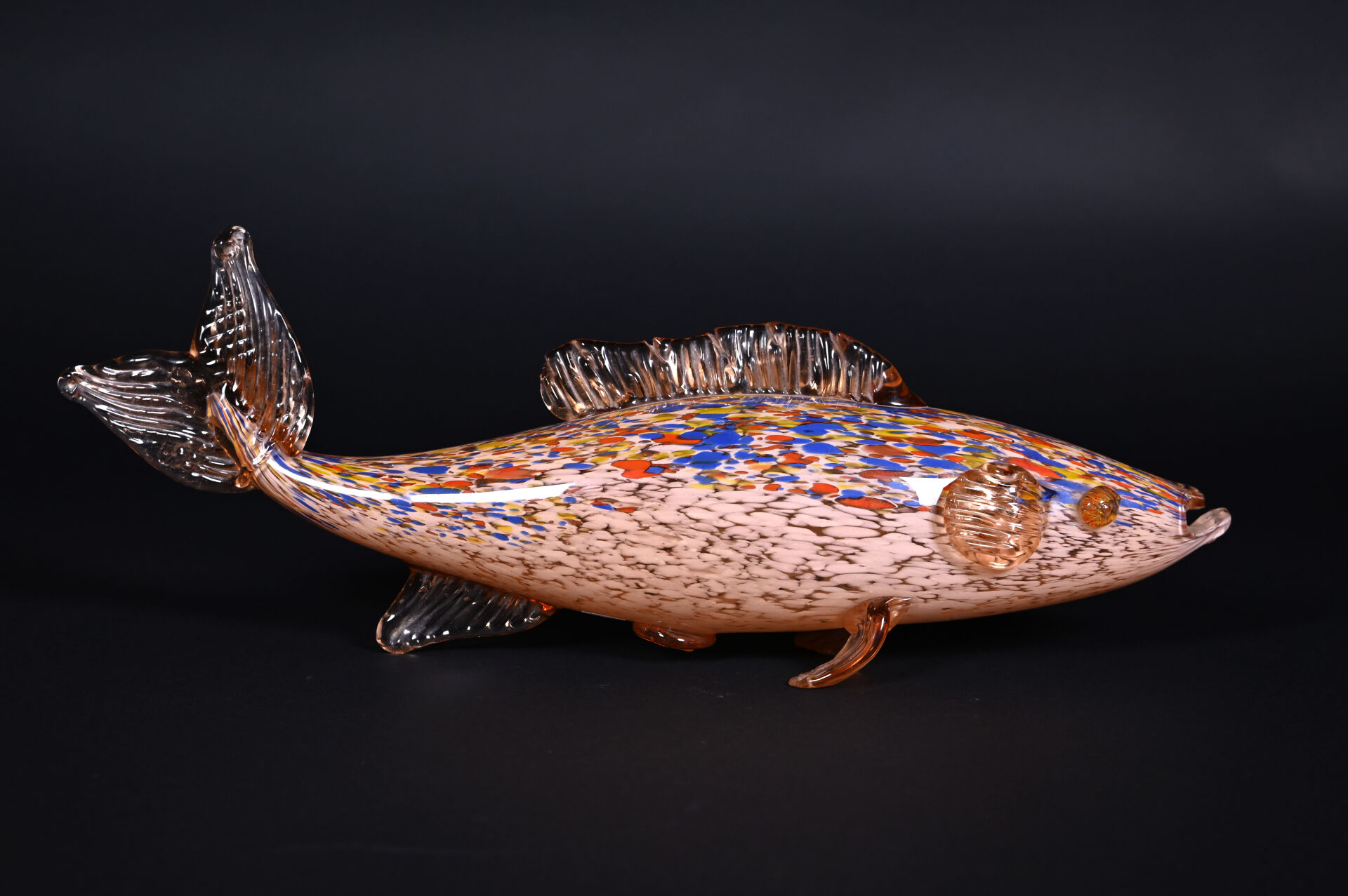 Poisson en verre marmoréen rouge, jaune, bleu et blanc. Murano, XXe sicèle. Haut. : 16 cm – Long. : 44 cm.