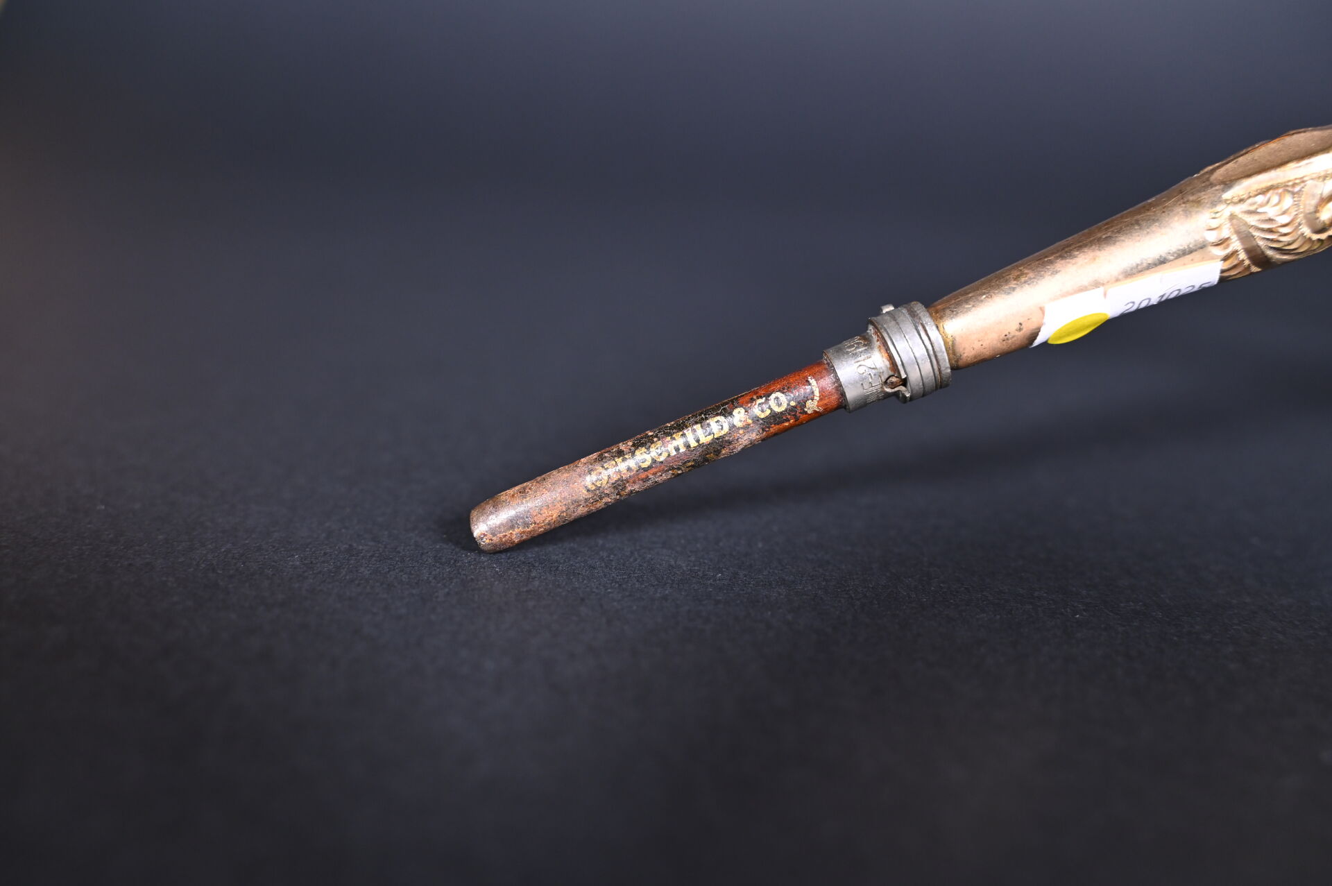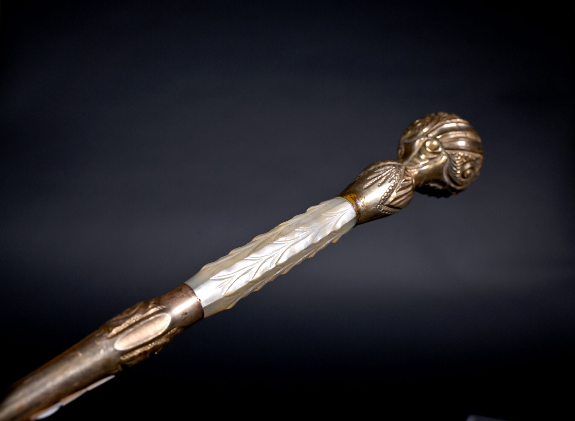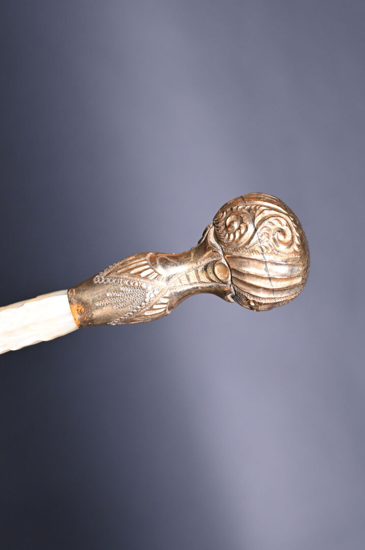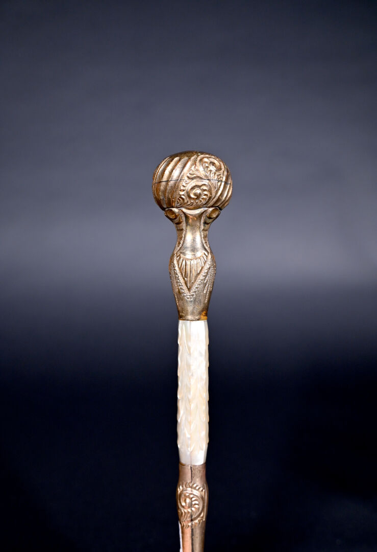 Pommeau de canne en métal doré et nacre sculptée. Marquée « ROTHSCHILD & Co ». Chiffré D.C. Long. : 29,5 cm.