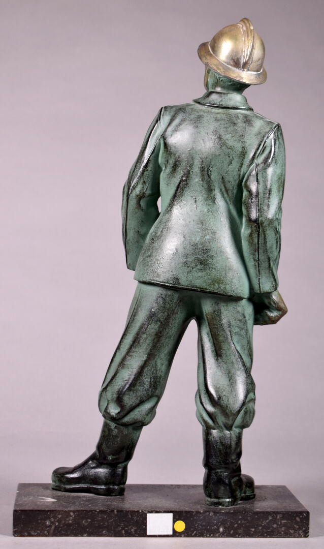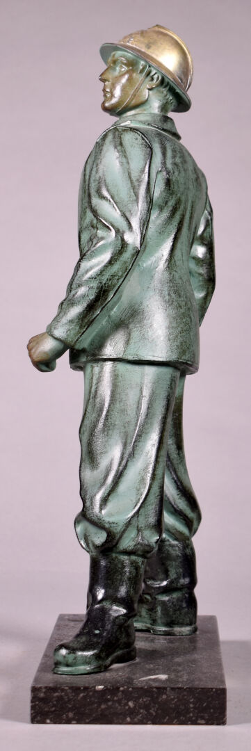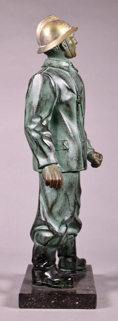 Pompier en régule patiné vert et or (quelques usures). Socle de marbre noir. Haut. : 43 cm.