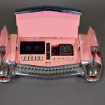 POPWORKS. Radio lecteur cassette modèle 3-1489 figurant la calandre arrière d’une Cadillac Eldorado 1959 rose (légèrement insolé, un feu ne s’allumant pas). Vers 1990. Haut. : 24 cm – Larg. : 52,5 cm.