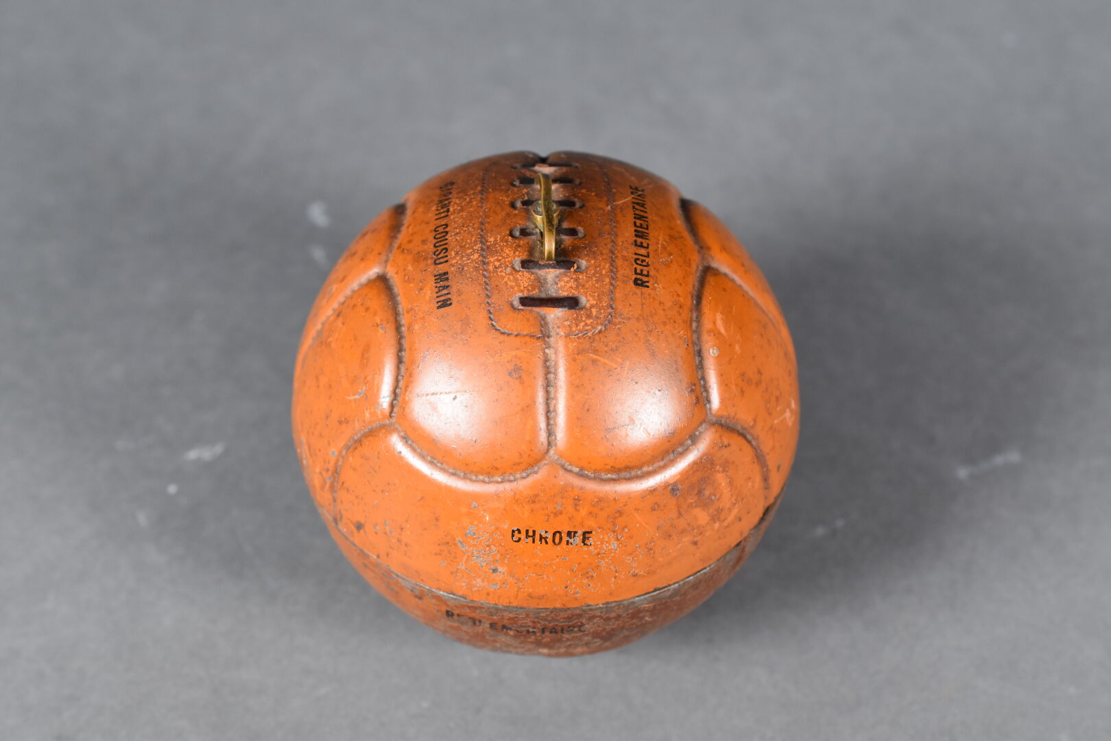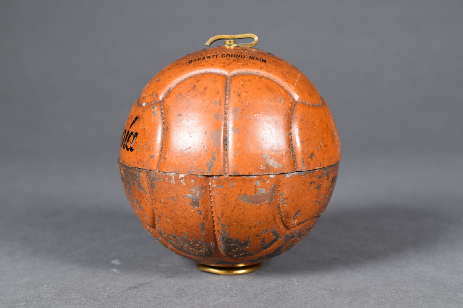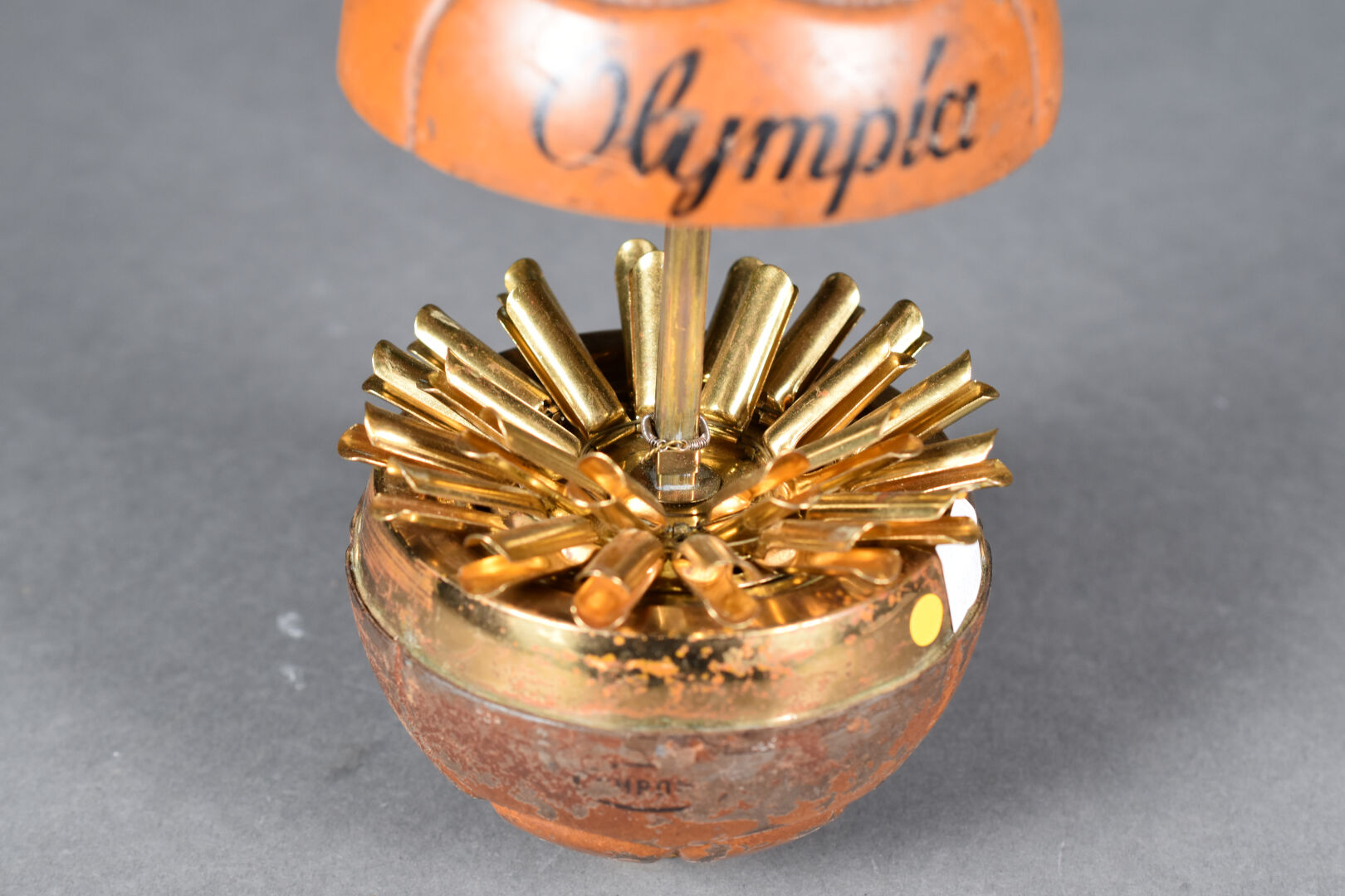 Porte cigarettes publicitaire Olympia en métal figurant un ballon de handball. Haut. maximale : 21 cm.