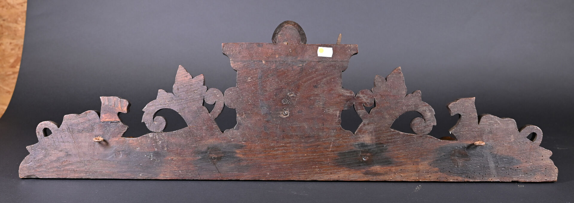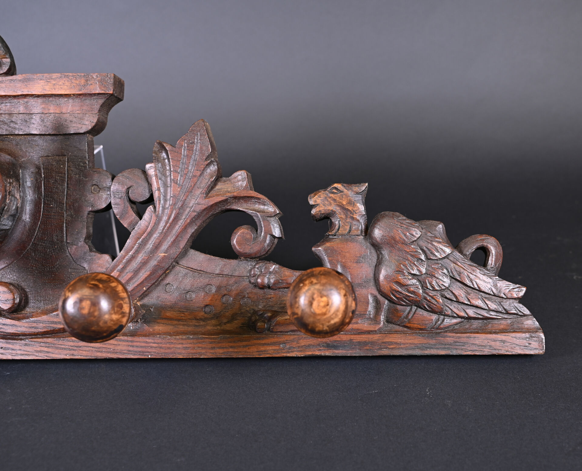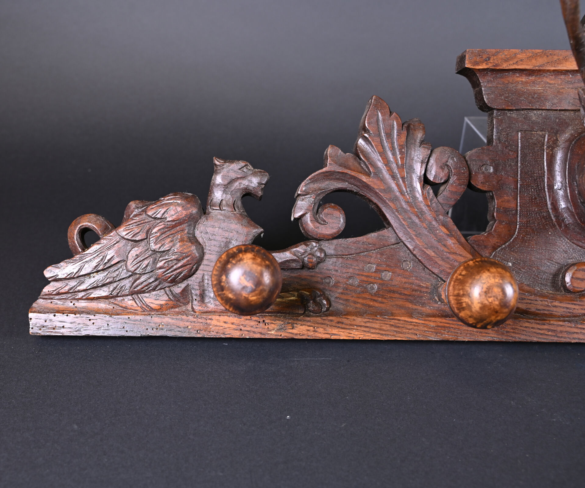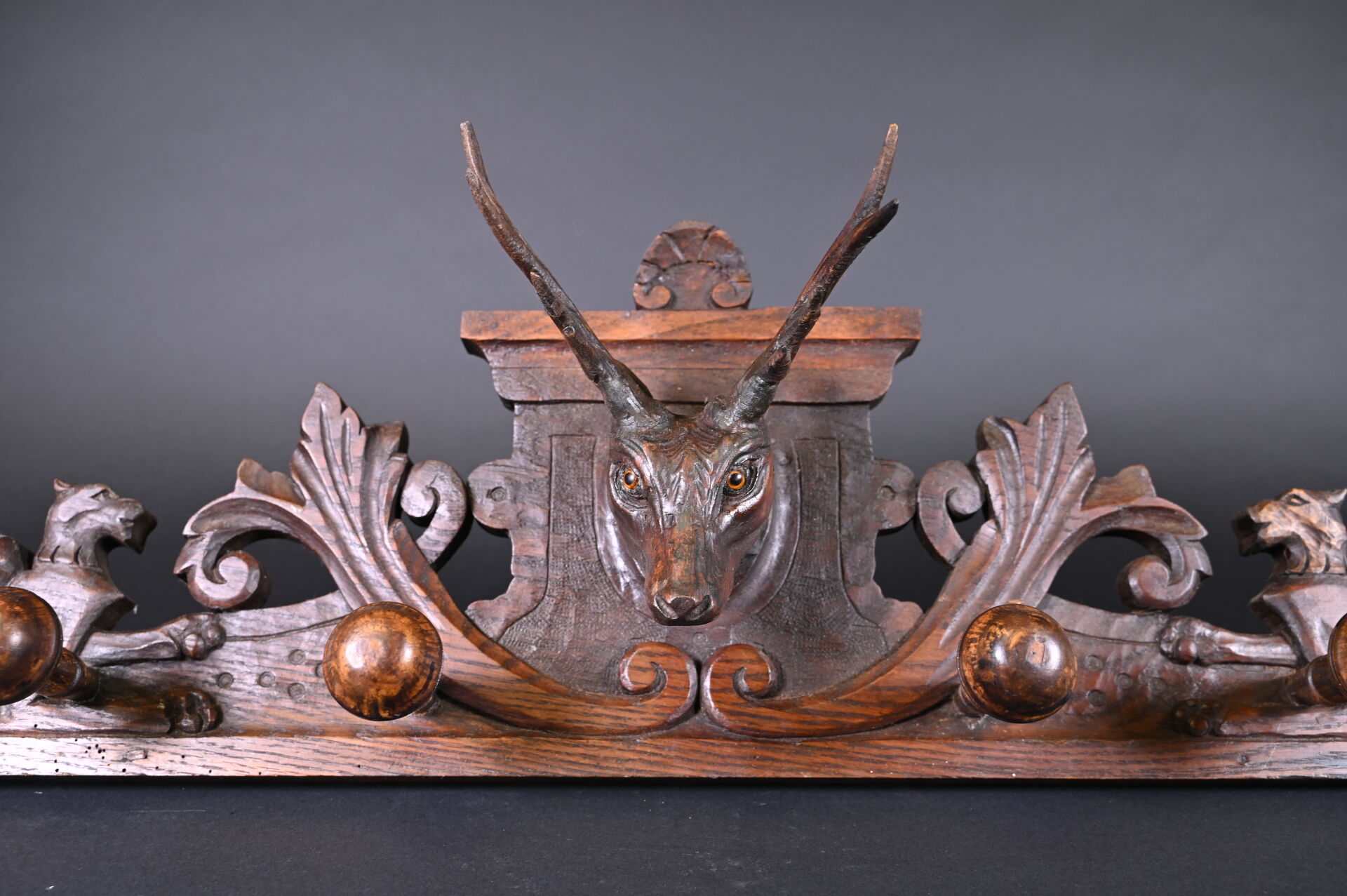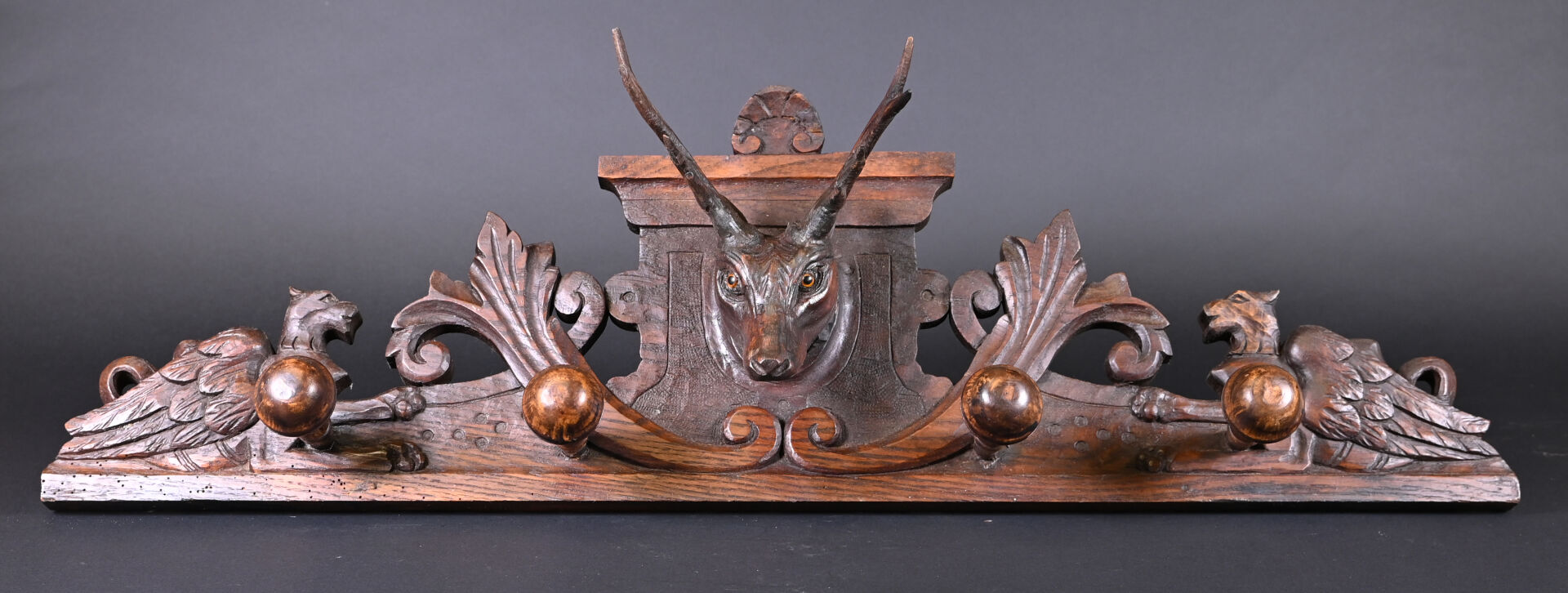 Porte manteau d’applique à quatre patères en bois sculpté orné d’un trophée de cerf aux yeux en sulfure. Travail de la forêt noire, XXe siècle. Haut. : 28,5 cm – Long. : 93 cm.