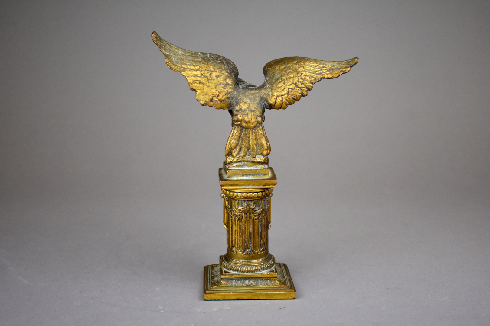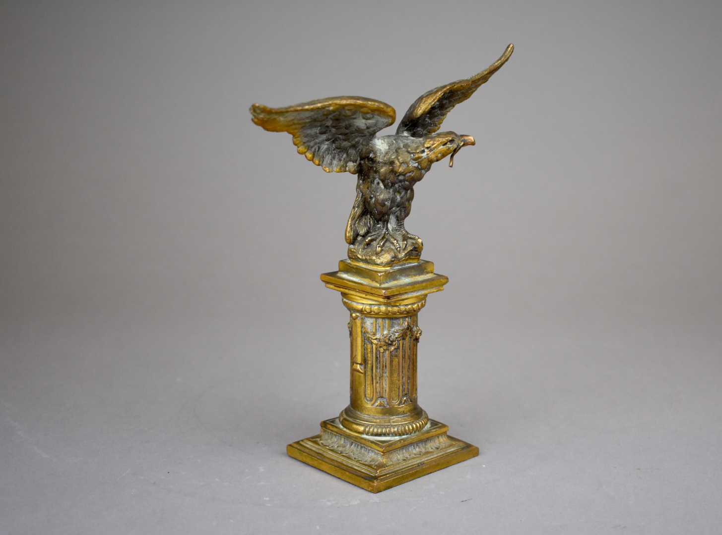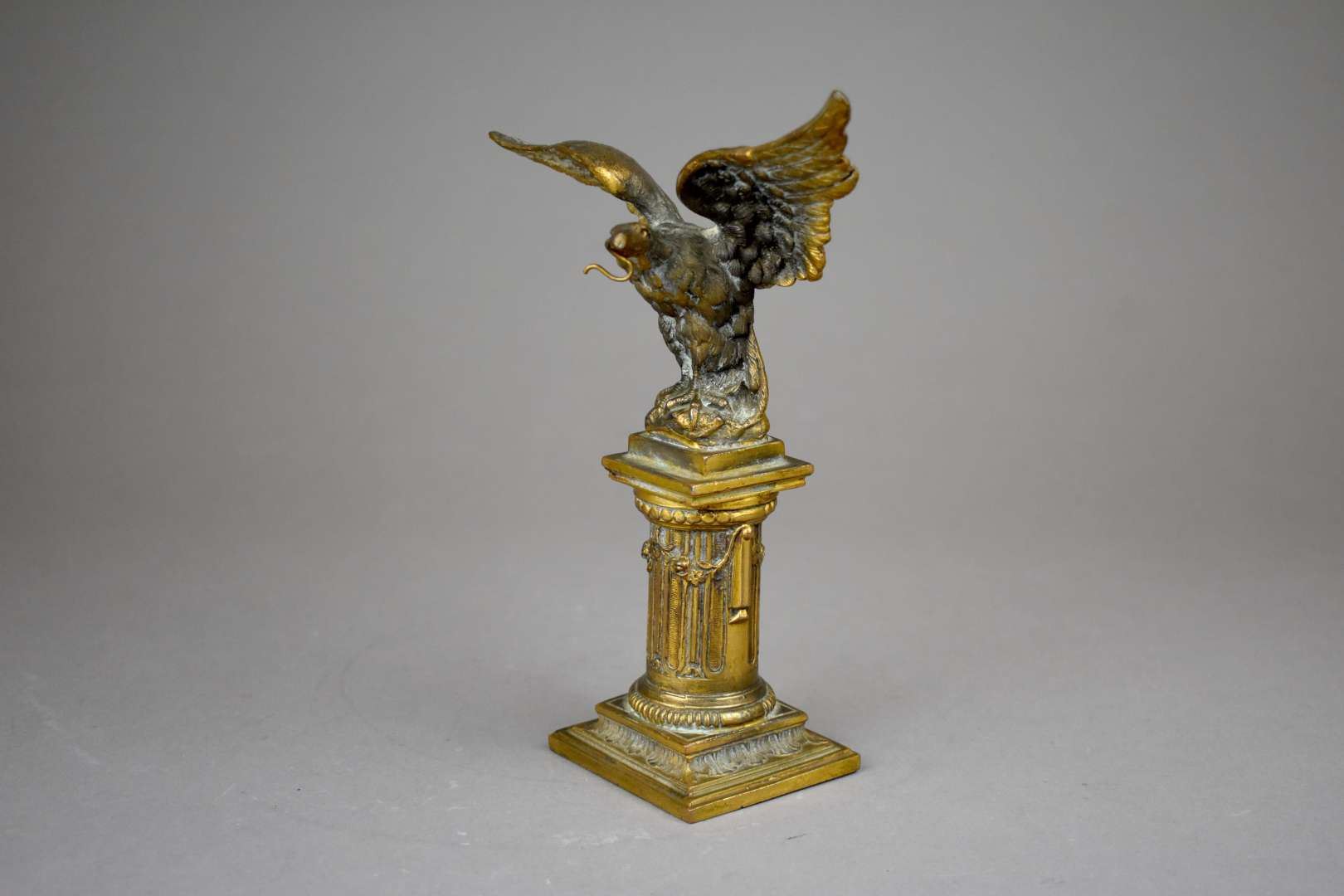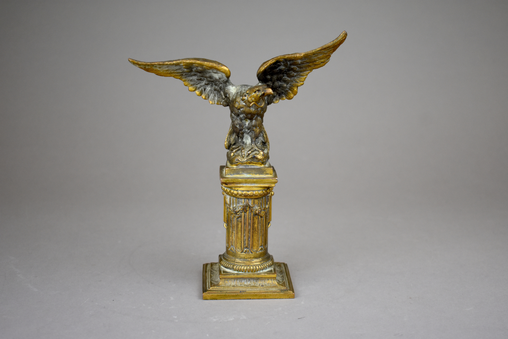 Porte-montre en bronze ciselé doré à décor d’un aigle reposant sur une colonne cannelée à guirlandes de fleurs (usures à la dorure). Seconde moitié du XIXe siècle. Haut. : 20,5 cm.