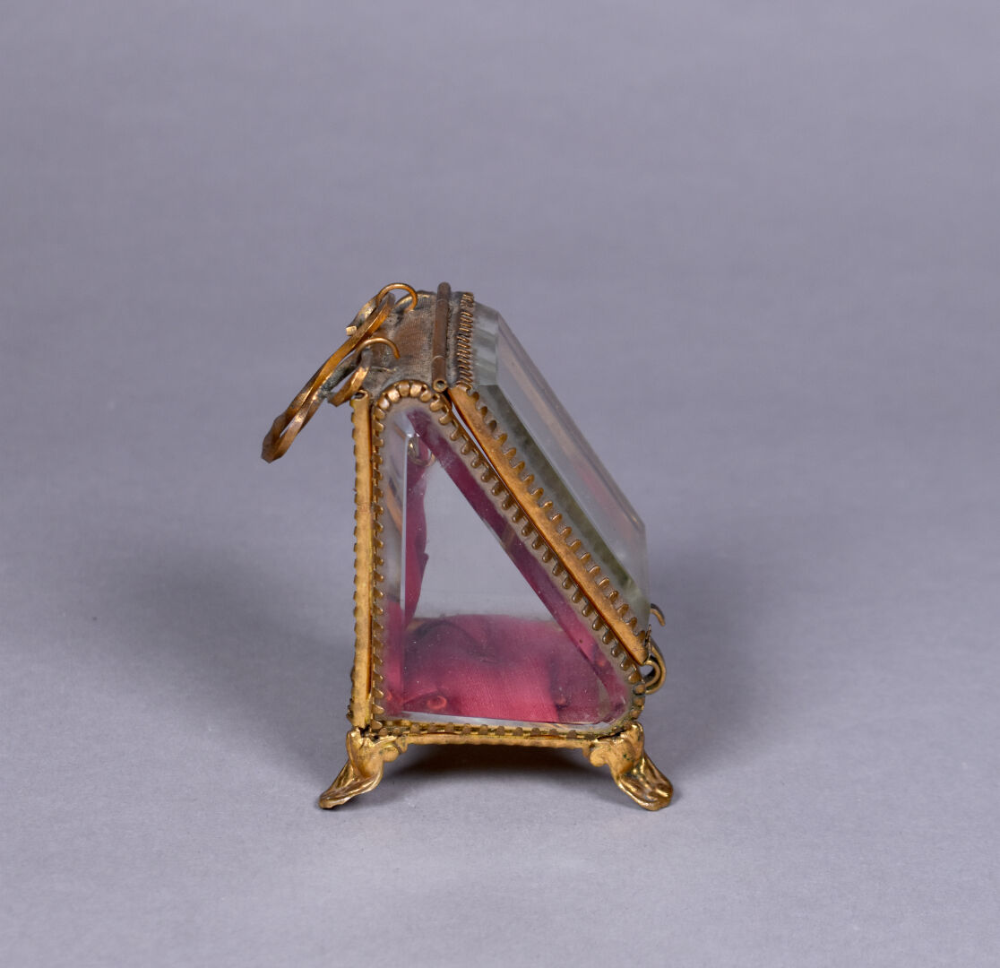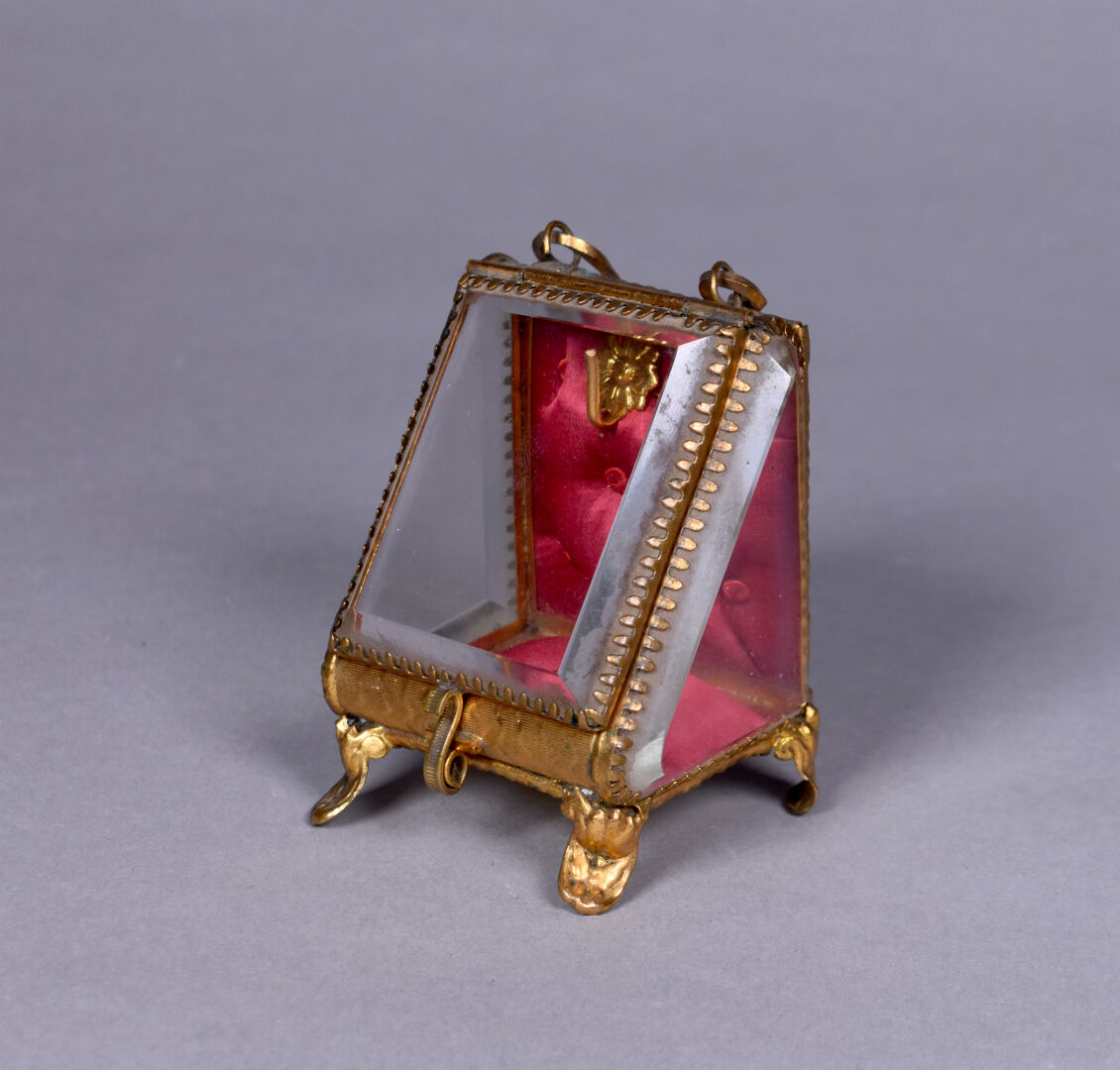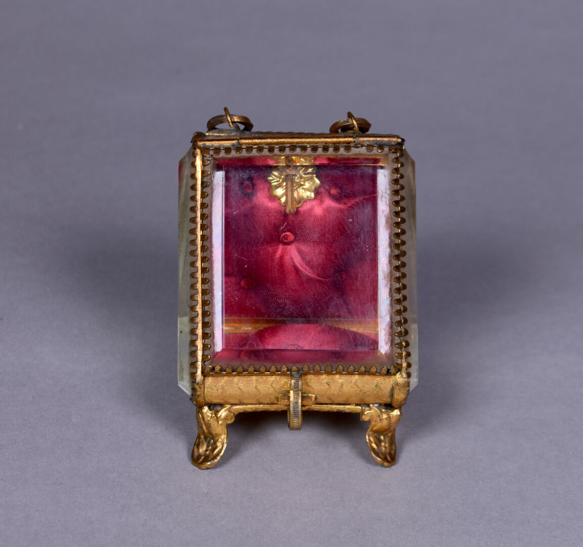 Porte-montre en cristal et métal doré. Intérieur garni de satin rouge capitonné. Fin du XIXe ou début du XXe siècle. Haut. : 9 cm.