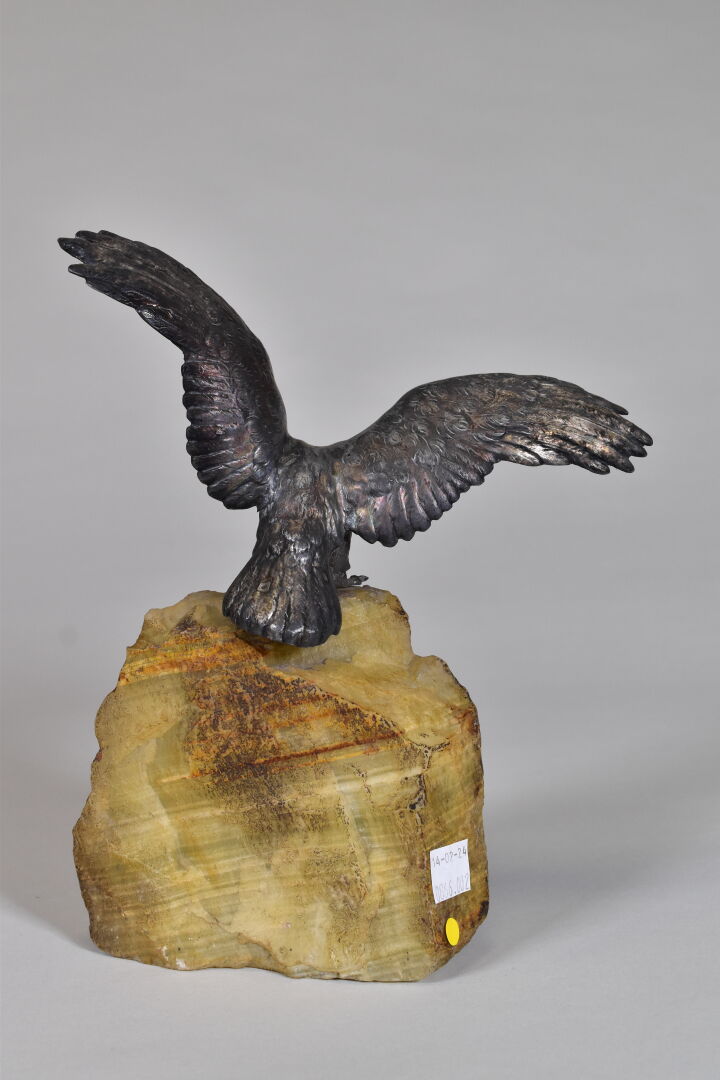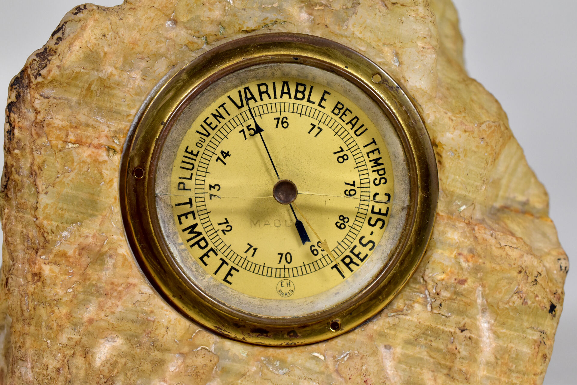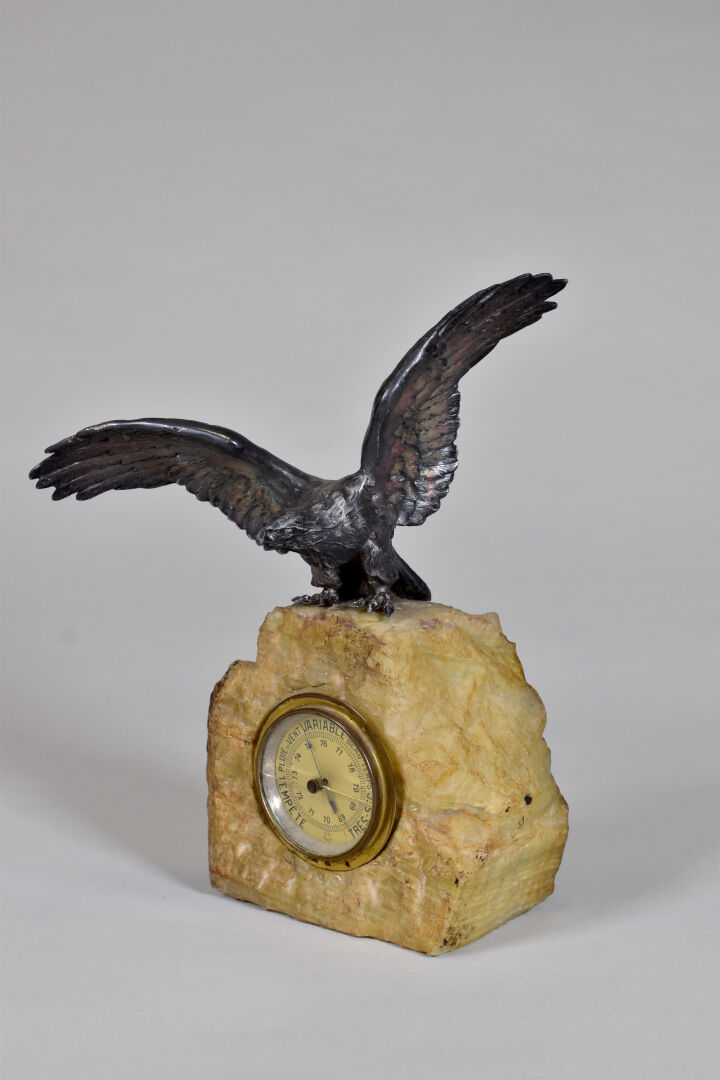 Porte montre en régule et albâtre représentant un aigle sur un rocher (manque le crochet). Avec baromètre (verre félé). Haut. : 23,5 cm.