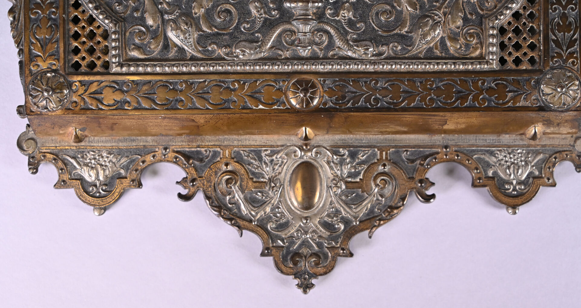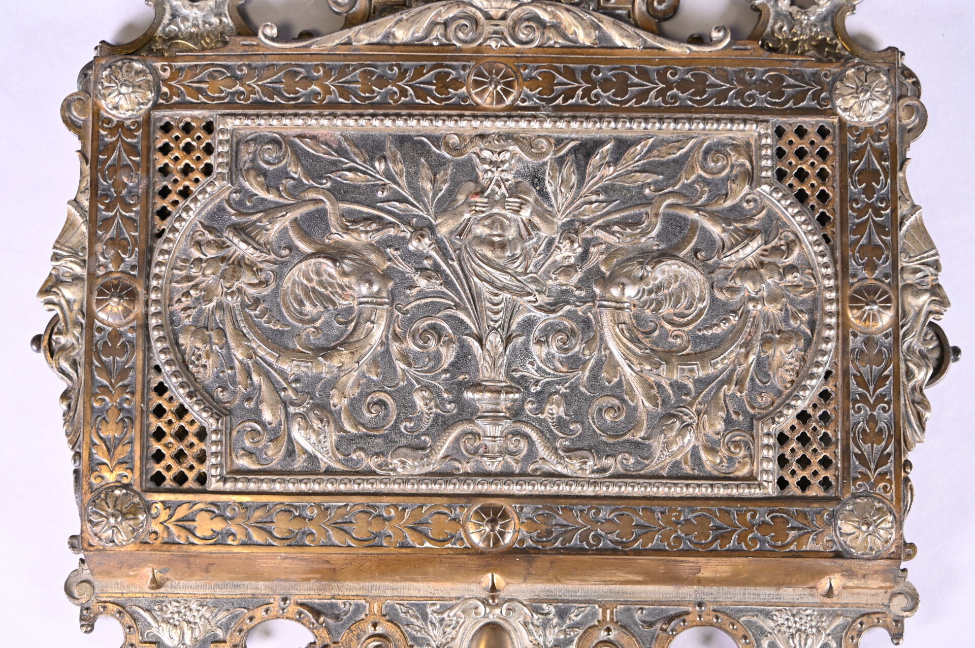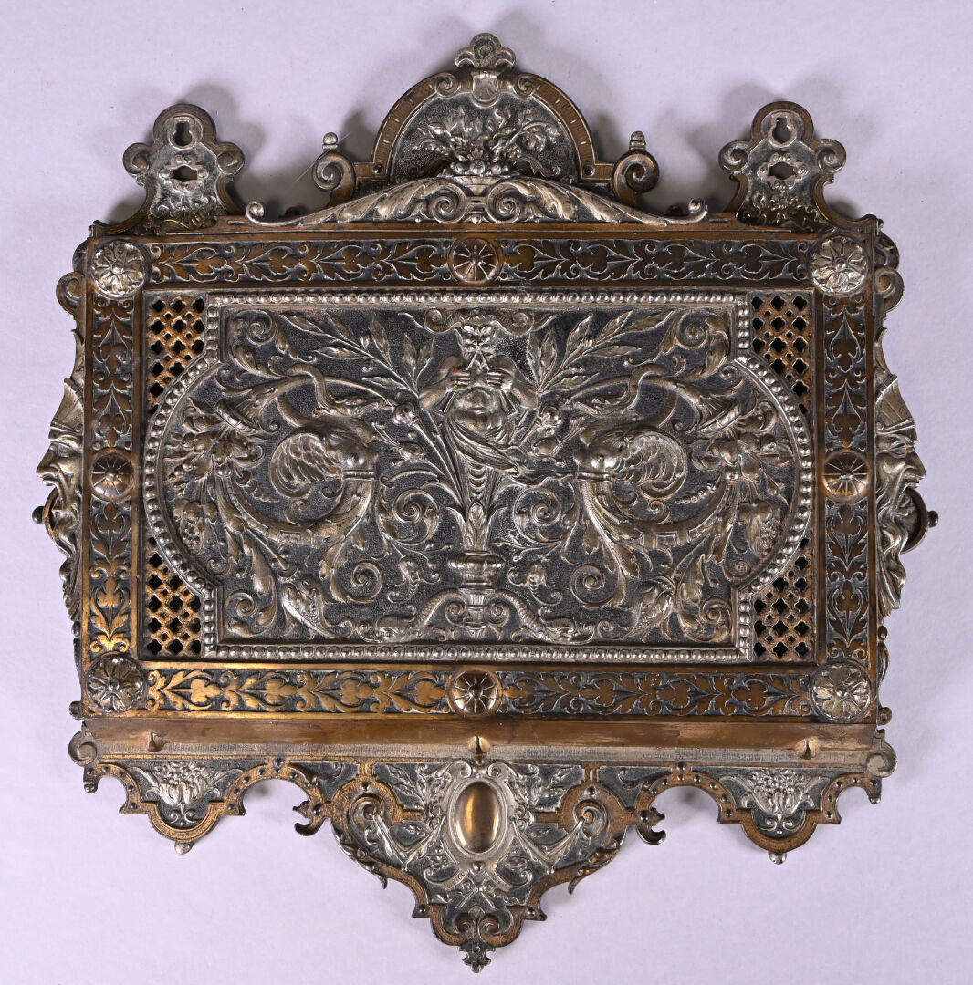 Porte revues d’applique en métal patiné argenté et anciennement doré à décor d’un satyre flutiste, entrelacs feuillagés, animaux fantastiques et mascarons (usures, deux vis accidentées). Au dos, cachet au rouet. Probablement Allemagne, fin du XIXe siècle.