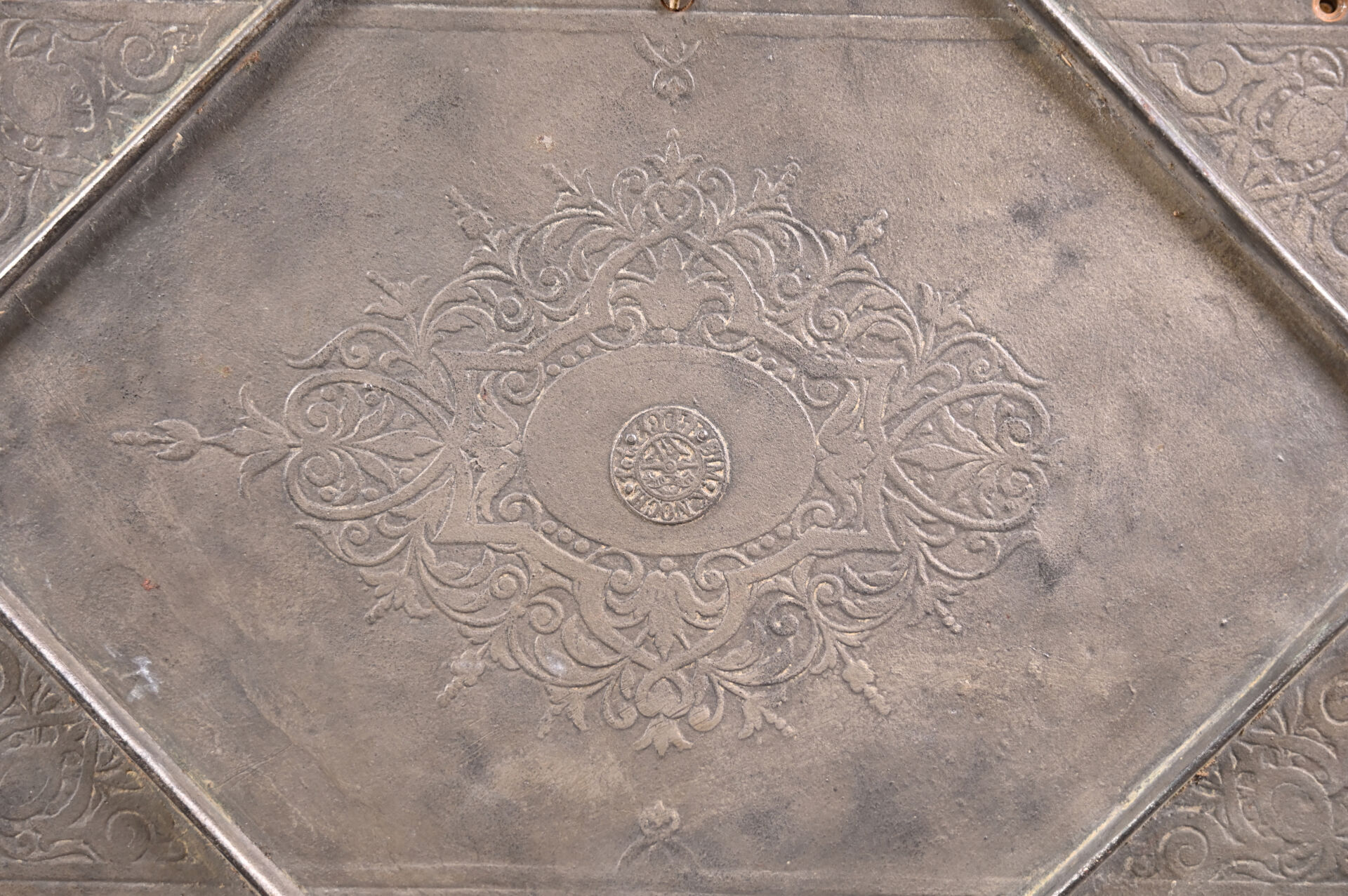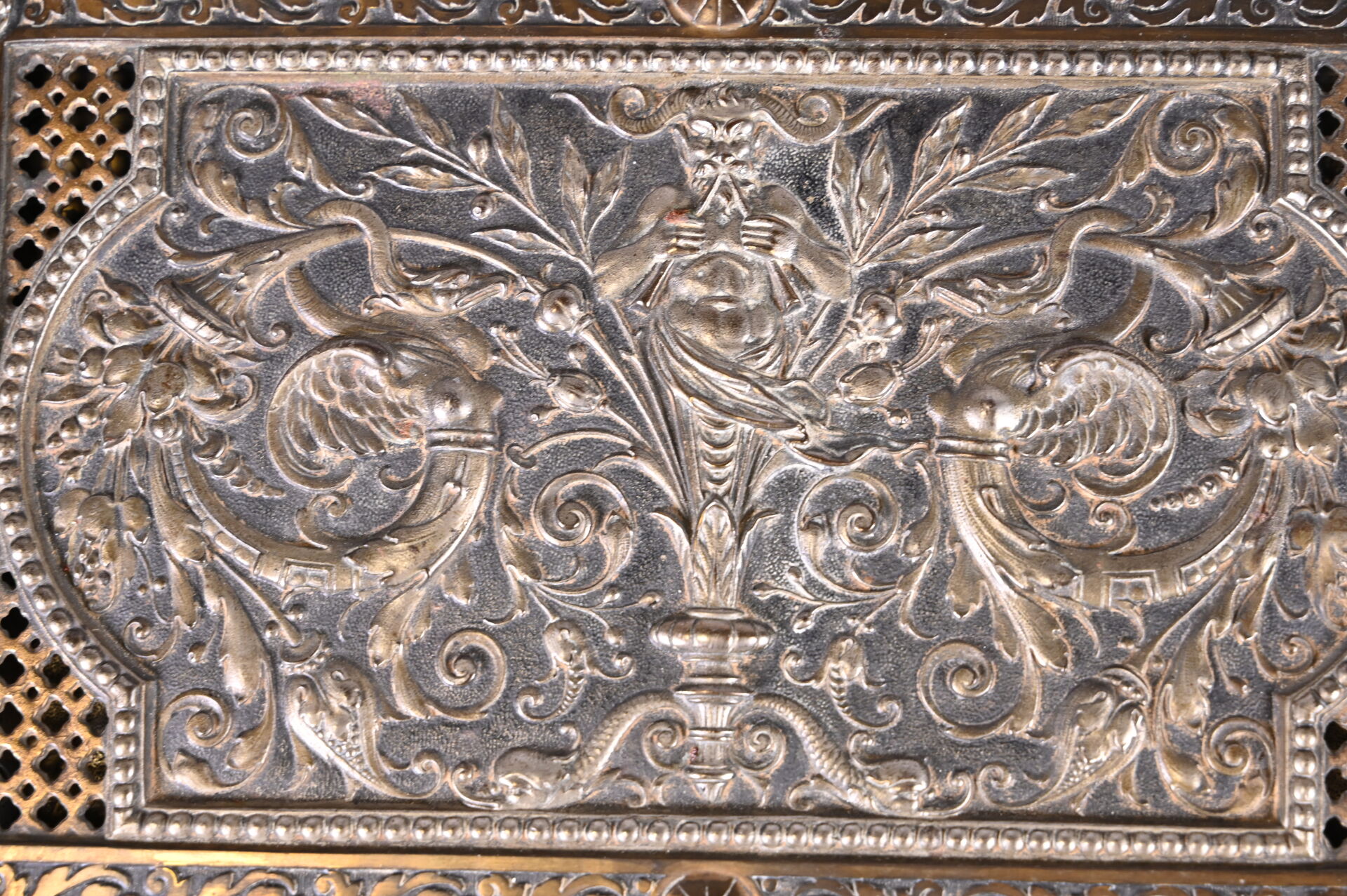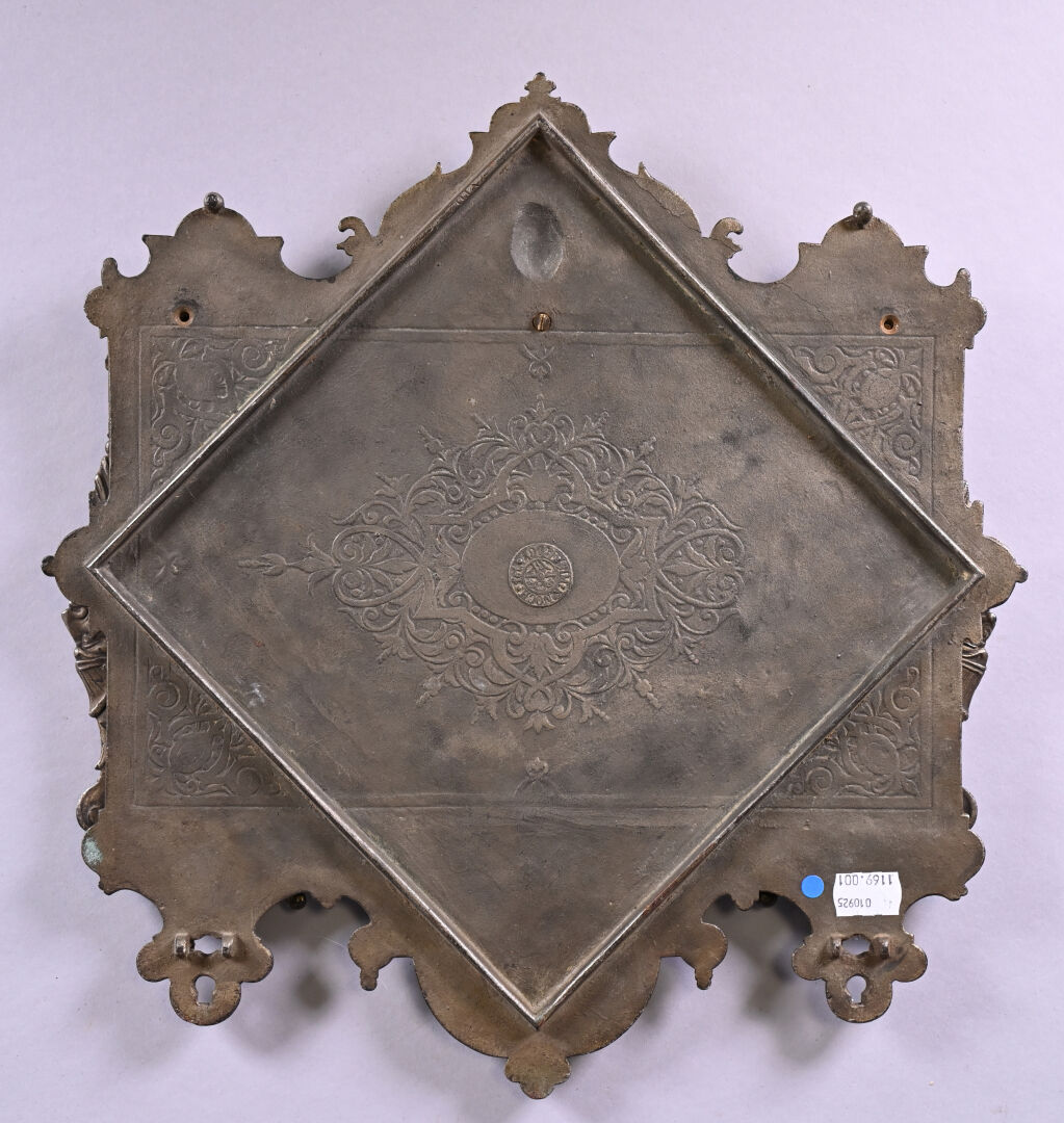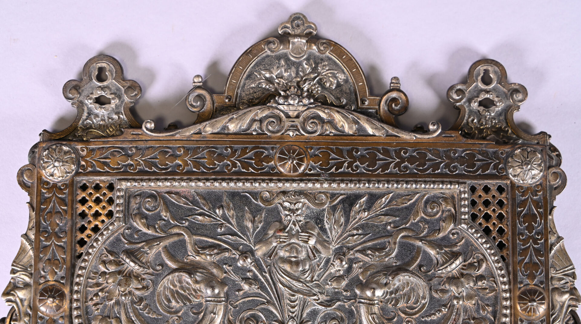 Porte revues d’applique en métal patiné argenté et anciennement doré à décor d’un satyre flutiste, entrelacs feuillagés, animaux fantastiques et mascarons (usures, deux vis accidentées). Au dos, cachet au rouet. Probablement Allemagne, fin du XIXe siècle.