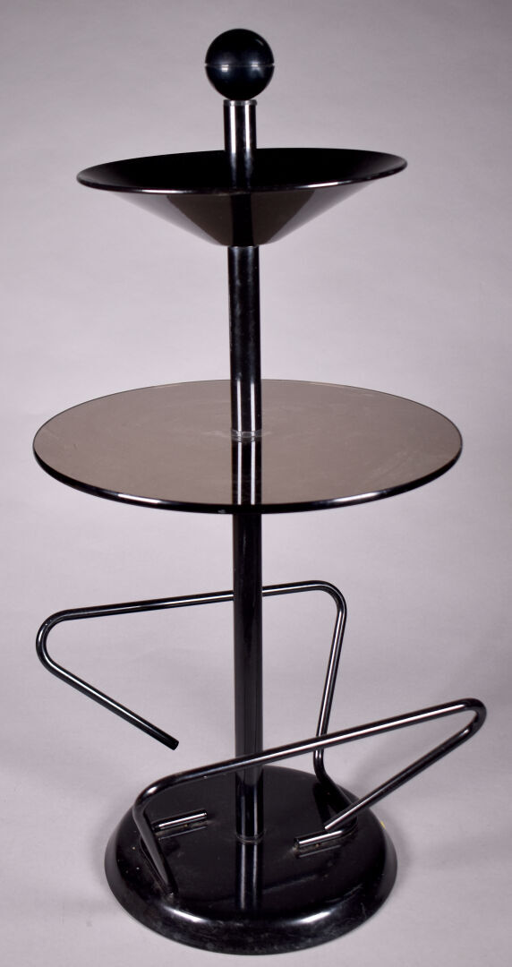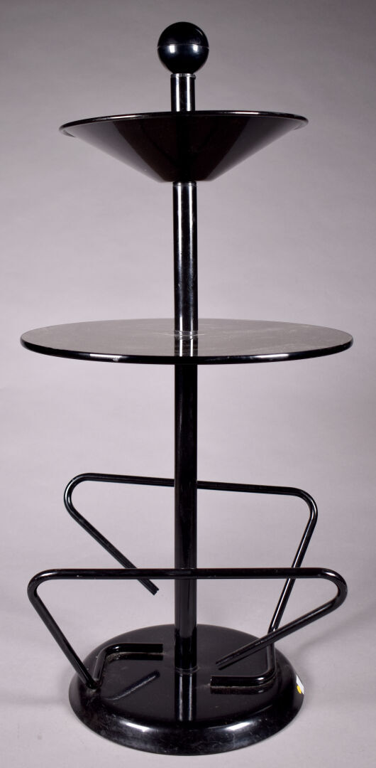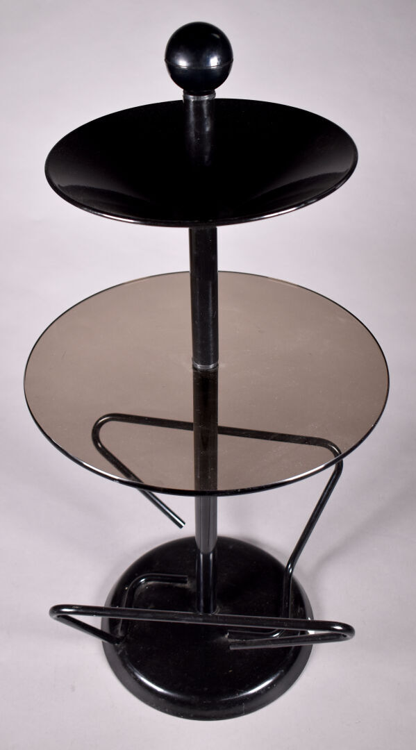 Porte revues en métal laqué noir, plastique et verre fumé à plateaux circulaires. Vers 1980. Haut. : 73 cm.