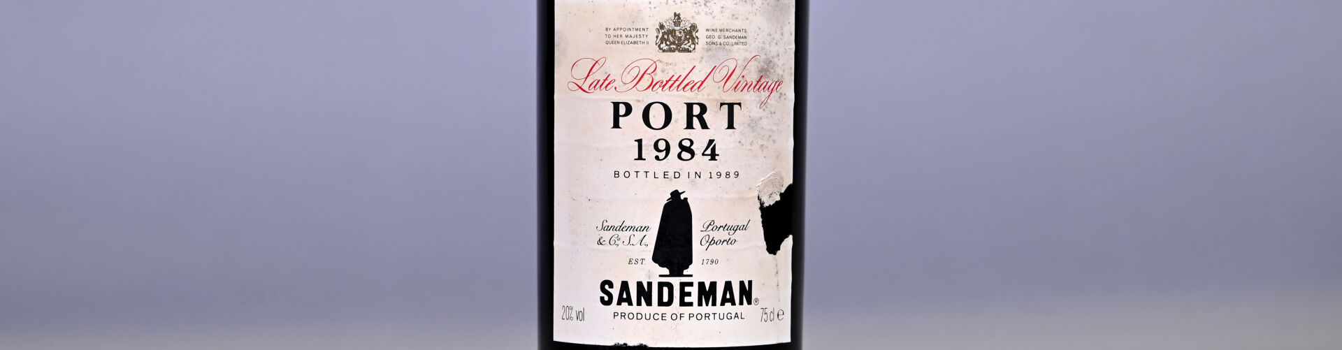 PORTO – 1 bouteille, Porto, Sandeman, Late Bottled Vintage, 1984. Capsule légèrement sale. Etiquette légèrement sale avec des traces d’humidité, une déchirure sur le côté droit et très légèrement abimée au niveau de son bord inférieur.