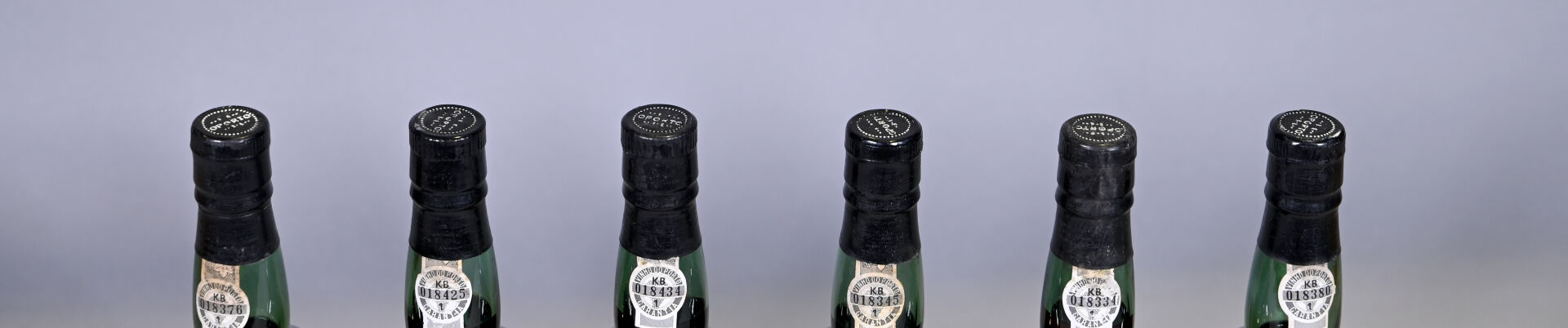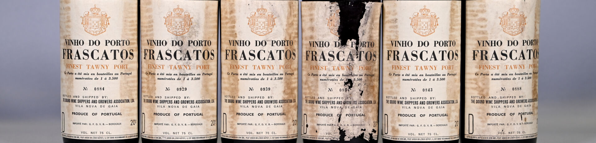 PORTO – 6 bouteilles, Porto, The Douro Wine Shippers and Growers Association, Frascatos, Tawny. Deux niveaux légèrement bas. Capsules légèrement sales. Etiquettes sales dont une est très sale, très dégradée et partiellement décollée.