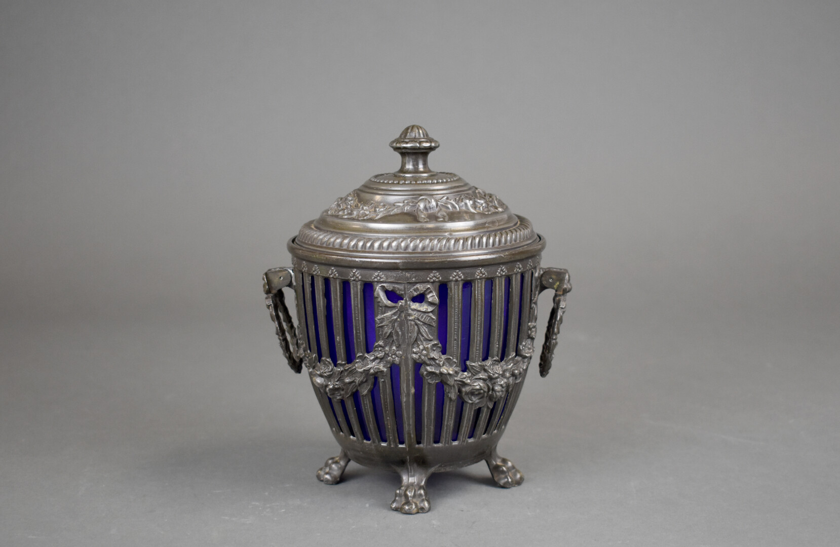 Pot à biscuit à anses en métal à décor ajouré de guirlandes de fleurs et rubans noués. Il repose sur quatre pieds griffe. Intérieur en verre bleu. Style Louis XVI, fin du XIXe siècle. Haut. : 19,5 cm.