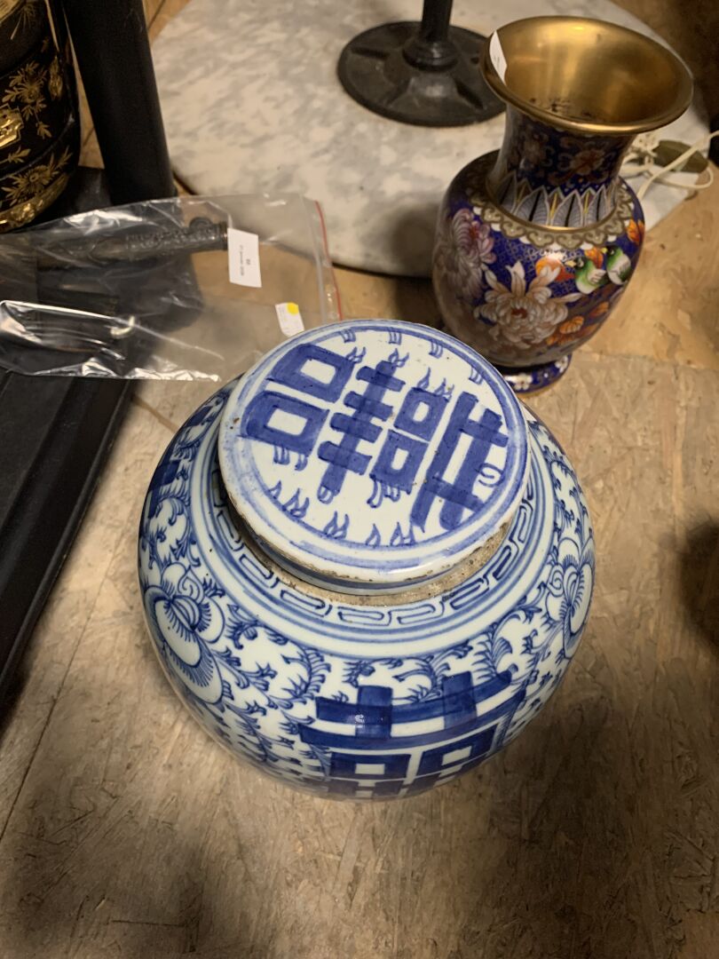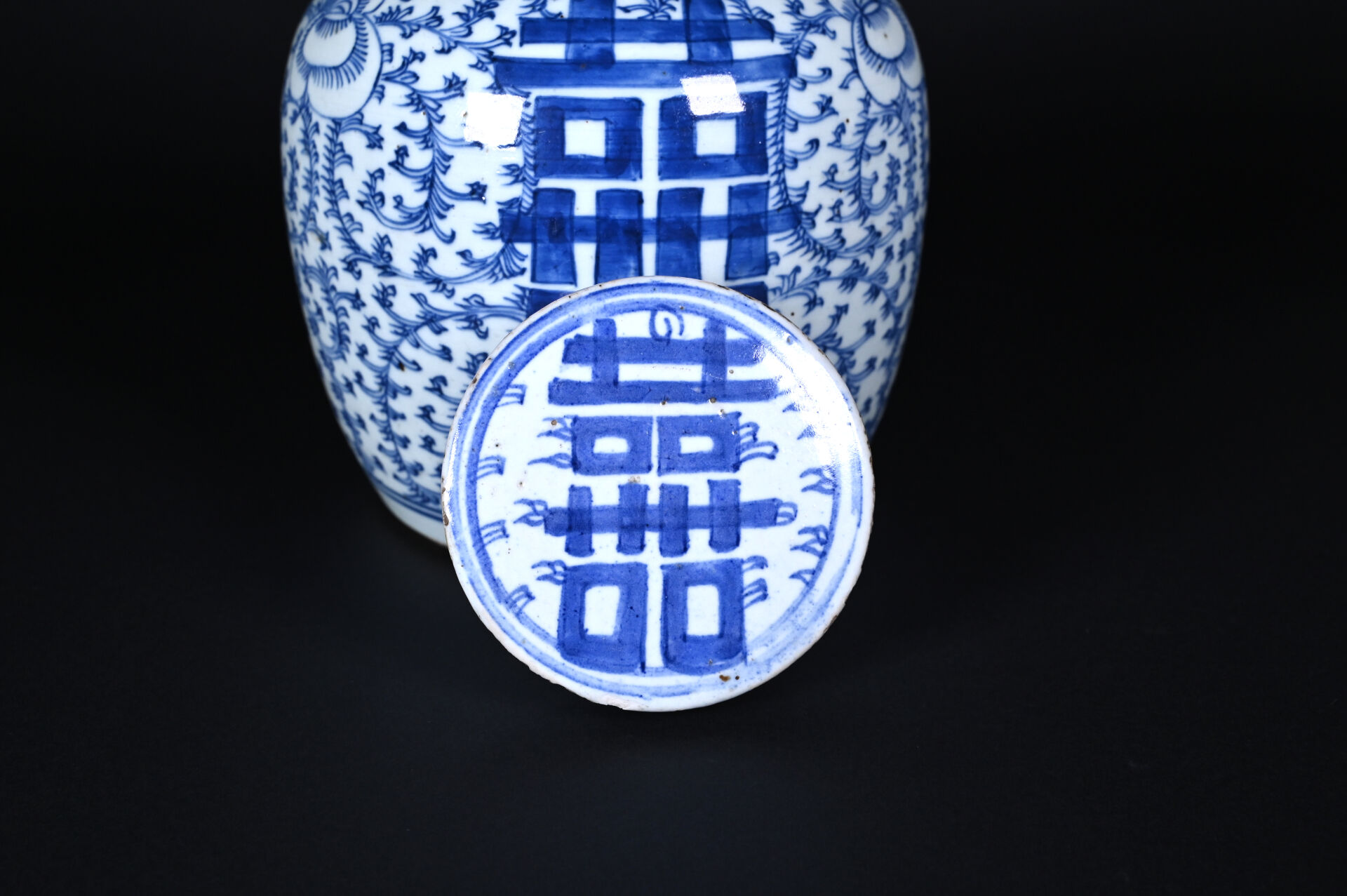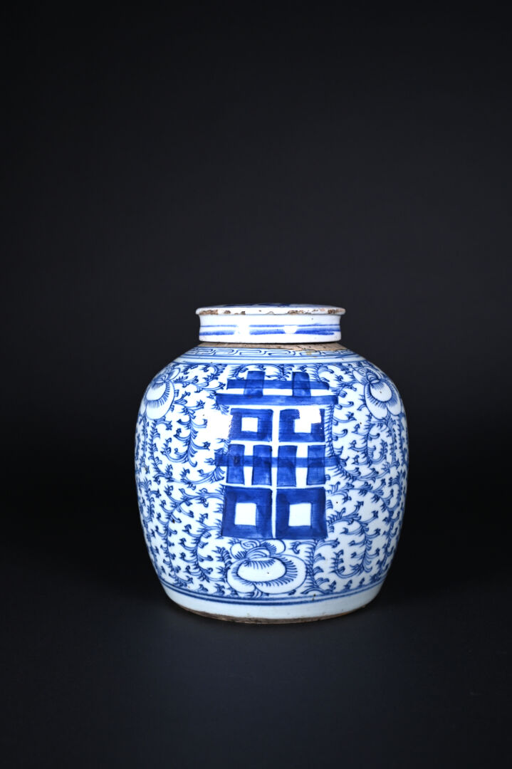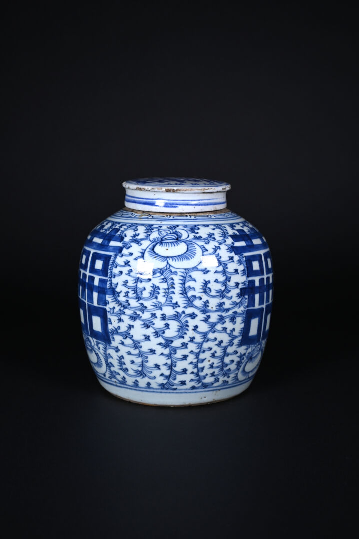 Pot à gingembre et son couvercle en porcelaine à décor en bleu sur fond blanc des symboles du bonheur sur fond d’entrelacs feuillagés. Chine, fin du XIXe siècle. Haut. : 23 cm.