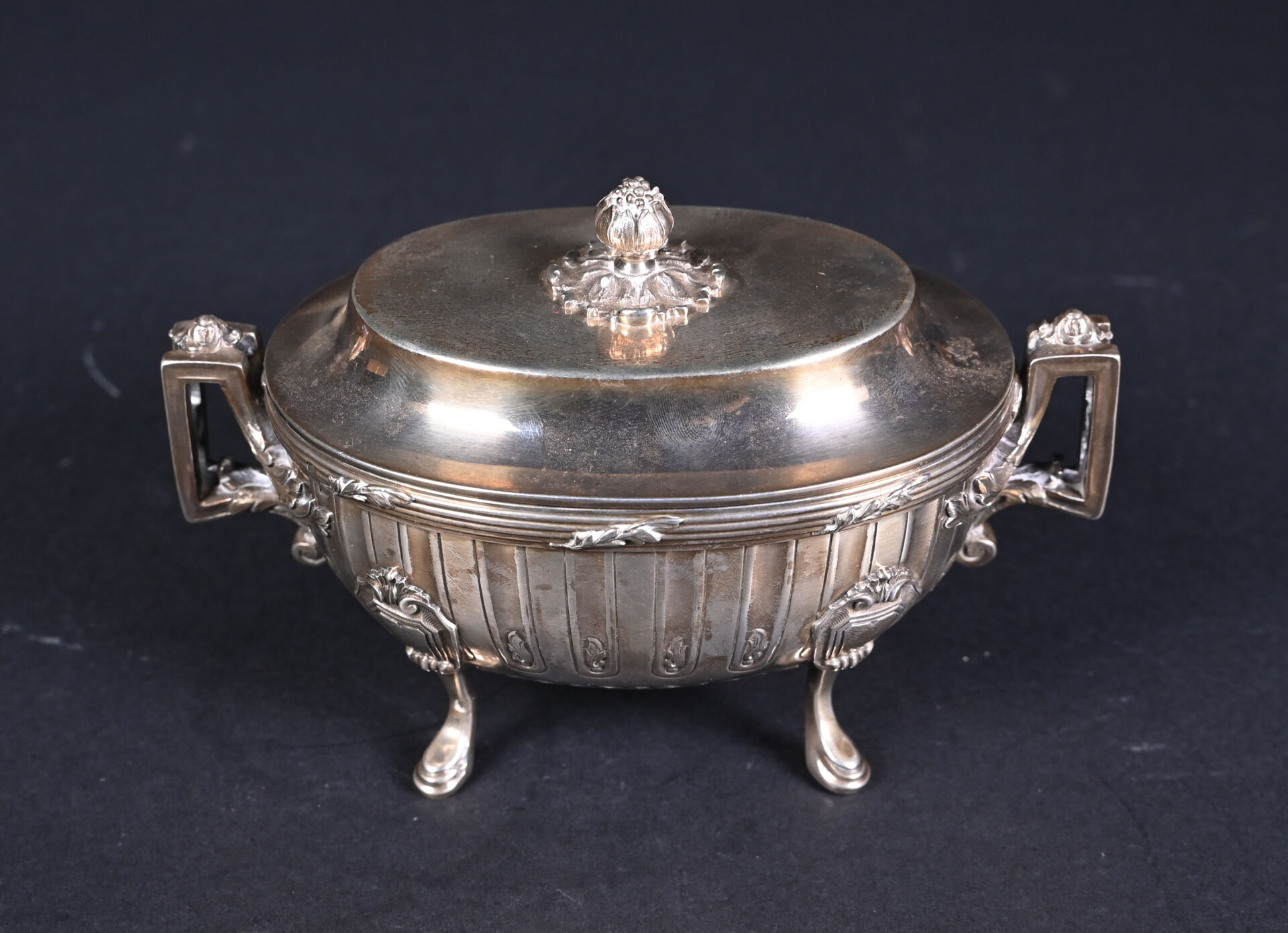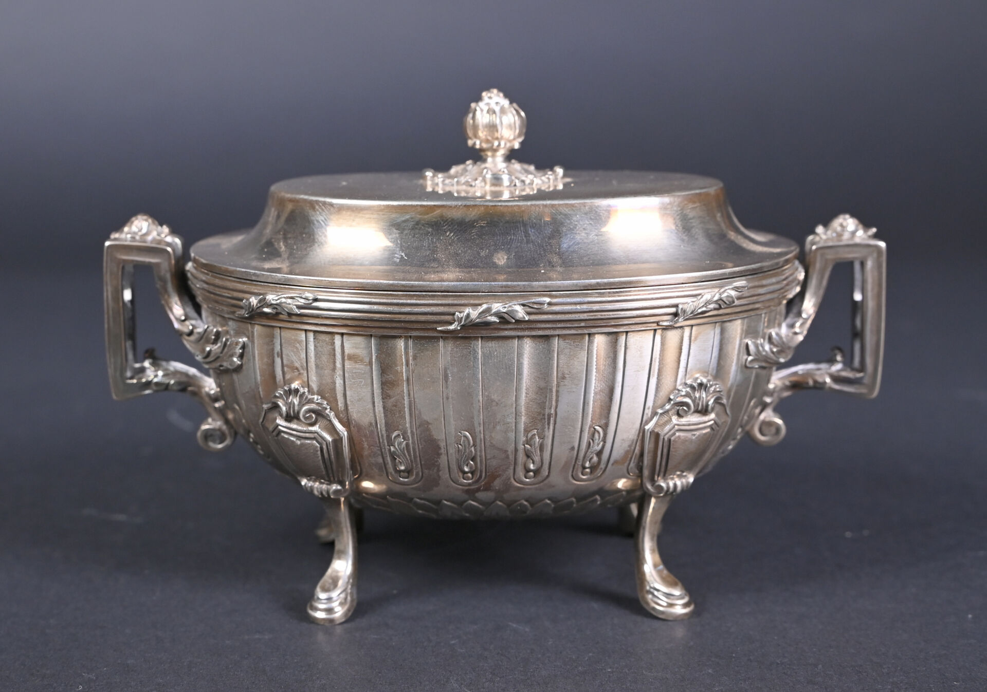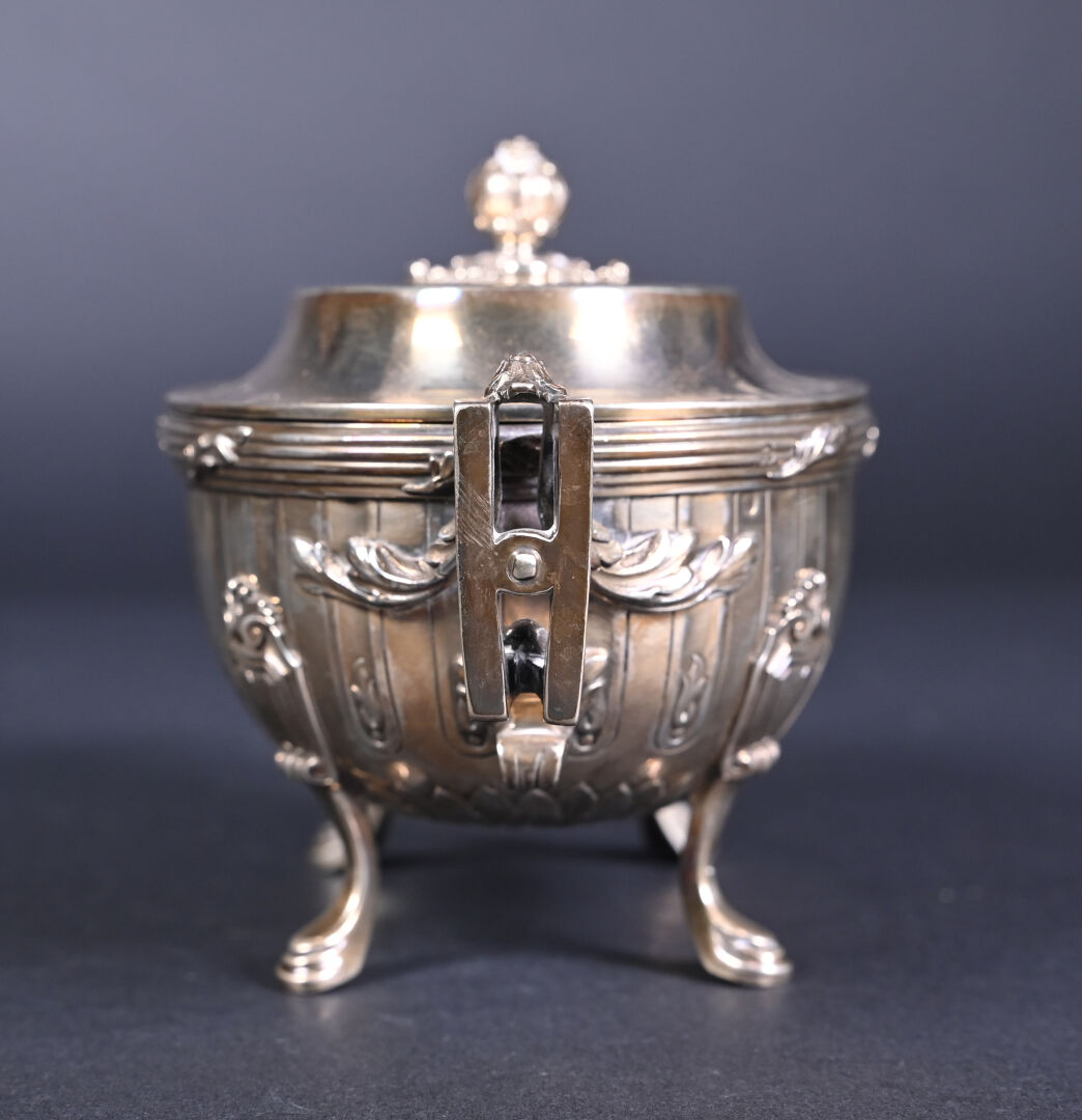 Pot à sucre en argent 925/1000e (poinçon minerve), La panse ornée de larges cannelures, les anses géométriques à la grecque, l’intérieur anciennement doré. La prise du couvercle ornée d’une grenade. Orfèvre CARDEILHAC. Poids : 493 g.