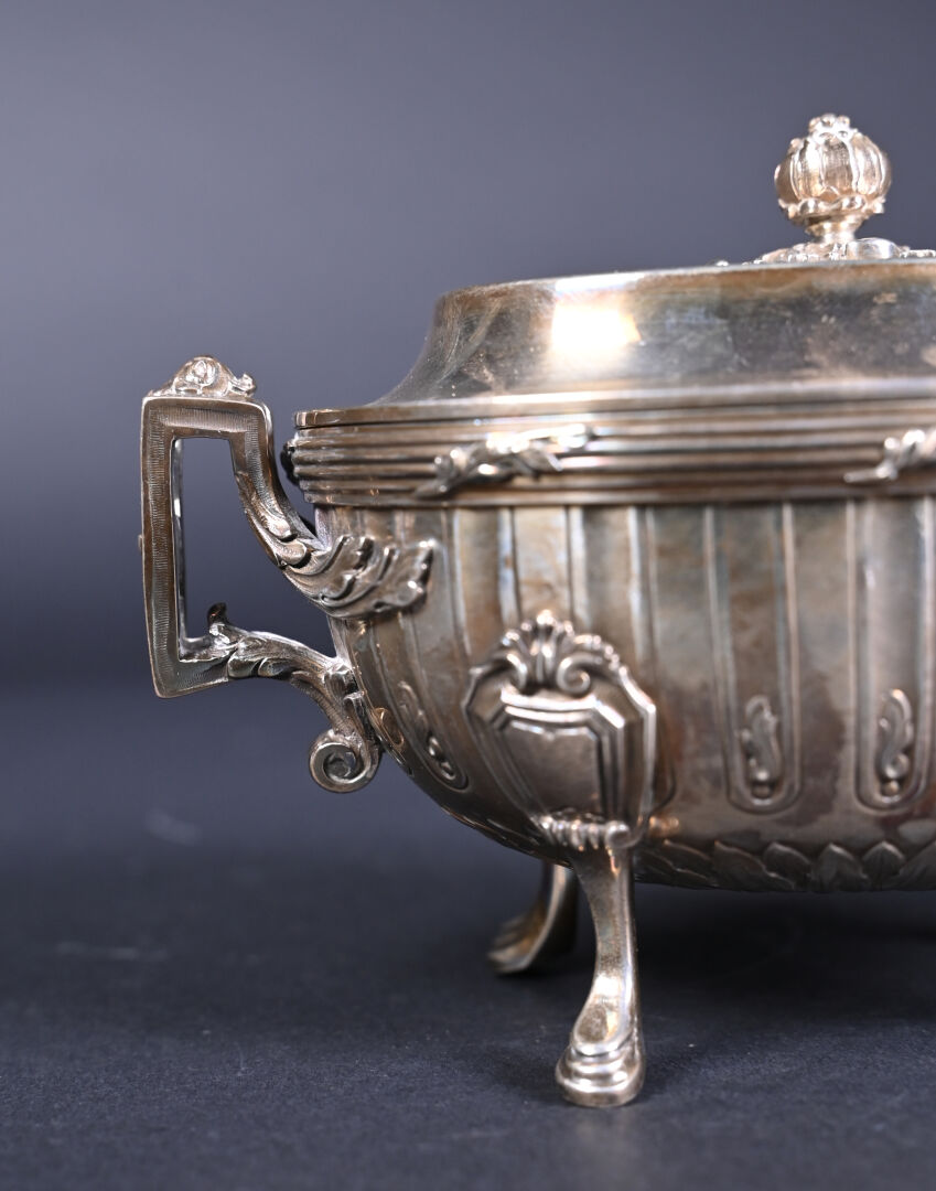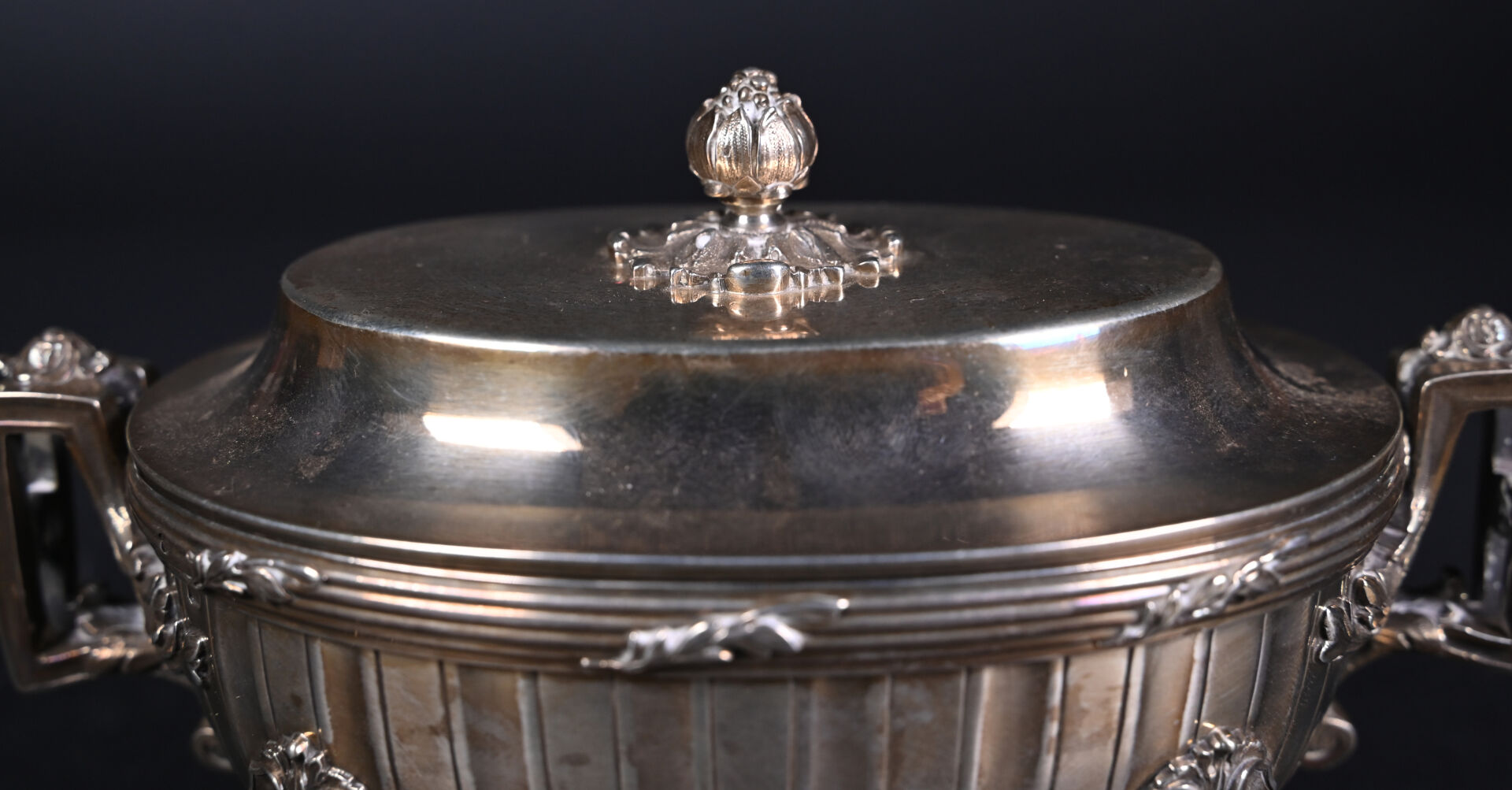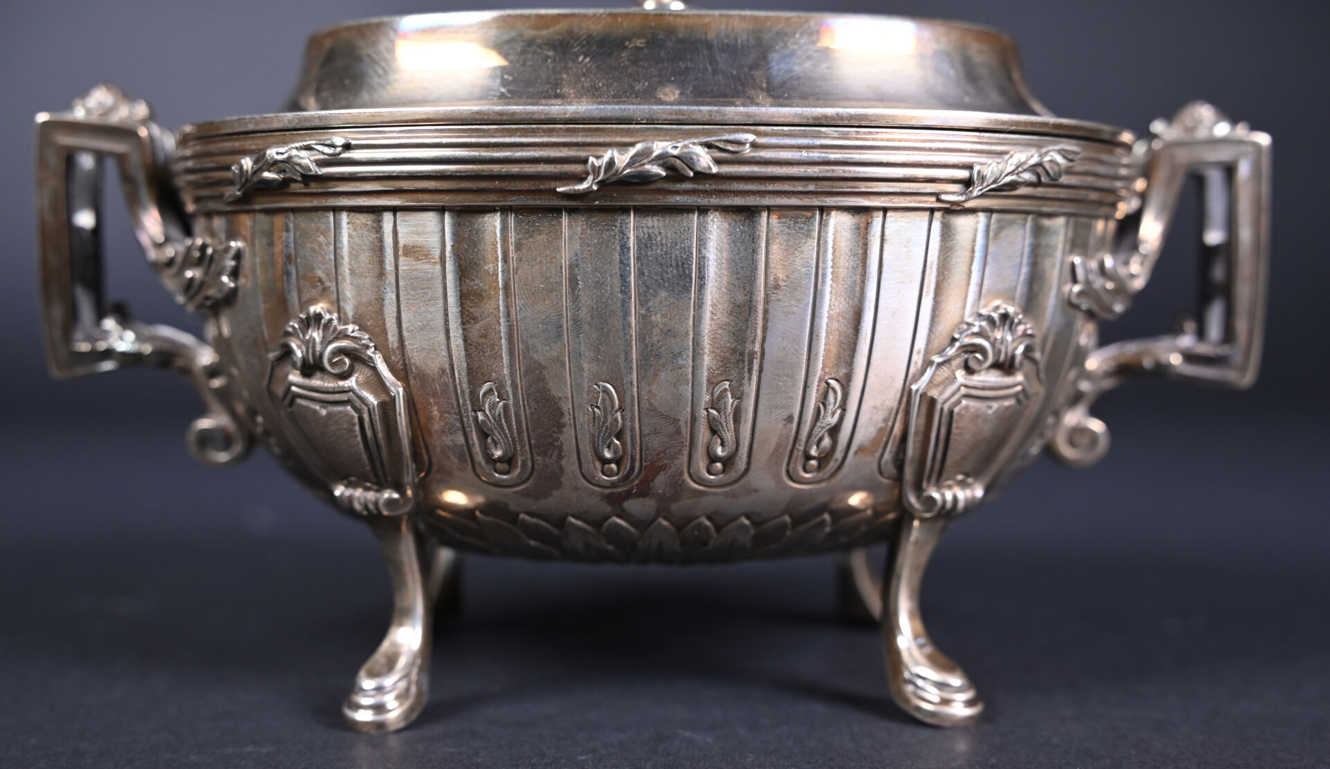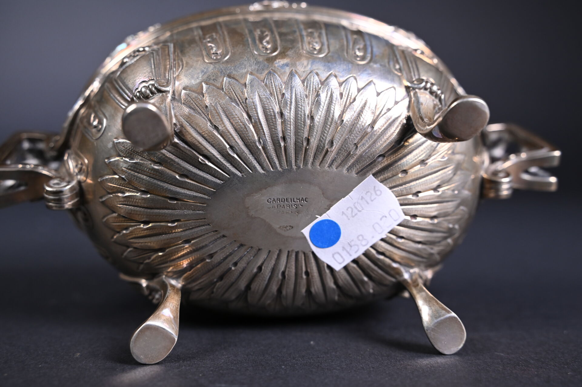 Pot à sucre en argent 925/1000e (poinçon minerve), La panse ornée de larges cannelures, les anses géométriques à la grecque, l’intérieur anciennement doré. La prise du couvercle ornée d’une grenade. Orfèvre CARDEILHAC. Poids : 493 g.
