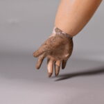 Poupée de fabrication française. Jumeau période SFBJ et numérotée 10 : bouche ouverte sur dents, yeux de sulfures bleus, corps composition articulé et tête de porcelaine avec un important accident sur le côté gauche. Long. : 60 cm. En état d’usage.