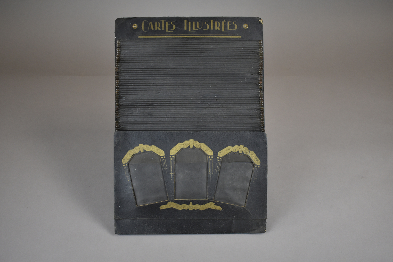 Présentoir à cartes postales en carton noir à motifs géométriques or. Vers 1910 / 1920.