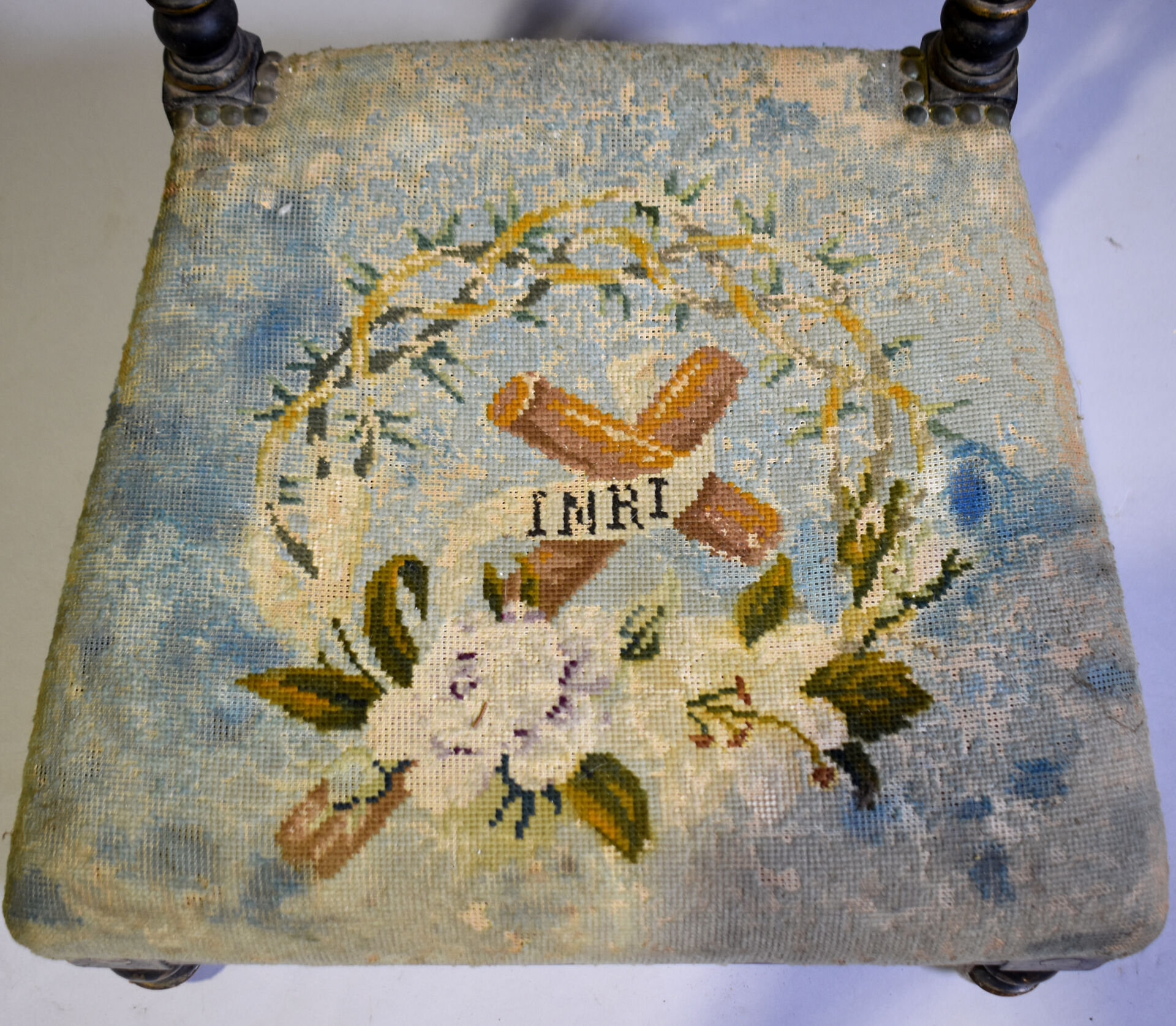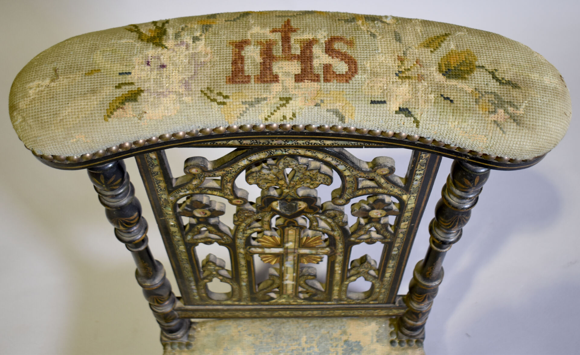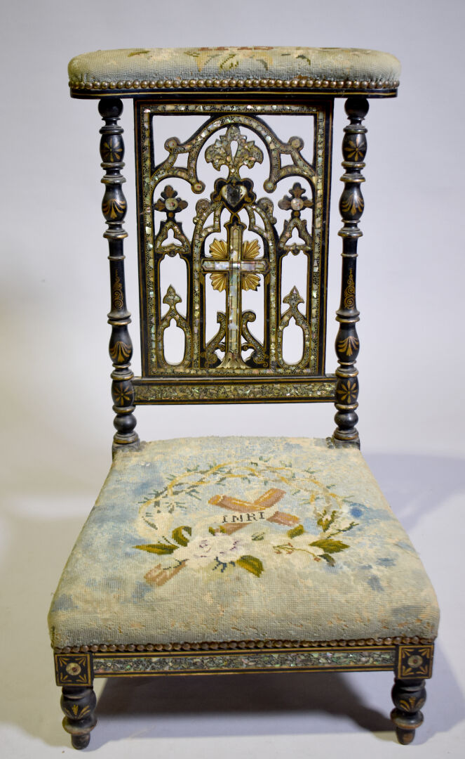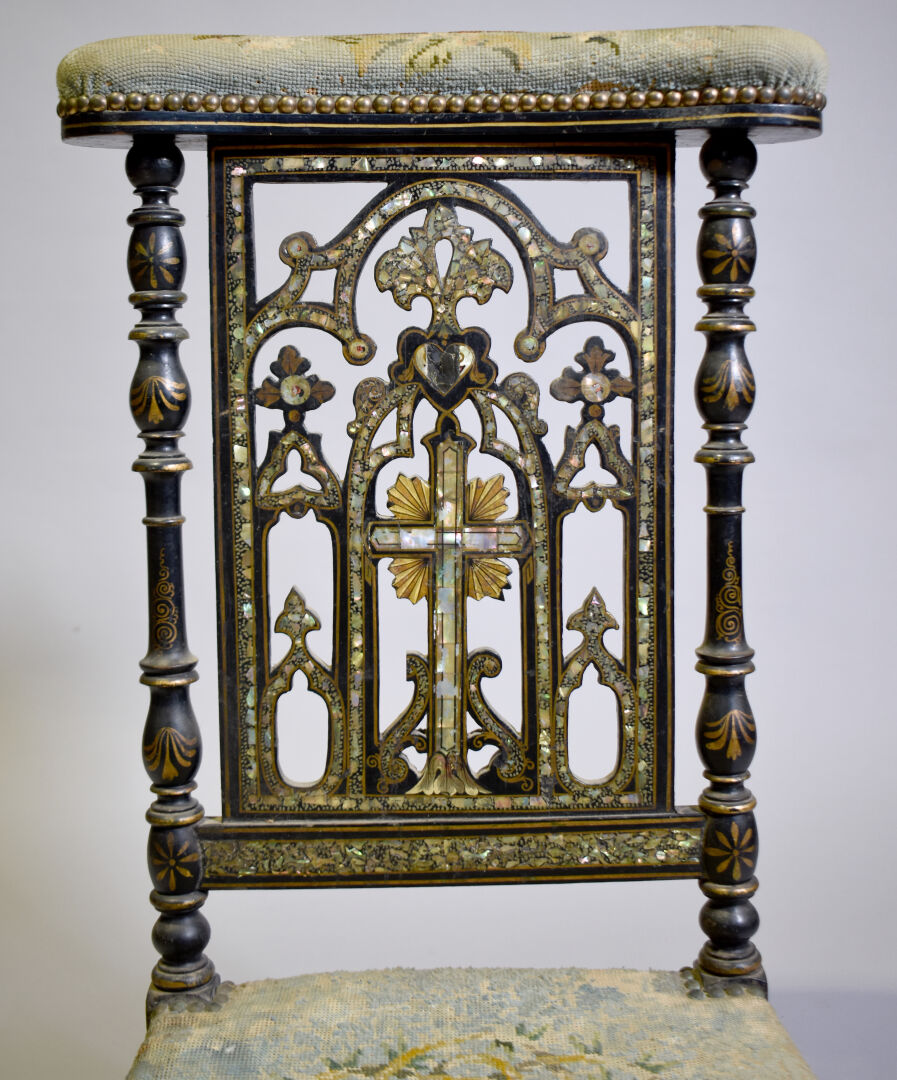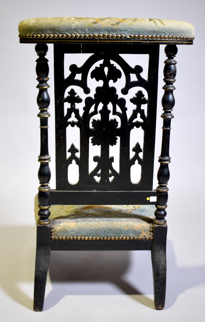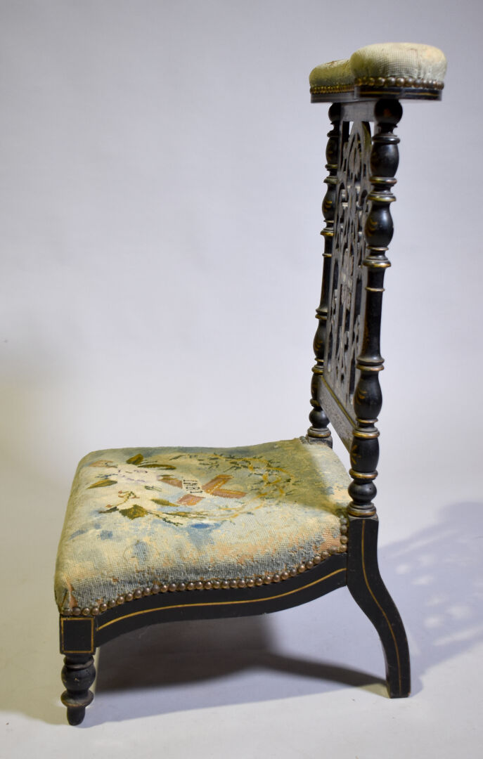 Prie-dieu en bois noirci à décor incrusté de burgaud, garniture de tapisserie au point (usures et manques). Epoque Napoléon III. Haut. : 89 cm.