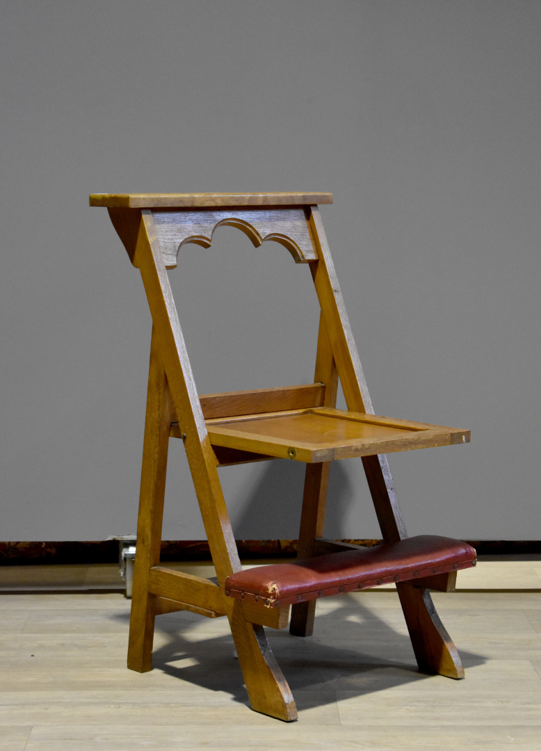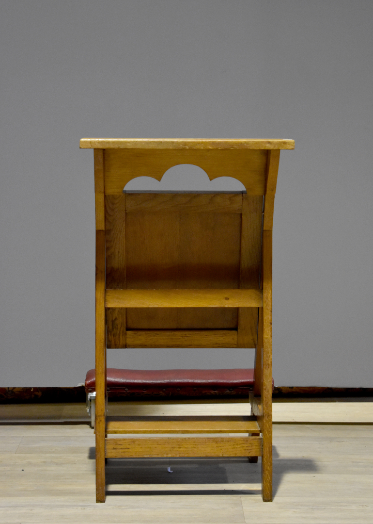 Prie-dieu en chêne, garniture de skaï rouge (usures). Travail allemand, seconde moitié du XXe siècle. Haut. : 84,5 cm.