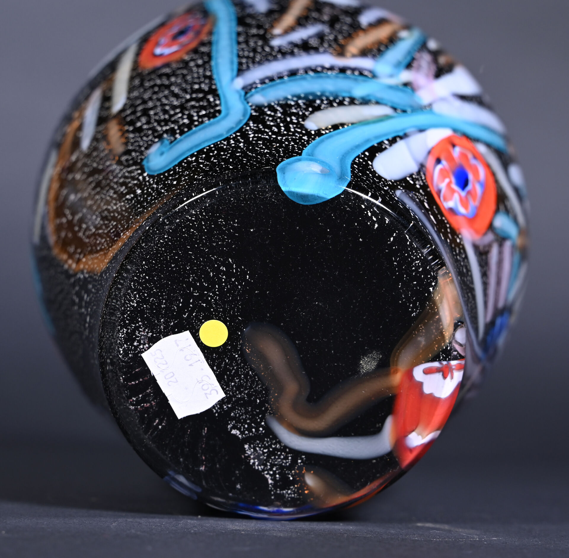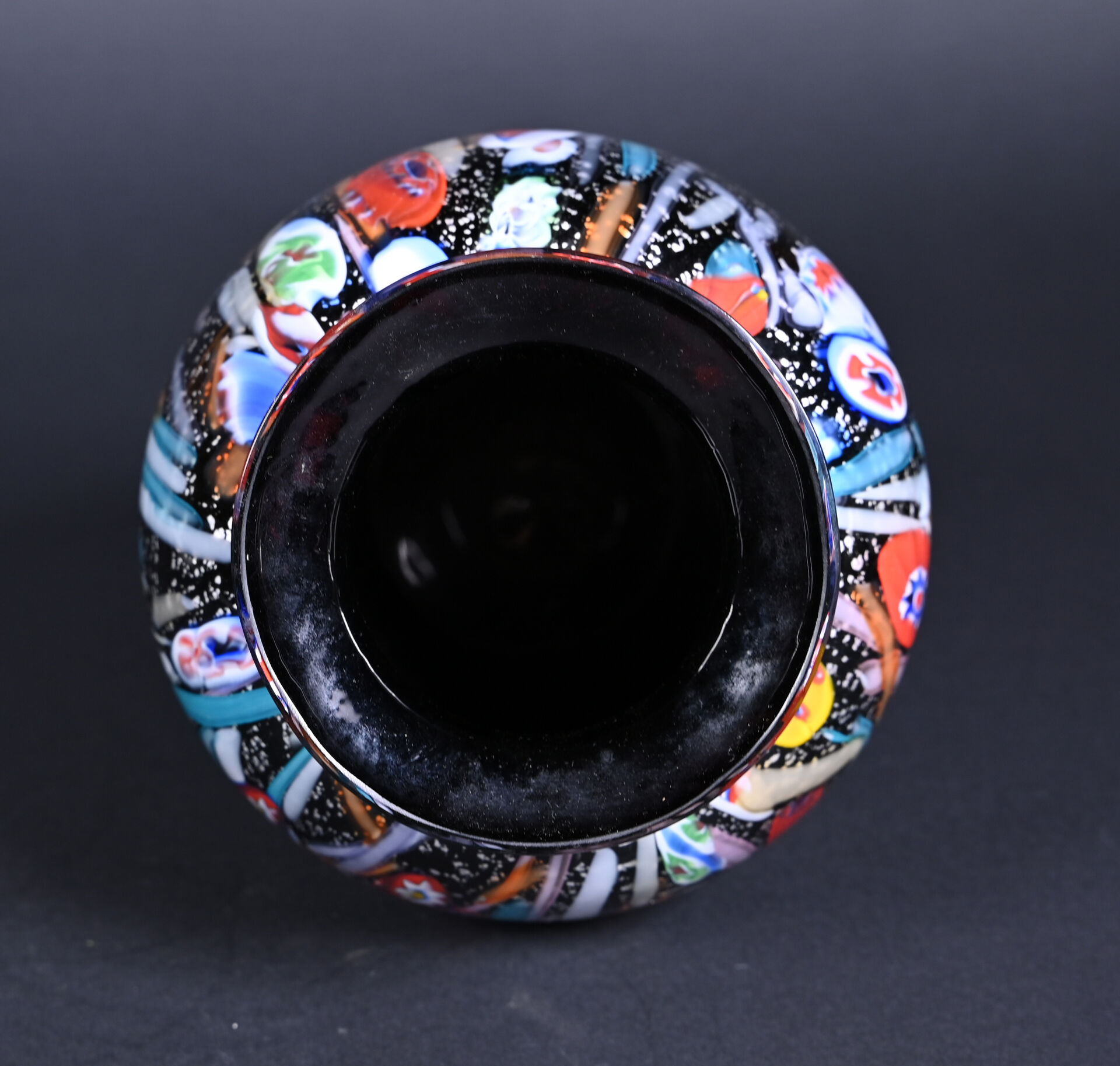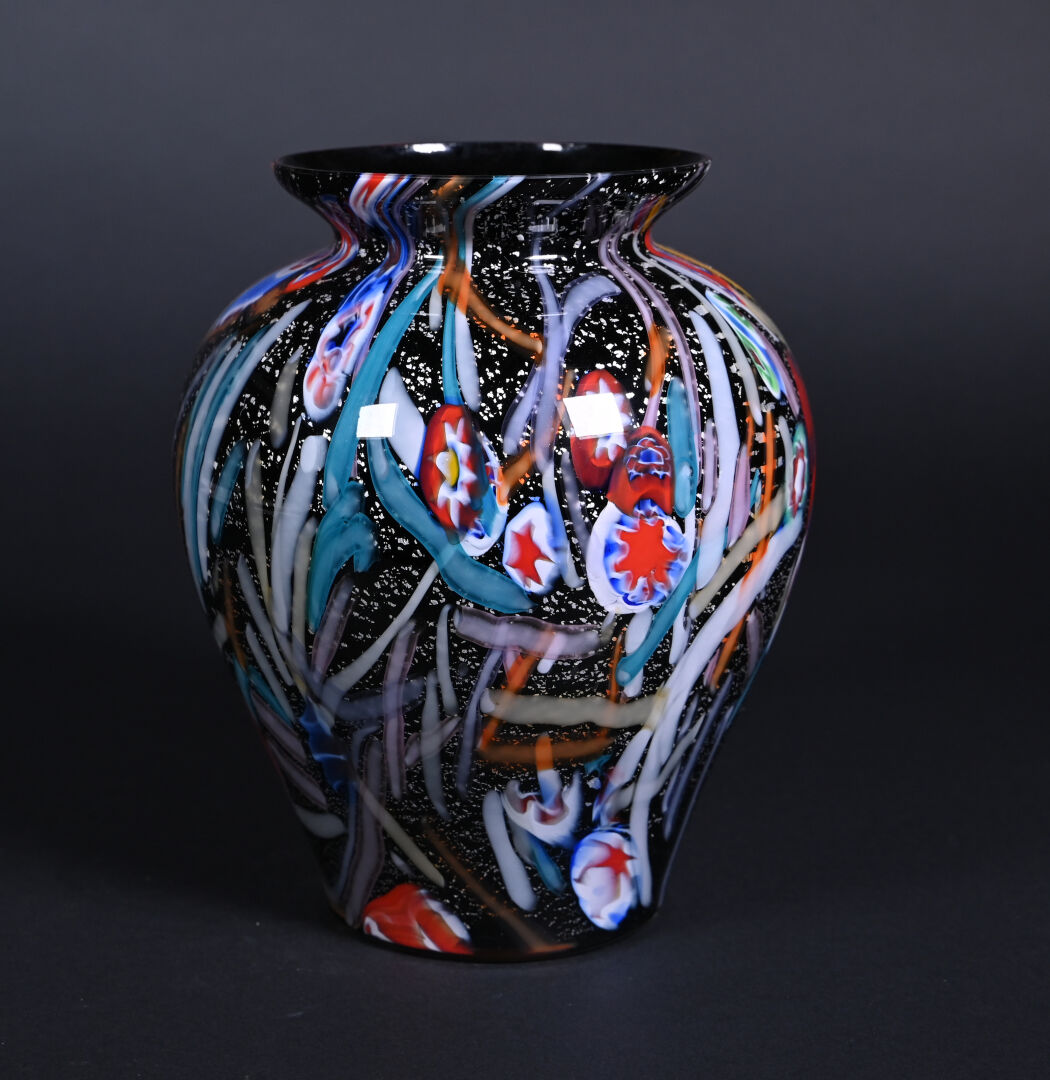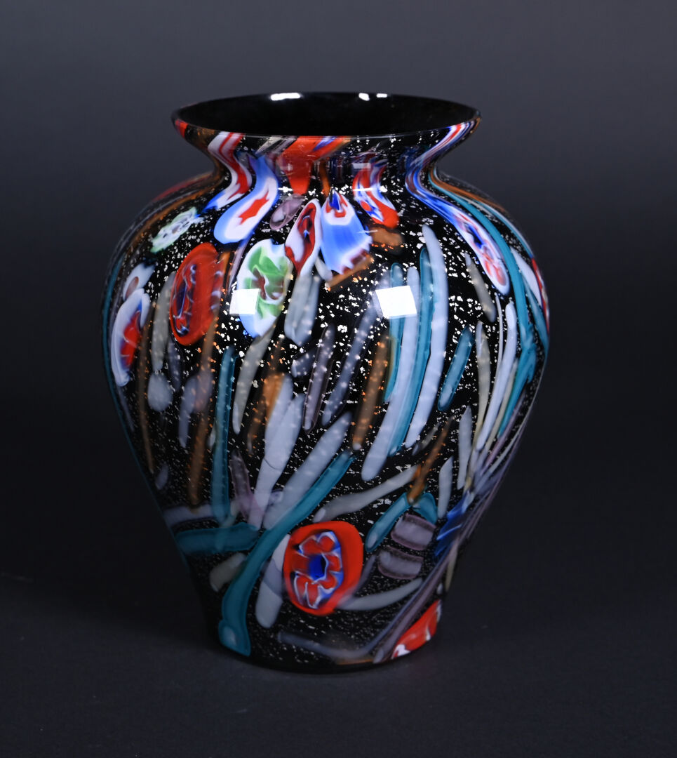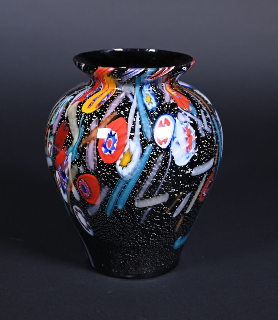 Probablement TOSO ou AVEM, Murano. vase balustre en verre à décor de rubans et murines sur fond noir et argent. Haut. :25 cm.