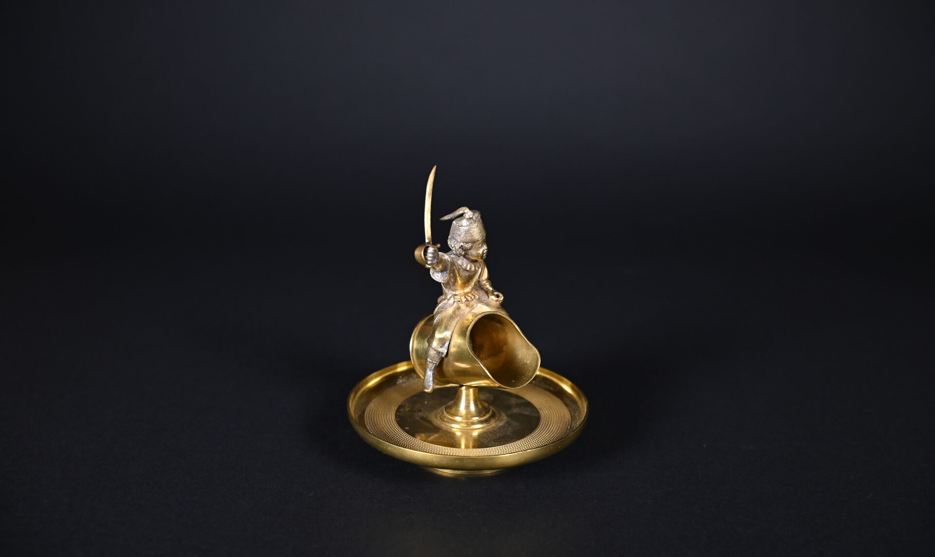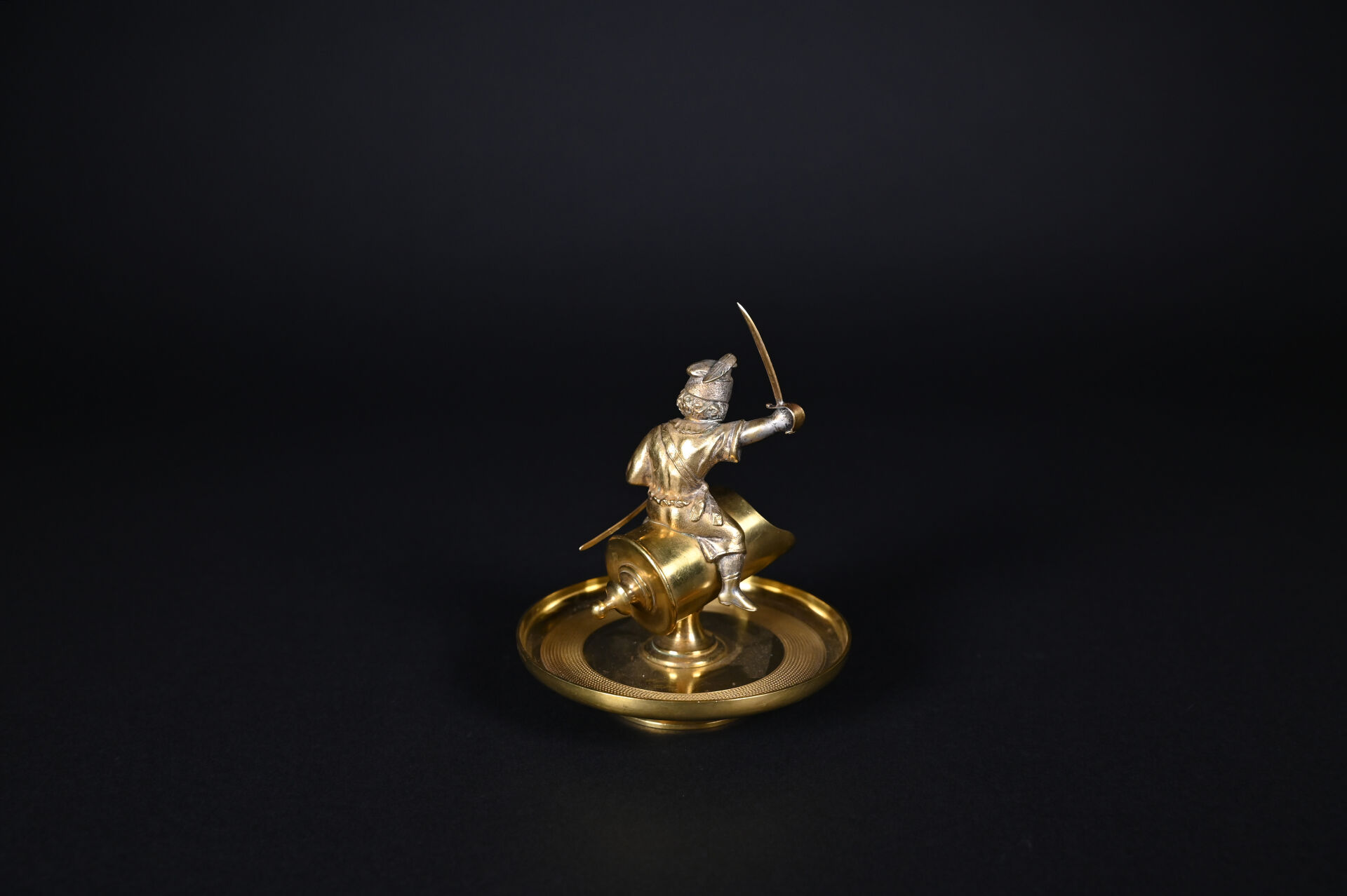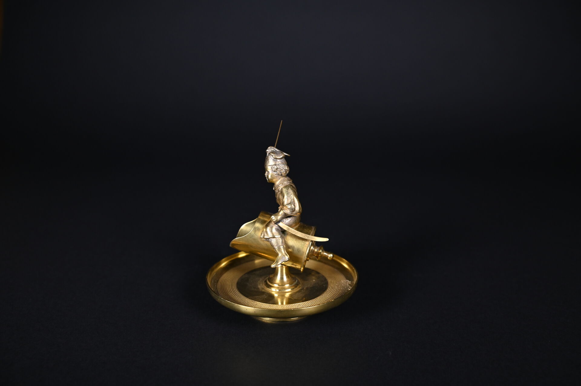 Pyrogène en métal à décor d’un enfant costumé brandissant un sabre. Haut. : 13,5 cm.