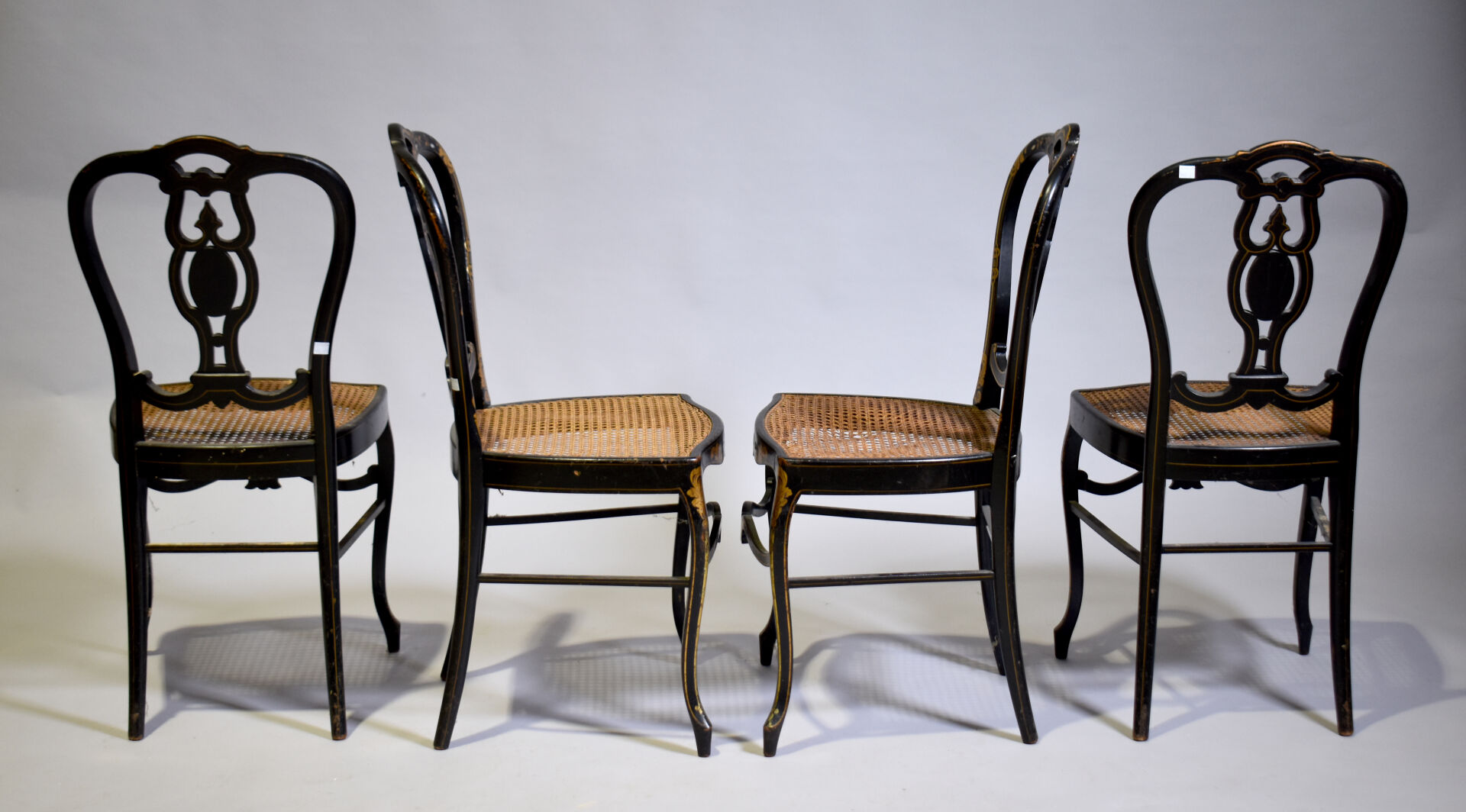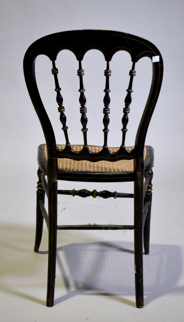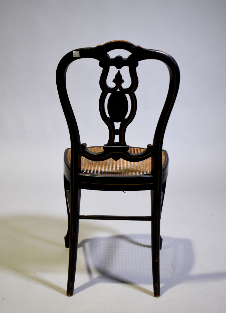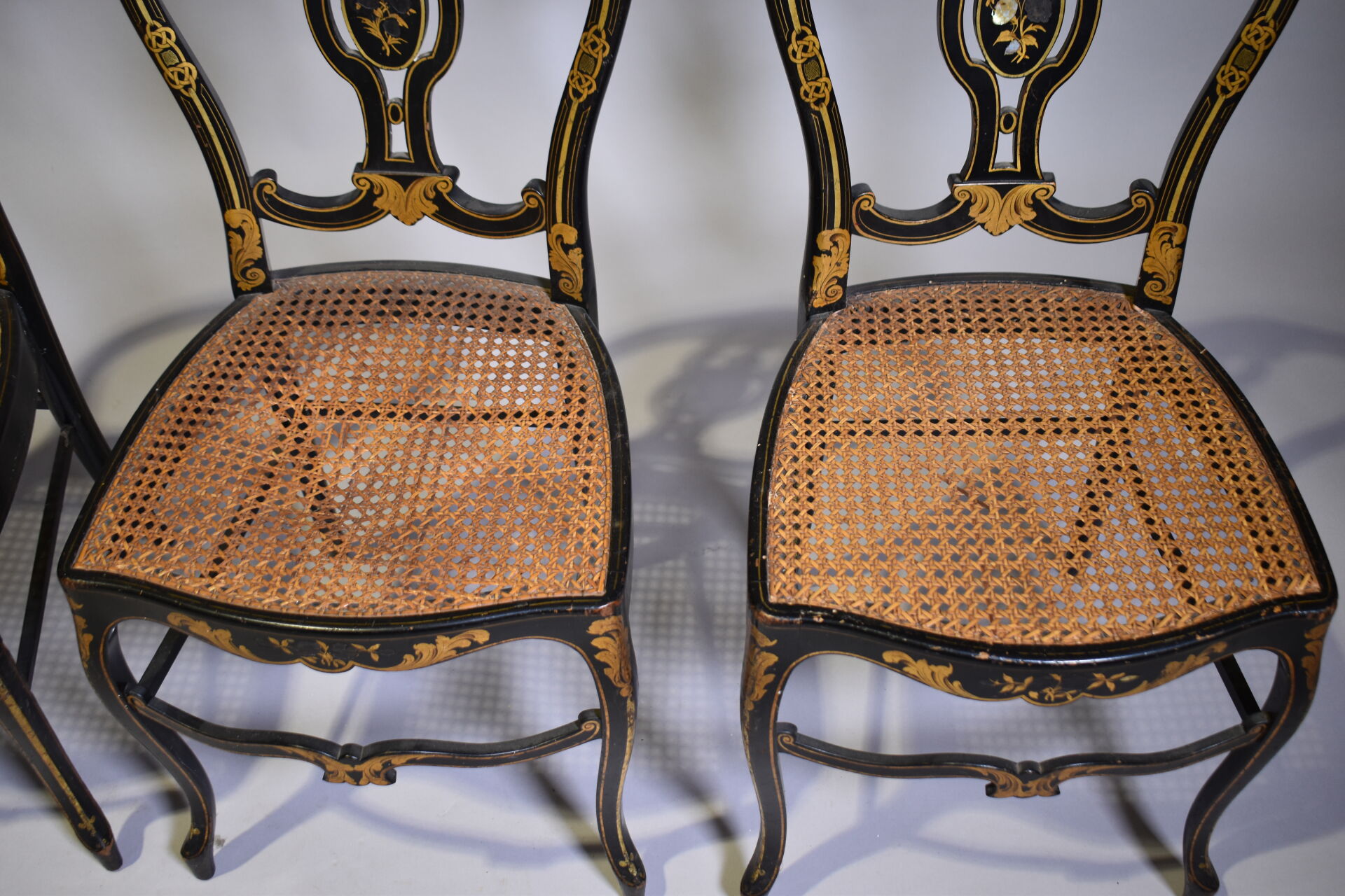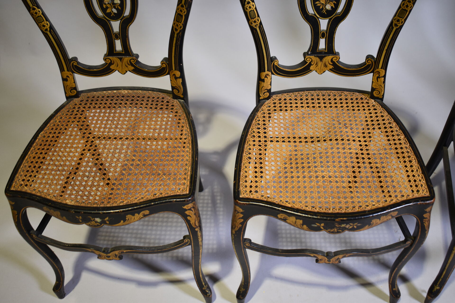 Quatre chaises en bois noirci à décor en dorure et incrustations de nacre, les assises cannées (enfoncements, petits manques et usures). Epoque Napoléon III. 85 cm. On en joint une cinquième à assise cannée. Haut. : 87 cm.